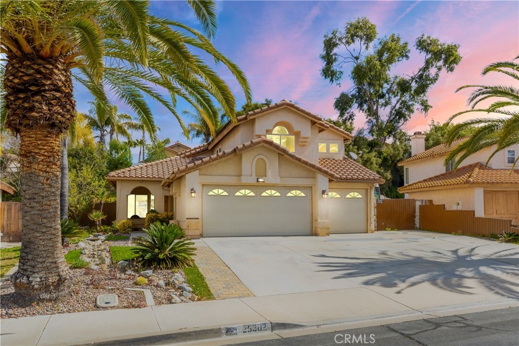 This Alta Murrieta home offers numerous attractive features, such as solar panels and a fifth bedroom with an ensuite bath on the ground floor. The front yard features well-kept landscaping with vibrant greenery and two prominent palm trees. The expansive backyard, measuring 10,890 square feet, provides plenty of space for personal touches, including a potential pool. It also has a landscaped slope with mature shrubs and trees, plus a sprinkler system for easy upkeep. Unique benefits include RV parking and a concrete slab in the backyard, accessible via a gate. The large concrete patio and grassy area are ideal for outdoor activities. Located conveniently near Murrieta Hot Springs/15 and Clinton Keith/215, the home offers a bright living and dining area with high ceilings and a chandelier. The kitchen features white cabinets, granite countertops, and a checkered backsplash, leading to a cozy family room with laminate floors and a granite fireplace. The home includes a recently upgraded bathroom on the lower level, a laundry room with garage access, and a luxurious master suite upstairs with a jet tub and walk-in closet. Three more bedrooms and a bathroom complete the upper floor. This property is free from HOA fees and is close to shopping centers.