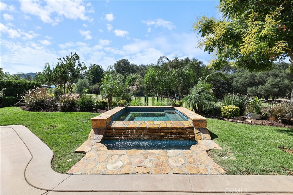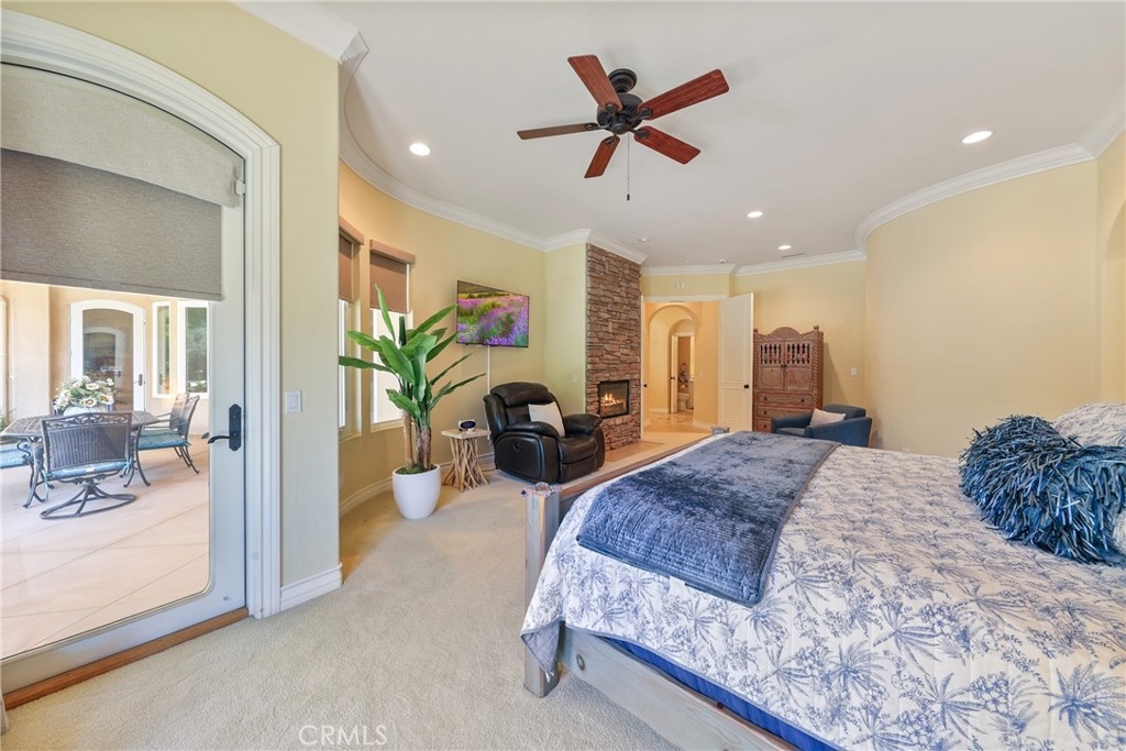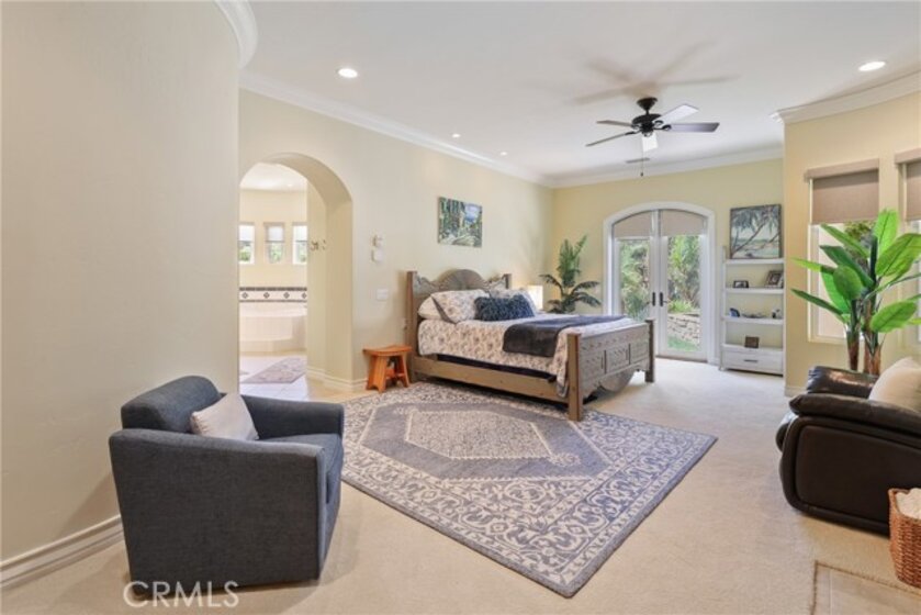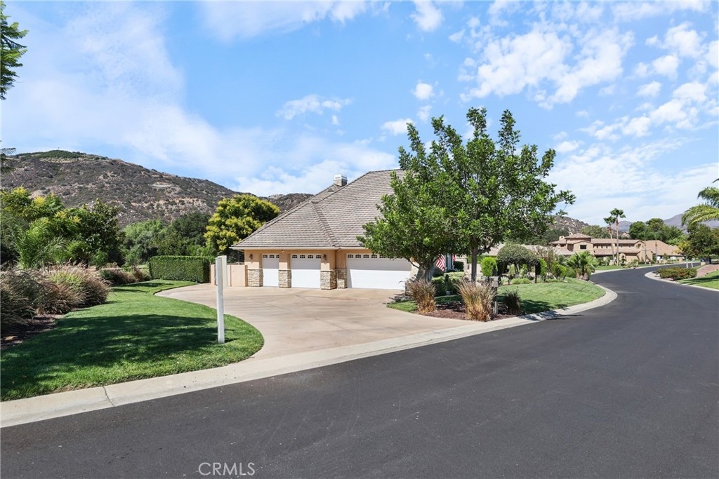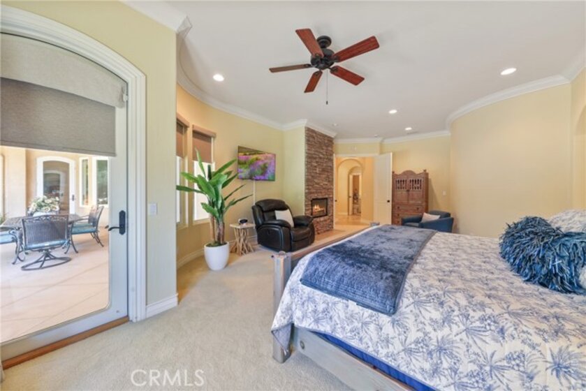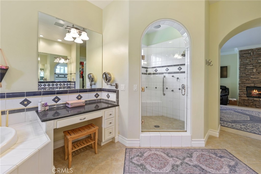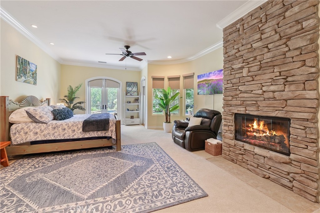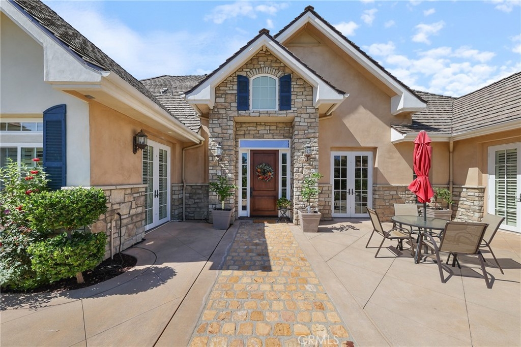 Tucked away on a serene cul-de-sac, this single-story French Provençal estate blends timeless architecture with modern luxury. Rare offering of elegance and lifestyle in the prestigious Bear Creek Community. Framed by graceful oak trees and sweeping hillside views, the home offers 4 bedrooms, 4.5 bathrooms, and exquisite living spaces designed for both comfort and elegance. Inside, the heart of the home is a chef’s kitchen featuring a center island, 6-burner range with griddle, double ovens, granite counters, and a walk-in pantry. The adjoining family room dazzles with a stone fireplace and a picture window that captures the beauty of the natural landscape. The primary suite is a private retreat with its own fireplace, French doors leading to a secluded jacuzzi, and a spa-inspired bath with soaking tub, dual sinks, vanity, walk-in shower, and expansive closet. Each additional bedroom enjoys its own en-suite bath, with two opening onto a charming courtyard. Outdoors, private patios and a welcoming front courtyard invite relaxation and entertaining, while a resort-style spa with stone and waterfall features completes the setting. An oversized 3-car plus golf cart garage with epoxy floors, along with a fully paid solar system, ensure convenience and efficiency.