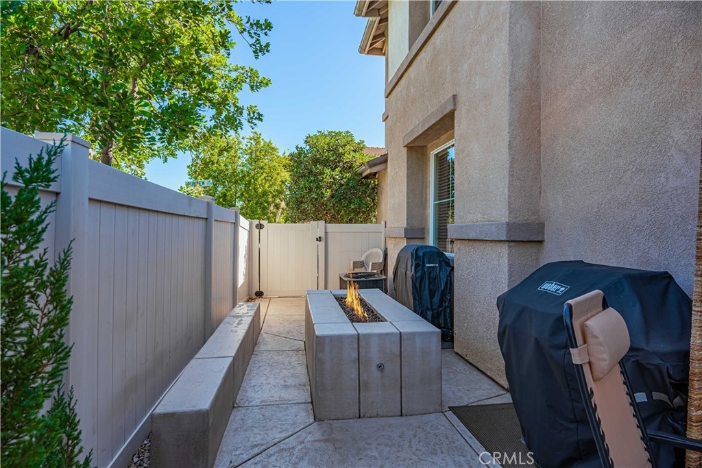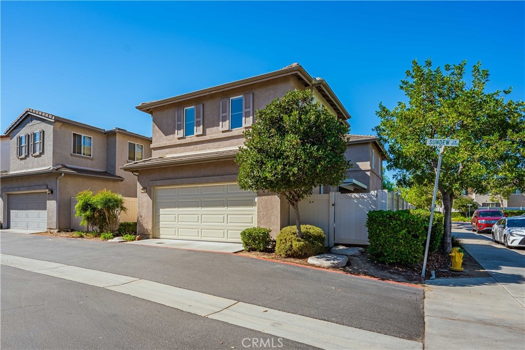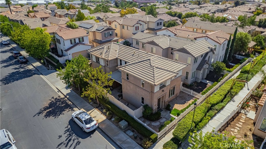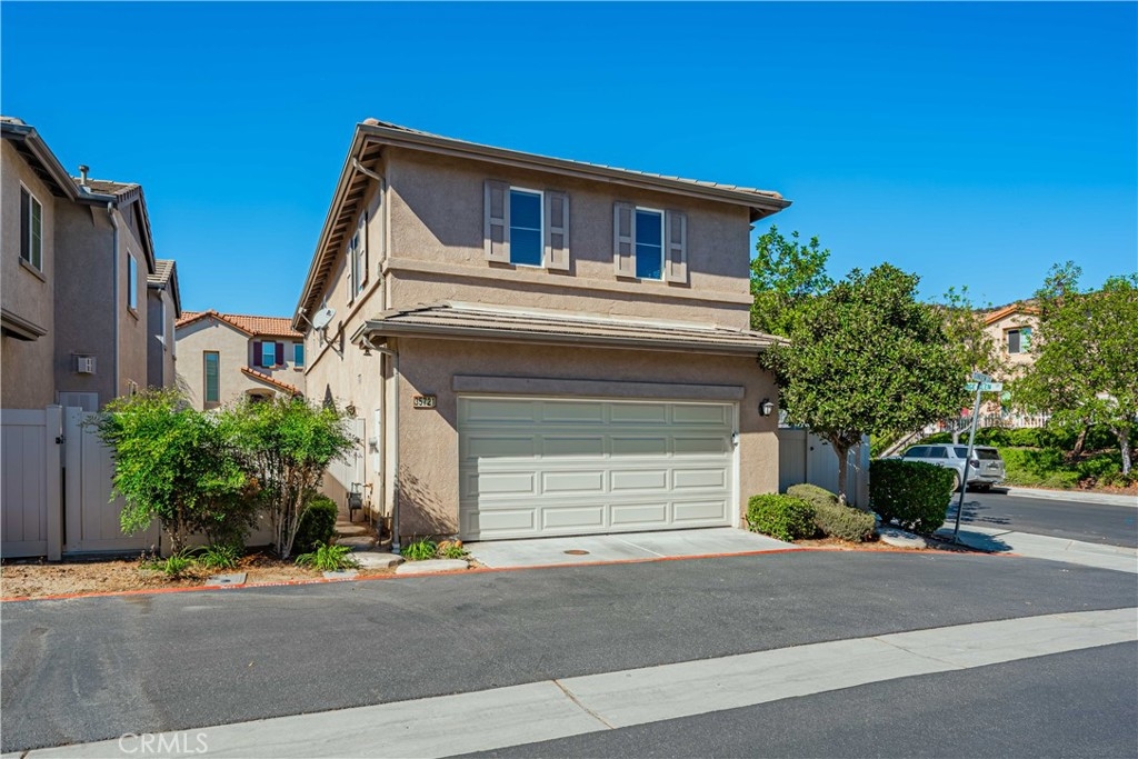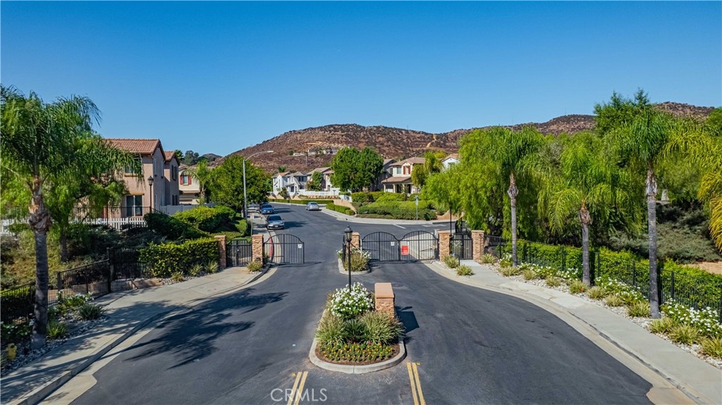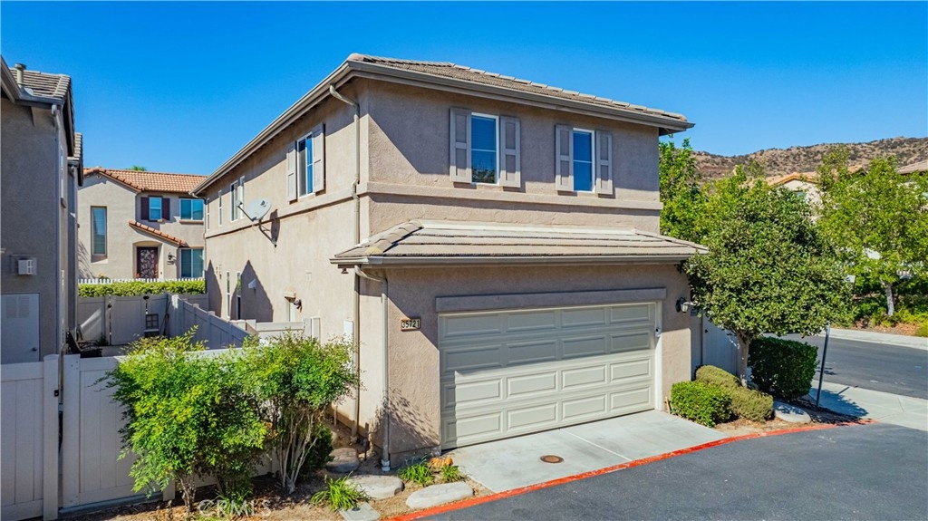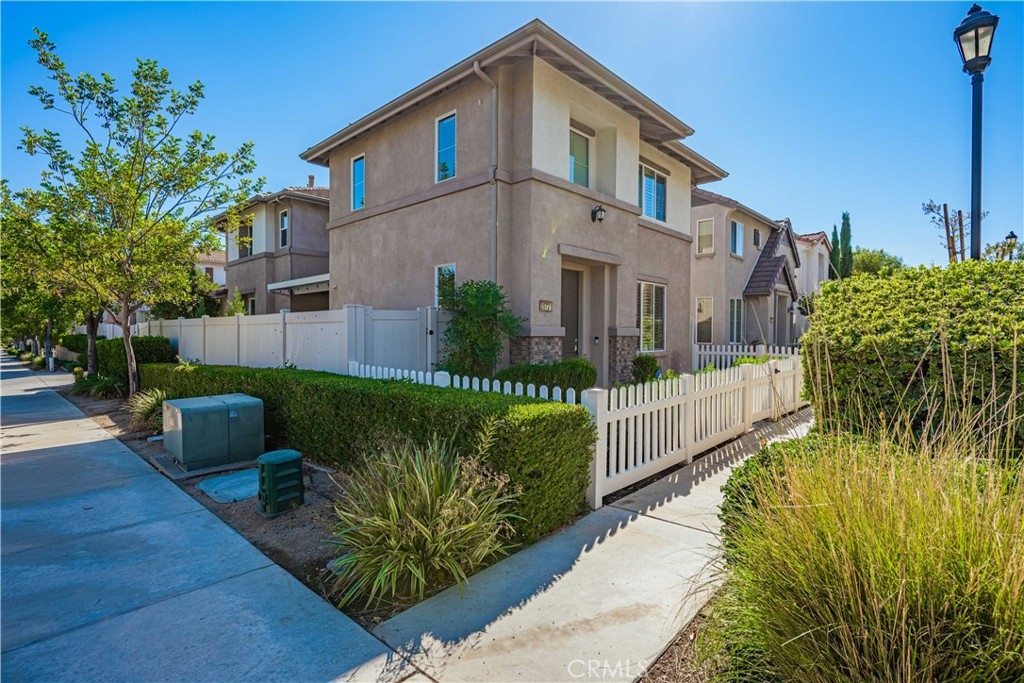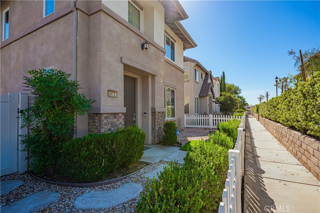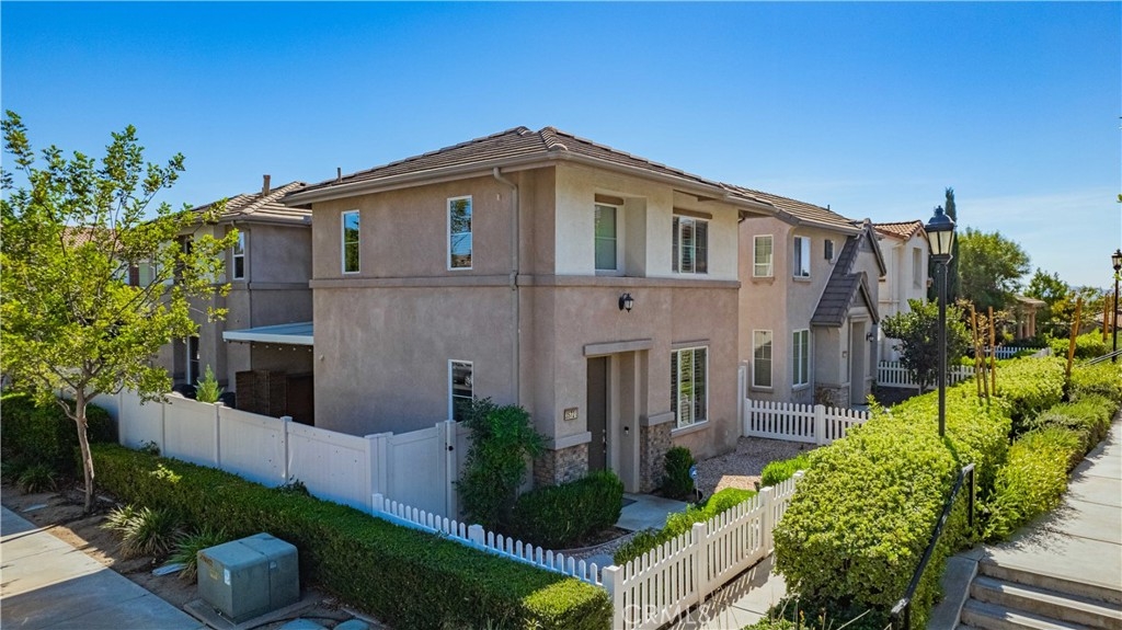 Welcome to the Gated Community of Bel Flora in the heart of Murrieta. This Charming single family home offers a warm inviting atmosphere with an open floor plan, hardwood floors, cozy fireplace complemented by stylish shutters. The spacious kitchen features a center Island with granite, 4 burner stove and newer black stainless fridge and dishwasher. It's a perfect area for cooking and entertaining. Step outside to a cozy patio with a built in fire pit, waterfall, covered sitting area, ideal for relaxing and entertaining year round. Upstairs you'll find 3 bedrooms, including the primary suite that offers a walk in closet for all your storage needs. The primary bath is equipped with a soaking tub, walk in shower, and dual sinks. All bedrooms have carpet and wood blinds, and walk in closets. The attached 2 car garage with direct access provides ample storage with built in shelves for organization. A small front yard with a classic white vinyl picket fence adds to the curb appeal and charm. This home is conveniently located within walking distance to the association pool and spa, and outdoor picnic area adding easy access to relaxation and recreation. The community provides a safe and serene environment, enhanced with a playground, sidewalks, street lights, and plenty of parking. Beautifully landscaped with abundant trees and lush foliage. Close to shopping, schools, 215 Freeway, Costco, and lots of new restaurants. Has an EV charger in the garage for an electric vehicle.