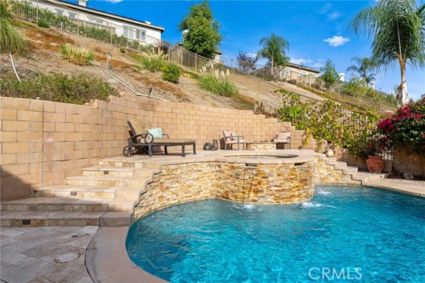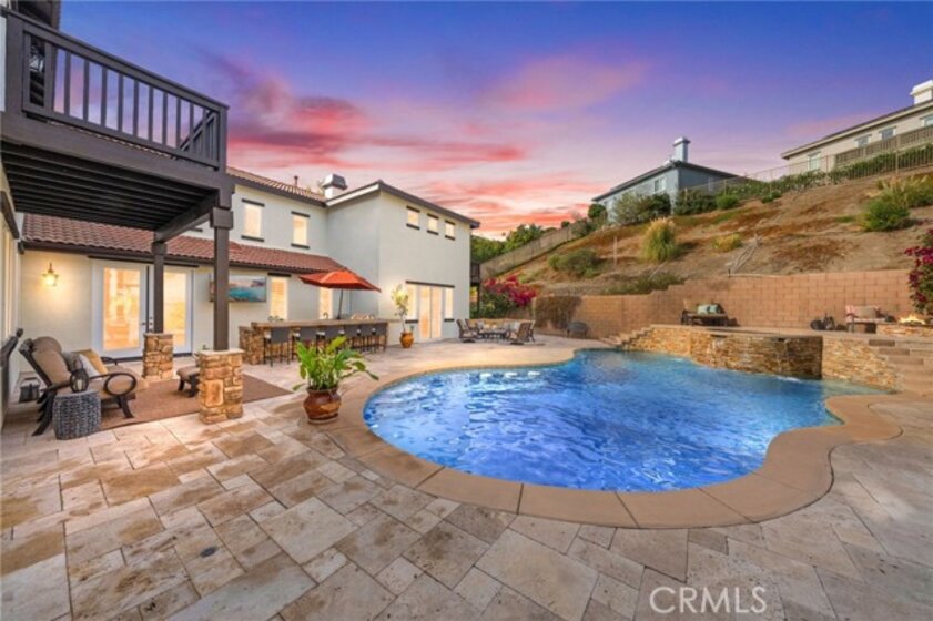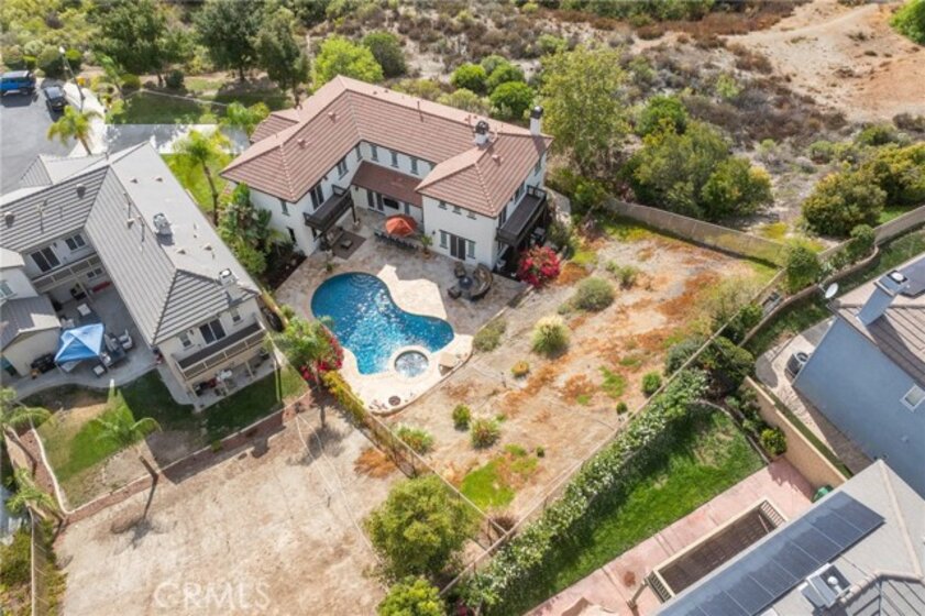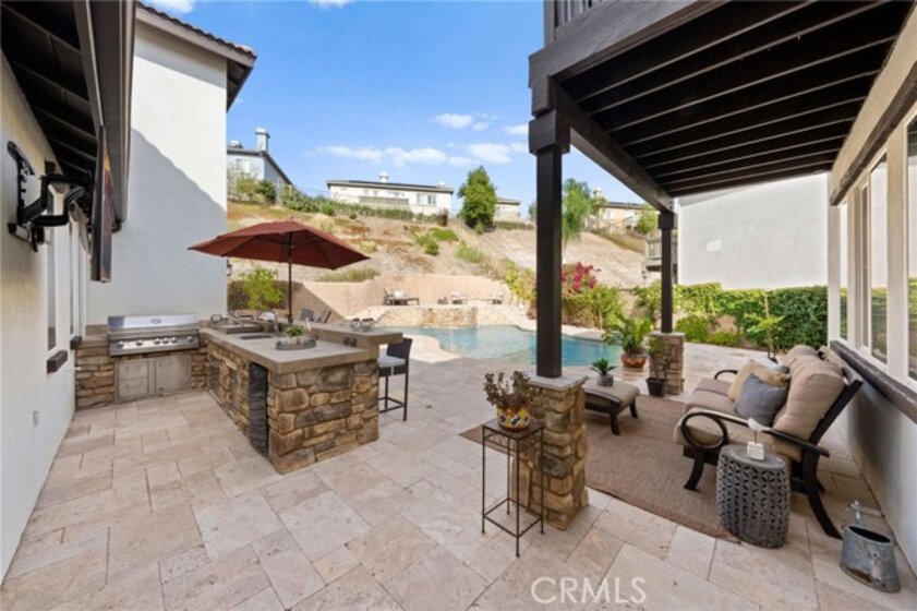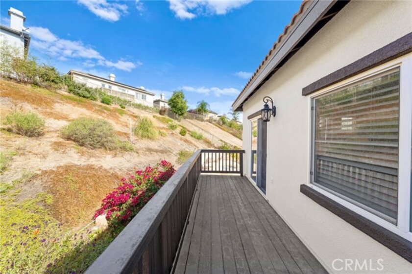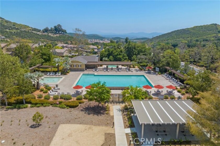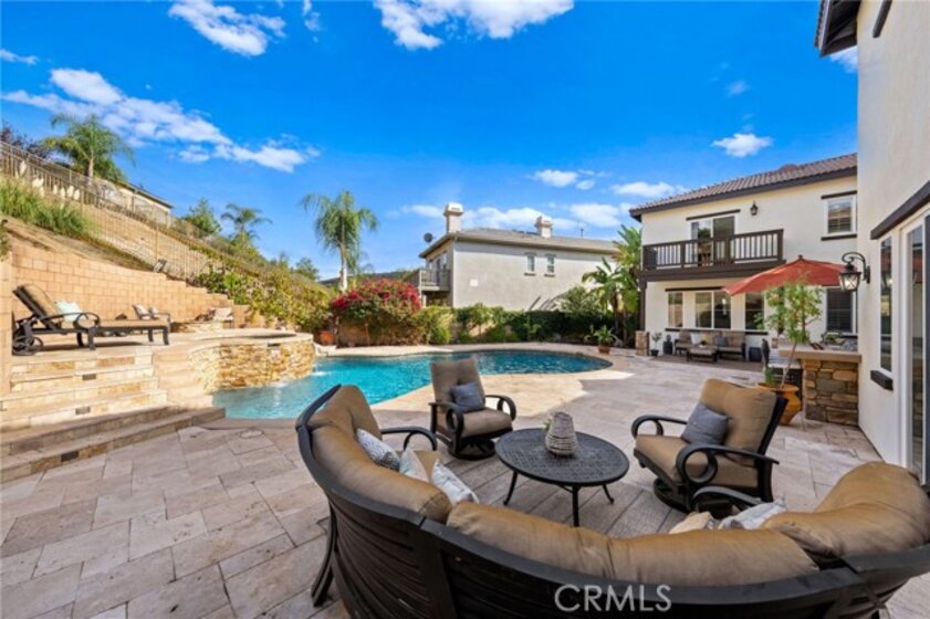 This RARE GEM sits at the end of a CUL-DE-SAC, offering unparalleled PRIVACY with no neighbor on the left—just tranquil, open preserve space. The moment you approach, the STUNNING CURB APPEAL, complete w/ brand-NEW EXTERIOR PAINT & a long driveway, makes a grand first impression. The charming front porch invites you to step inside, where soaring 2-story ceilings greet you w/ elegance & spaciousness.The MAIN FLOOR features a PRIVATE BEDROOM w/ new carpeting & plantation shutters, along w/ a full bath showcasing a WALK-IN SHOWER & updated lighting—perfect for guests. The living room is bathed in natural light from numerous windows & accented w/ crown molding, while the dining room opens directly to the backyard through French doors. At the heart of the home, the family room & kitchen shine in an open-concept layout. Cozy up to the gas FIREPLACE in the family room, complete w/a sophistacted audio system, PLANTATION SHUTTERS & ceiling fan, or gather around the large eat-in island in the kitchen. Granite counters, maple cabinetry, SS appl.,& a built-in desk make this kitchen both functional & beautiful. The adjacent butler's pantry w/walk-in pantry connects to the dining room, adding convenience for hosting.Upstairs, a SPACIOUS LOFT w/ a built-in desk area for 2 opens to a BALCONY overlooking your private oasis—a sparkling saltwater pool & spa surrounded by lush tropical landscaping. 3 secondary BR, 1 w/ its own attached BA w/dual sinks, provide ample space for family or guests. Down the hall, the primary suite offers serenity w/its own FP, private balcony, & a luxurious en-suite BA featuring dual sinks, a jetted tub, & a lg. walk-in shower. Step outside to experience an ENTERTAINER'S PARADISE. The backyard boasts a SALTWATER POOL, RAISED SPA, gorgeous TRAVERTINE PATIO, a built-in BBQ complete w/ seating, fridge, & side burners, + a FIRE PIT perfect for evening gatherings. Pockets of seating are nestled throughout the yard, creating a RESORT-LIKE ATMOSPHERE. A state-of-the-art outdoor video & audio system, including 4 rock speakers & a mounted 65-inch TV w/ Wi-Fi, enhances your outdoor experience. A 3-car tandem garage provides ample storage & parking.Greer Ranch offers 24-hour security, a community pool, clubhouse, parks, walking trails, family-friendly events, & more. Conveniently located near both the 215 &15 freeways, top-rated Murrieta schools, shopping, Old Town Murrieta, & Temecula wineries, this home combines luxurious living w/ an unbeatable location.