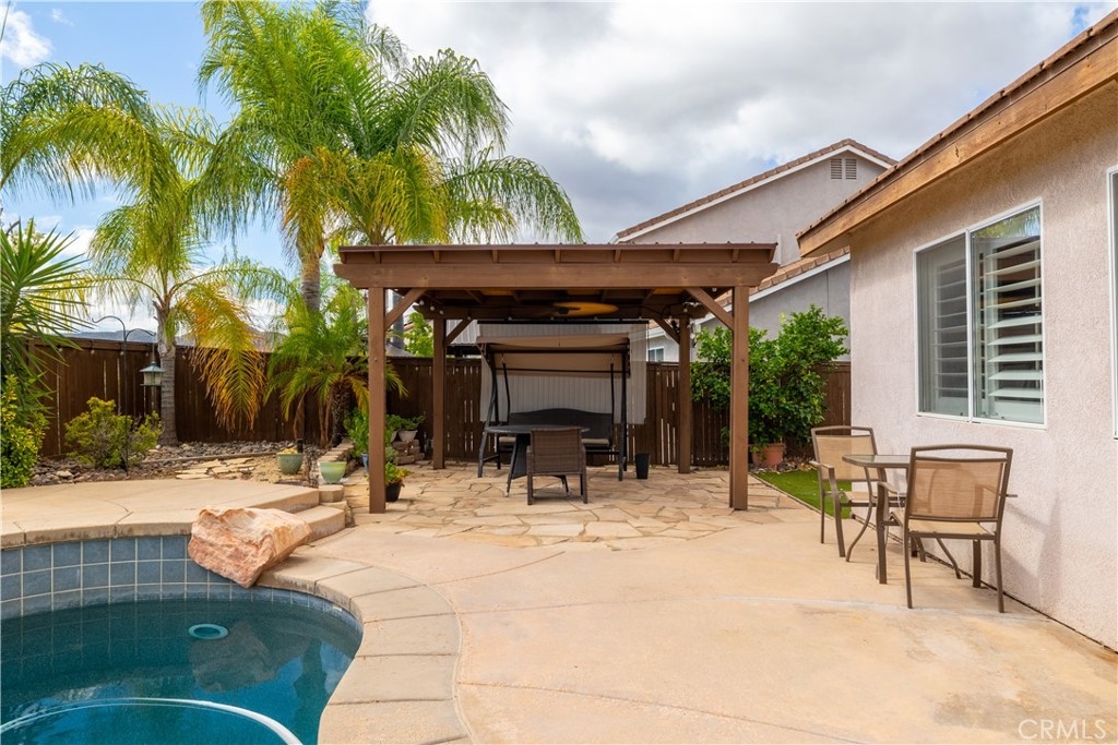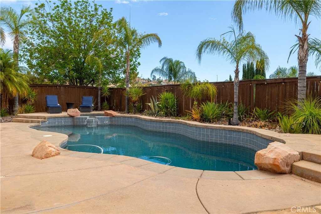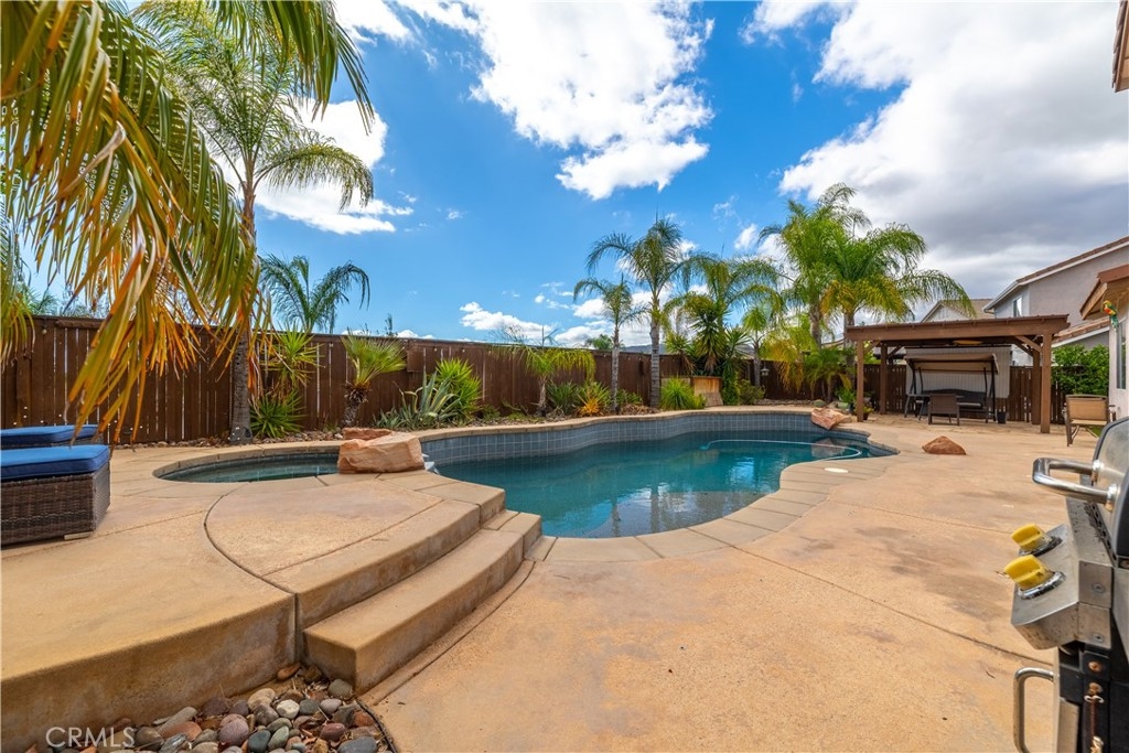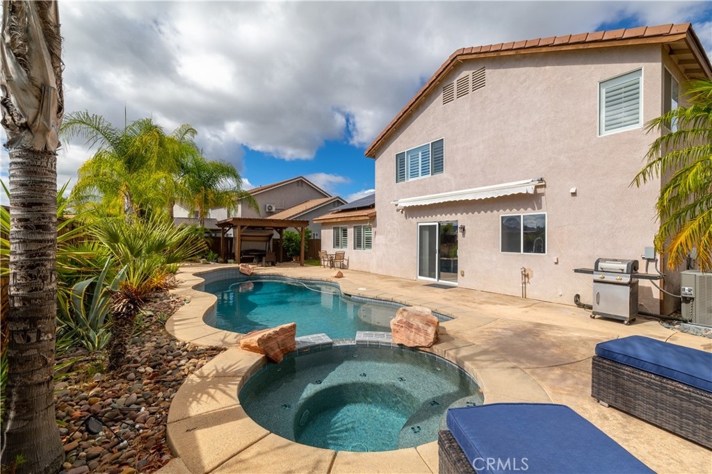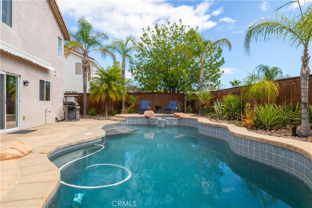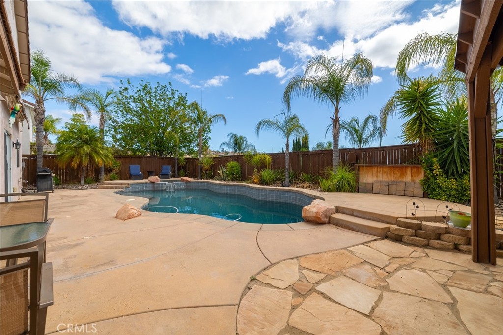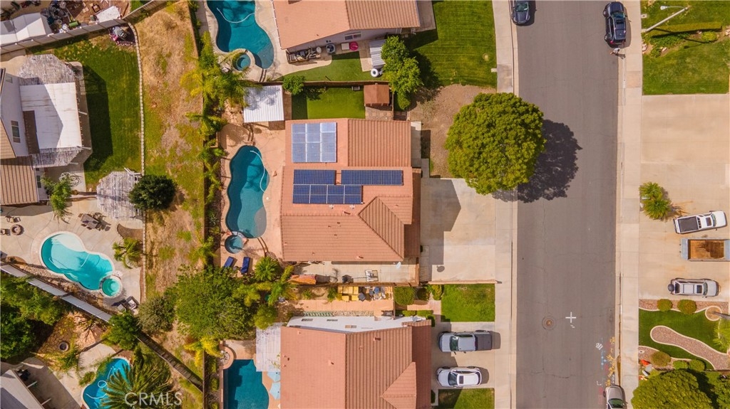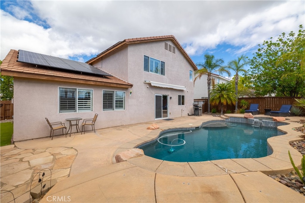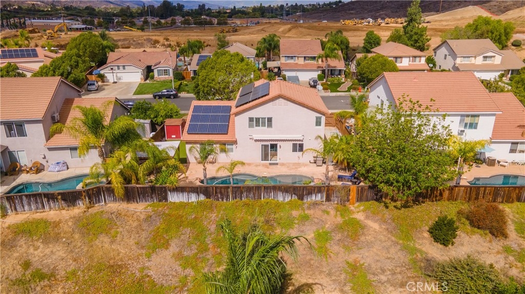 West Murrieta Pool Home with Solar, RV Parking & No HOA! Welcome to 23513 Mountain Breeze Drive, a beautifully maintained home in the highly desirable Grizzly Ridge community. This property offers the perfect blend of comfort, convenience, and California lifestyle living—with a private pool, owned solar, and plenty of space for your RV or toys. Step inside to soaring ceilings and an oversized living room filled with natural light, accented by elegant plantation shutters throughout. The open floor plan flows seamlessly into the den, dining area, and kitchen, making it ideal for both daily living and entertaining. The kitchen features ample counter space, a large walk-in pantry, and direct access to the laundry room for added convenience. Upstairs you’ll find four spacious bedrooms, including the primary suite with sweeping hillside views. The primary bathroom is designed for relaxation with a soaking tub, separate shower, dual sinks, and a walk-in closet. Your backyard oasis awaits! Enjoy a PebbleTec saltwater pool and spa with heater, perfect for year-round use. A gazebo with electric hookup makes the ideal spot for an outdoor TV or lounge space, while low-maintenance turf and a large storage shed add function to the fun. Practical upgrades make this home move-in ready: plantation shutters, a newer water heater (2022), brand new HVAC/AC system (2024) with dual-fuel capability, and owned solar panels to keep energy costs low. The 3-car garage features epoxy flooring and abundant storage. Located in sought-after West Murrieta, you’ll enjoy low taxes, no HOA, and close proximity to award-winning schools, parks, shopping, and the scenic Santa Rosa Plateau. Don’t miss this rare opportunity to own a pool home with solar and RV parking in one of Murrieta’s most desirable neighborhoods!