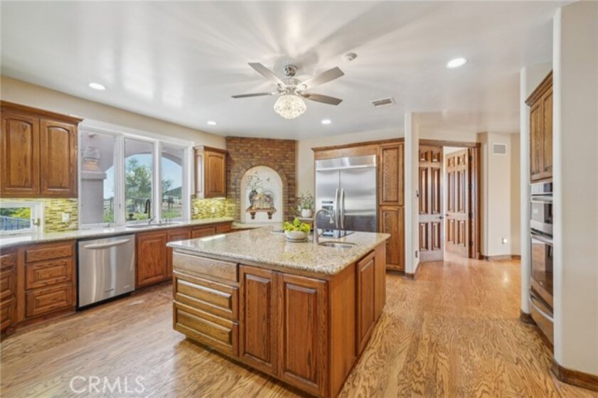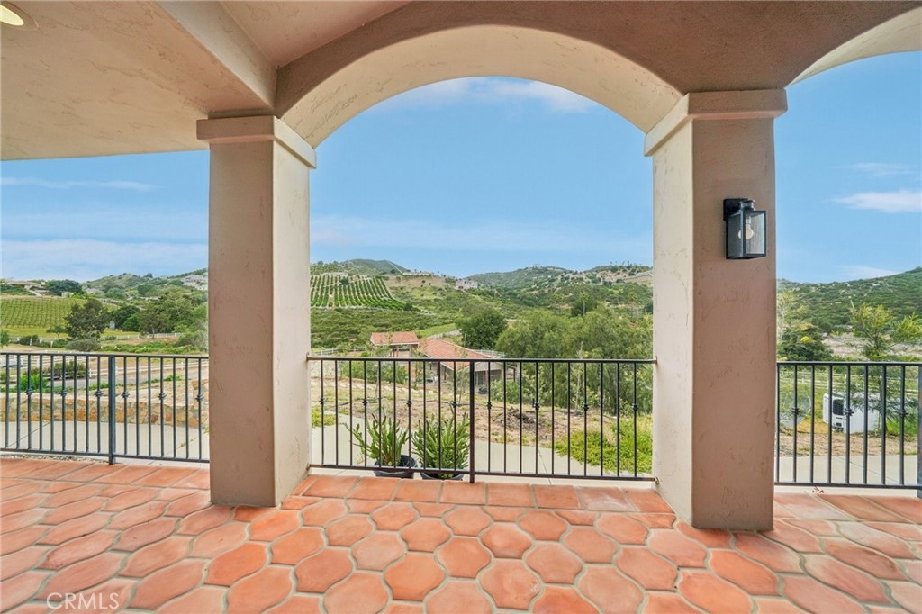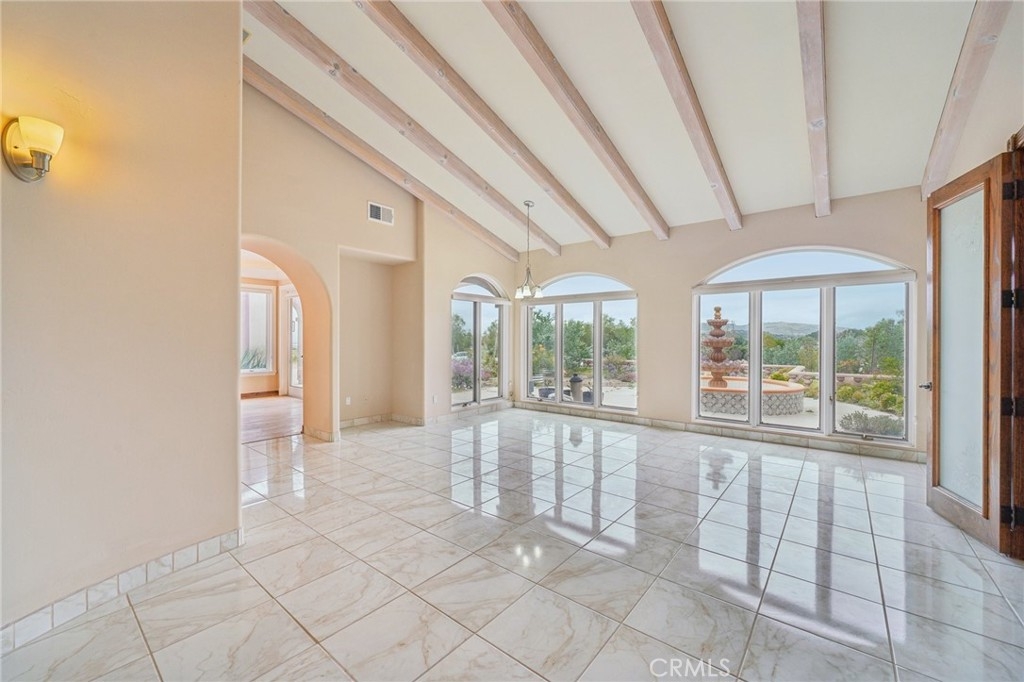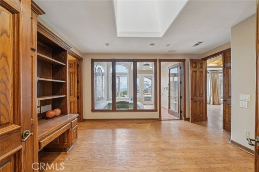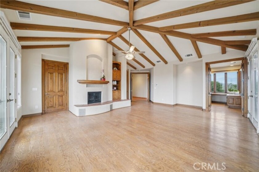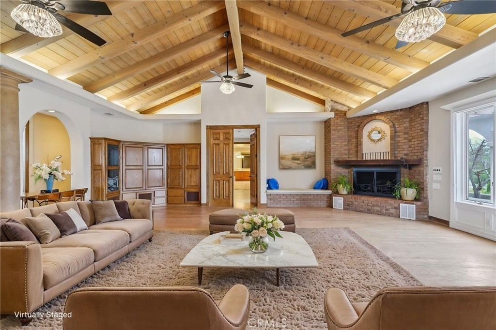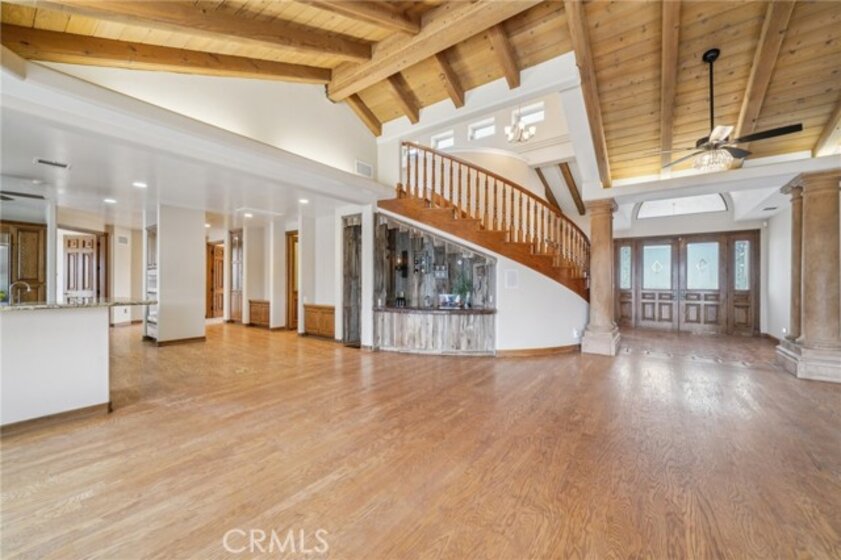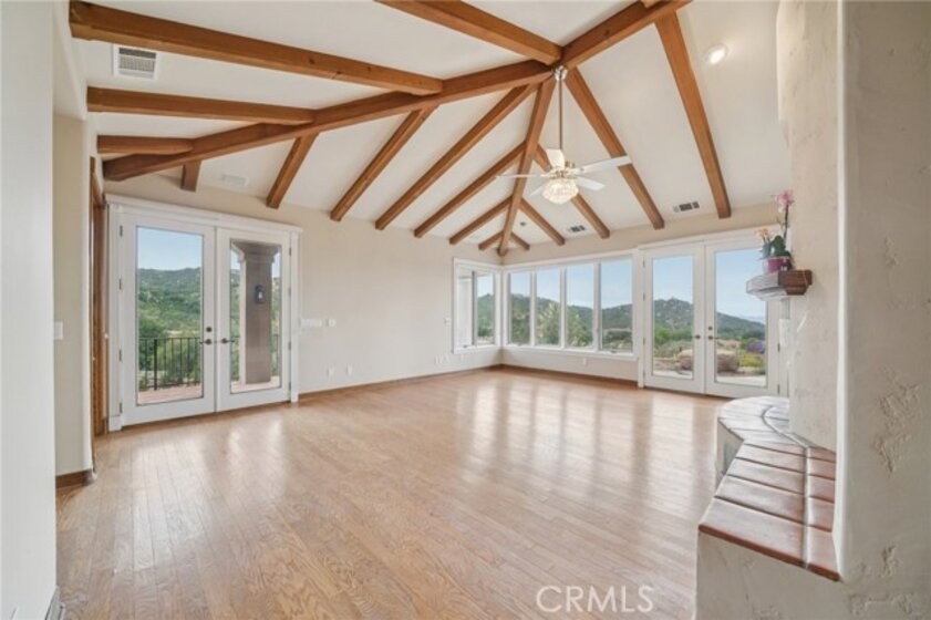 Experience elevated country living in this extraordinary equestrian estate in the prestigious La Cresta community. Set on 5.55 scenic acres, this one-of-a-kind property captures sweeping panoramic views from nearly every room and offers an unmatched blend of luxury, versatility, and lifestyle. Beyond the grand double-door entry, a dramatic foyer with terra cotta tile leads to elegant formal living and dining spaces featuring marble flooring, soaring wood-beamed ceilings, and expansive windows framing breathtaking mountain and garden vistas. The impressive family room is designed for gathering, complete with a fireplace, custom built-ins, rich wood flooring, and French doors that open to the outdoor living areas. The chef’s kitchen offers granite countertops, a large center island, ample cabinetry, and picturesque views. Multiple flexible spaces—including a private office, den, and spa room—provide endless options for work, relaxation, and entertaining. The luxurious primary suite is a private retreat with a fireplace, dedicated office, outdoor access, and a spa-inspired bathroom featuring a soaking tub, dual vanities, and dual walk-in closets. Upstairs, dual staircases lead to a spacious loft, three additional bedrooms, and a large view balcony. Designed for multi-generational living or income potential, the property includes a studio casita with full bath and kitchenette, as well as a converted caretaker’s residence attached to the barn with its own living space, kitchen, and bedrooms. Equestrian and outdoor amenities abound, including a 5-stall barn, RV garage, fenced pool with view deck and outdoor kitchen, and an indoor spa. A leased solar system adds efficiency to this remarkable estate. This is a rare opportunity to own a private, view-rich compound with exceptional flexibility in one of La Cresta’s most sought-after settings.