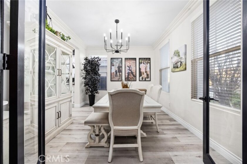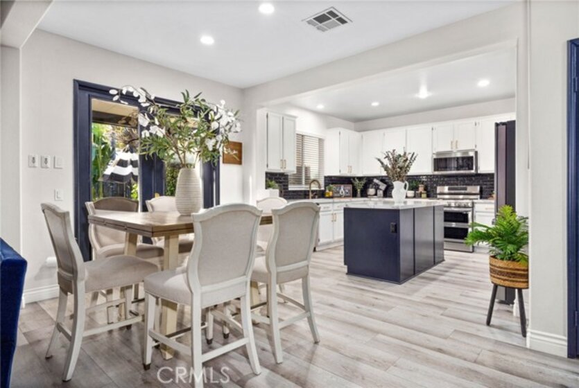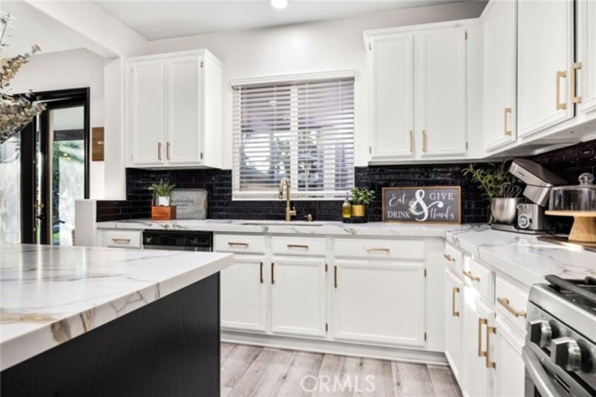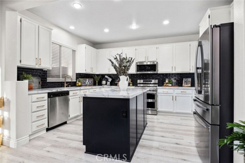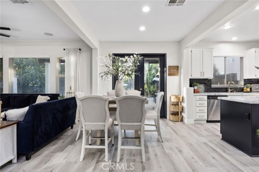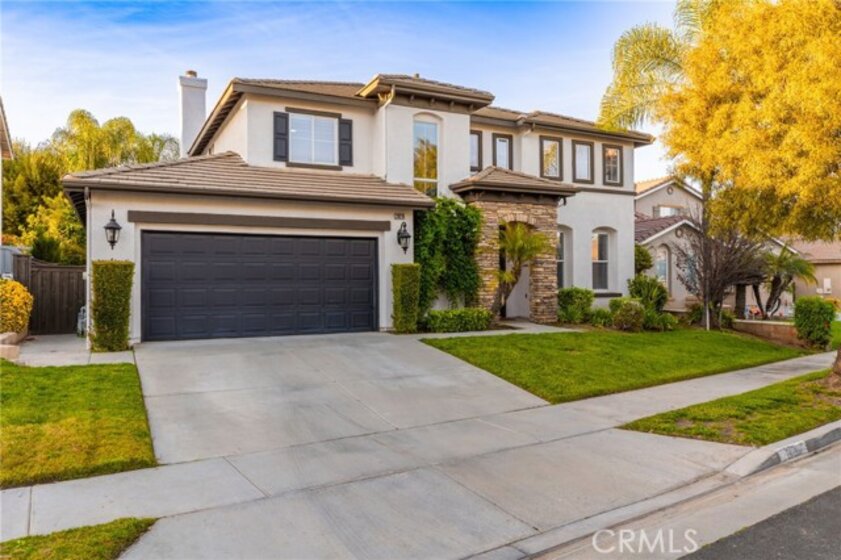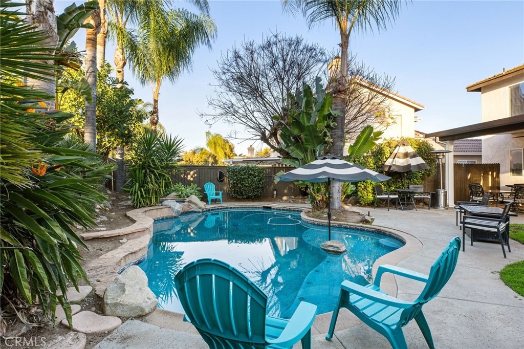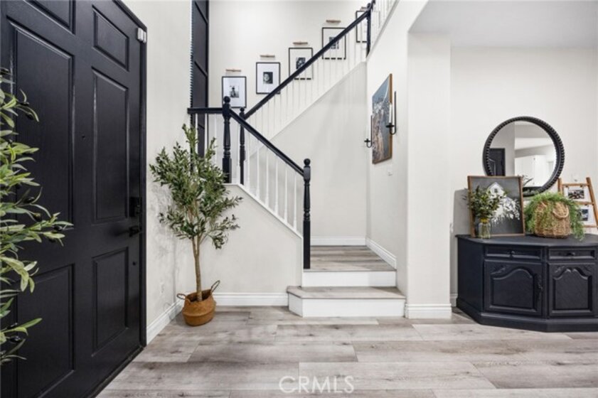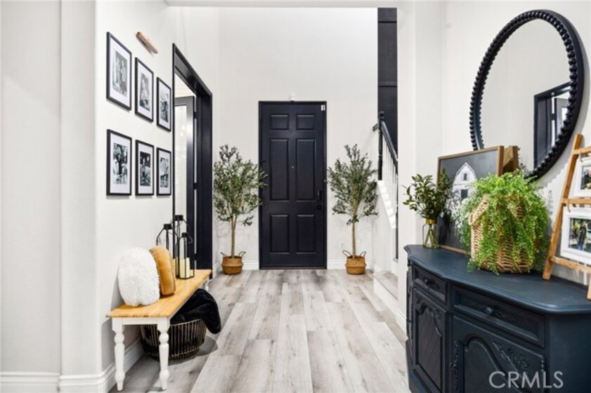 Welcome to this beautifully curated 4-bedroom, 2.5-bath, 2,301 sq ft two-story home, where refined modern farmhouse design meets elevated comfort in a highly desirable Murrieta community. From the moment you enter, soaring ceilings and new wide-plank LVP flooring create a light, sophisticated atmosphere throughout the main living spaces. The heart of the home is the stunningly updated kitchen, featuring crisp quartz countertops, upgraded gold hardware, modern black backsplash, a butler’s pantry or perfect coffee station, and generous prep space that opens seamlessly to the family room. The formal dining area has double door and an entrance from the kitchen/butlers pantry to the dining room (fancy!). All bedrooms are located upstairs, including well-sized secondary bedrooms that share a hall bath with dual sinks, while the primary suite offers a luxurious retreat complete with crown molding, a spacious walk-in closet, and an ensuite bath with dual vanities, a separate soaking tub, and a walk-in shower. A thoughtfully converted third-car garage adds versatility as a dedicated gym or hobby space with backyard access and water hook-ups. Outdoors, enjoy a private backyard oasis showcasing lush tropical landscaping, a sparkling pool and spa, mature fruit trees, and an expansive patio cover with extra height, lighting, fans, TV and outlets, perfect for elevated outdoor entertaining. Conveniently located near well-regarded schools including Oak Meadows Elementary School, Bell Mountain Middle School, and Santa Rosa Academy, this stunning home blends timeless style, thoughtful upgrades, and resort-inspired living in one of Murrieta’s most sought-after neighborhoods.