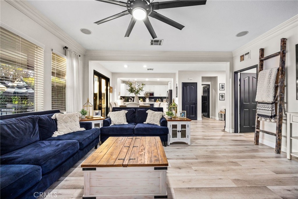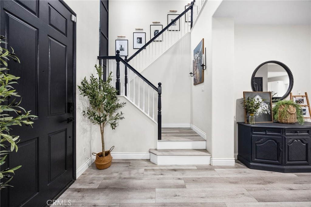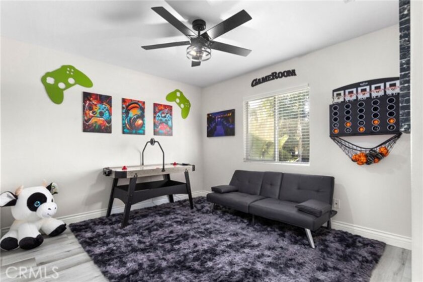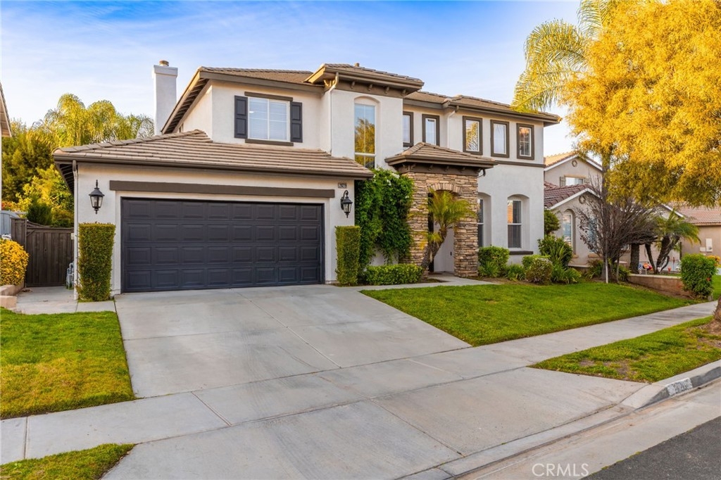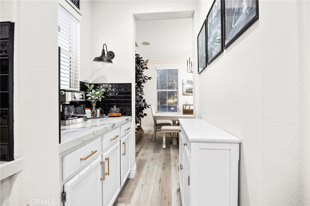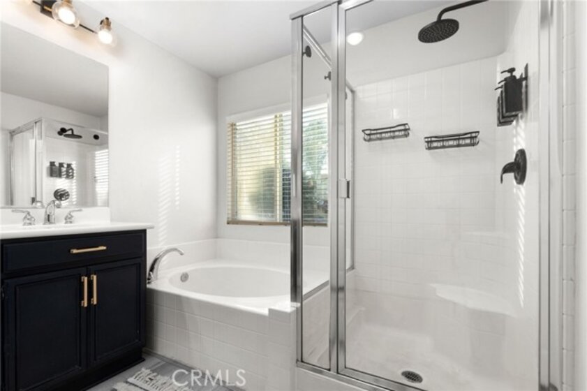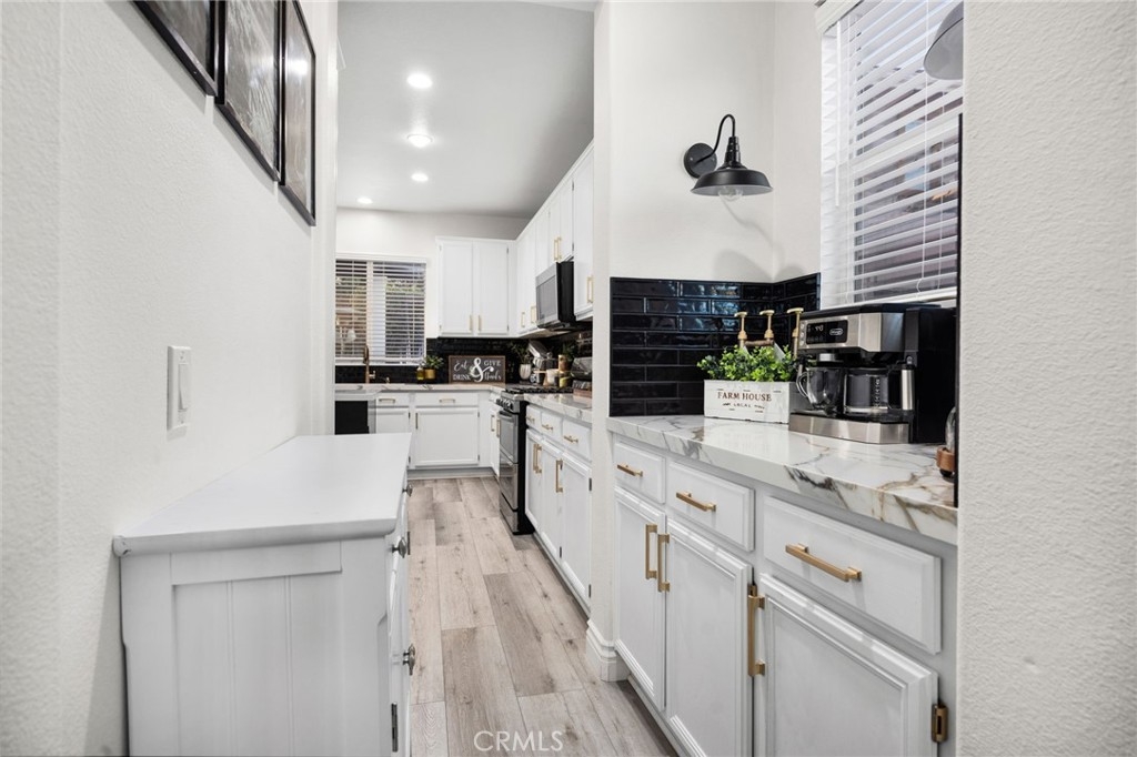 Welcome to this beautifully curated 4-bedroom, 2.5-bath, 2,301 sq ft two-story home, where refined modern farmhouse design meets elevated comfort in a highly desirable Murrieta community. From the moment you enter, soaring ceilings and new wide-plank LVP flooring create a light, sophisticated atmosphere throughout the main living spaces. The heart of the home is the stunningly updated kitchen, featuring crisp quartz countertops, upgraded gold hardware, modern black backsplash, a butler’s pantry or perfect coffee station, and generous prep space that opens seamlessly to the family room. The formal dining area has double door and an entrance from the kitchen/butlers pantry to the dining room (fancy!). All bedrooms are located upstairs, including well-sized secondary bedrooms that share a hall bath with dual sinks, while the primary suite offers a luxurious retreat complete with crown molding, a spacious walk-in closet, and an ensuite bath with dual vanities, a separate soaking tub, and a walk-in shower. A thoughtfully converted third-car garage adds versatility as a dedicated gym or hobby space with backyard access and water hook-ups. Outdoors, enjoy a private backyard oasis showcasing lush tropical landscaping, a sparkling pool and spa, mature fruit trees, and an expansive patio cover with extra height, lighting, fans, TV and outlets, perfect for elevated outdoor entertaining. Conveniently located near well-regarded schools including Oak Meadows Elementary School, Bell Mountain Middle School, and Santa Rosa Academy, this stunning home blends timeless style, thoughtful upgrades, and resort-inspired living in one of Murrieta’s most sought-after neighborhoods.