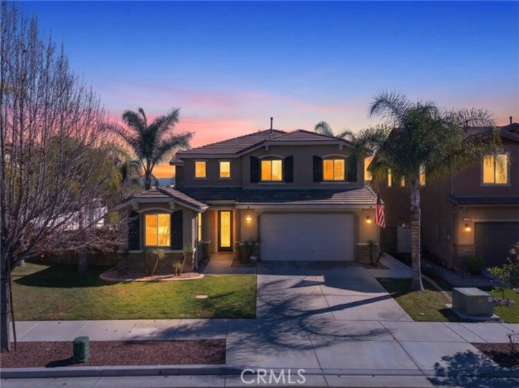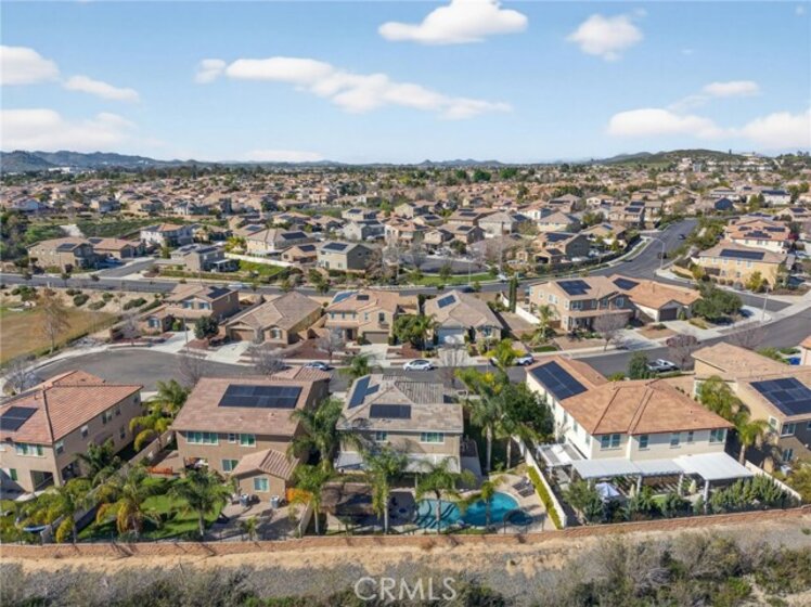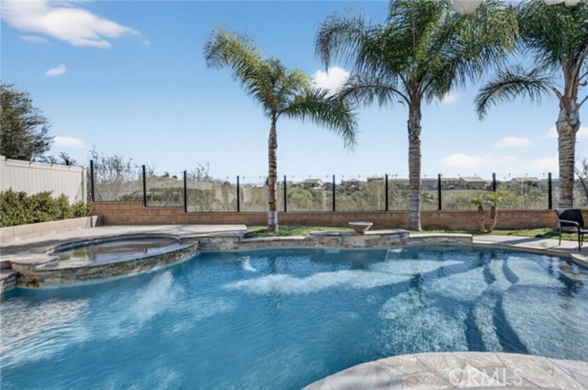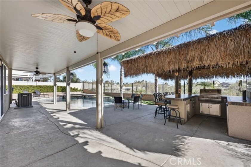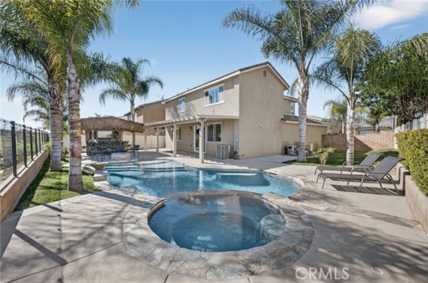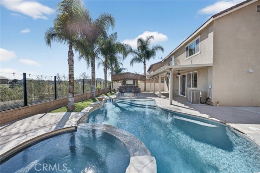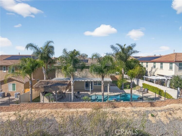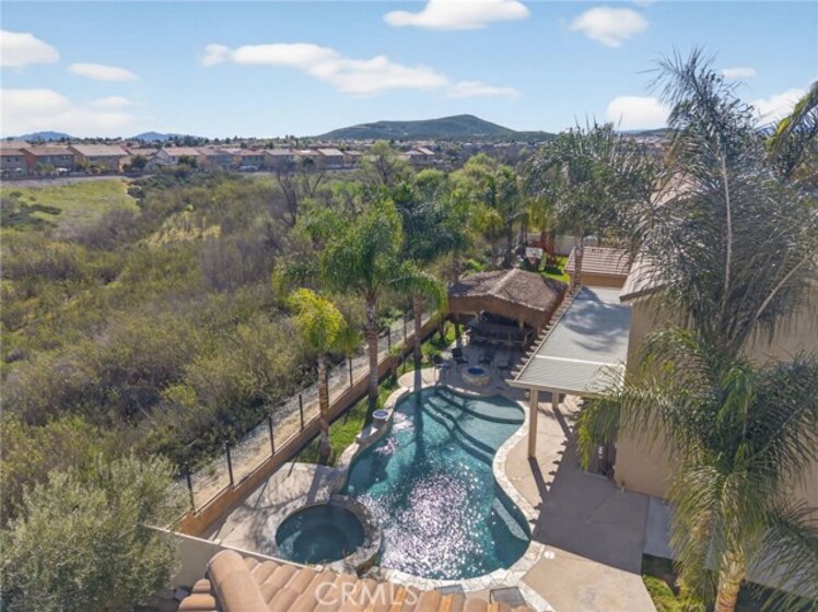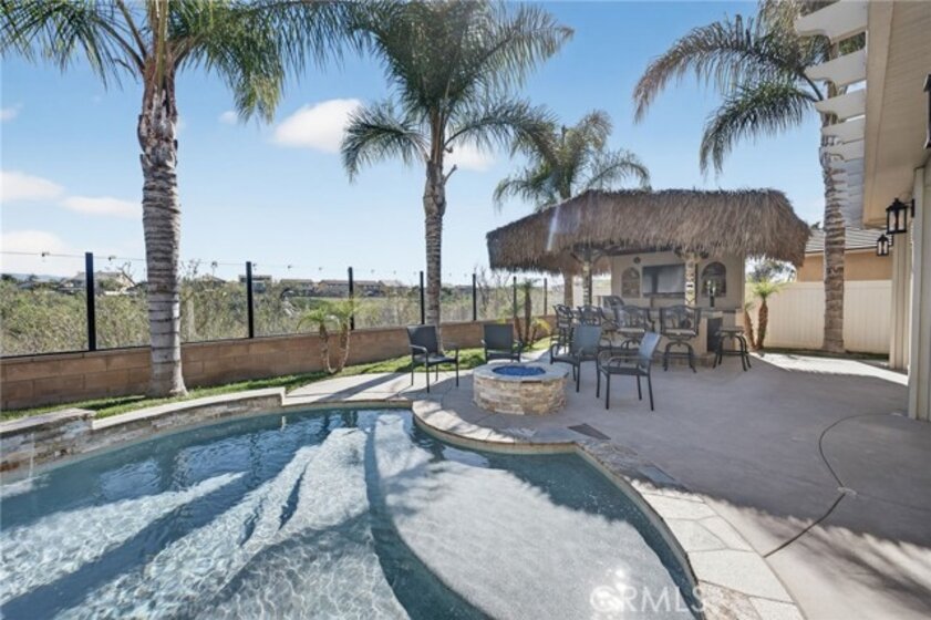Welcome to your own private resort in the heart of Rancho Bella Vista! Situated on a rare double cul-de-sac with no rear neighbors, this beautifully upgraded 4 bedroom, 3 bathroom, 2,408 sq ft home offers privacy, views, and an entertainer’s dream backyard that truly sets it apart. Step outside and experience a backyard designed for unforgettable gatherings. The resort-style pool and spa with PebbleTec finish are complemented by a dramatic fire bowl, built-in fire pit, and a tiki bar complete with gas grill, under-counter refrigerator/kegerator, built-in TV, speakers, and ambient lighting. The authentic palapa-style thatched roofing creates the ultimate tropical vibe, while the full-length Alumawood patio cover provides shade and comfort year-round. The plexiglass rear fencing preserves breathtaking mountain views and open-space greenery, delivering complete privacy with no homes behind. A large side yard adds additional flexibility and functionality. Inside, the home continues to impress with a bright, open-concept floor plan and extensive upgrades throughout. The spacious kitchen features a large central island, granite countertops, custom backsplash, white cabinetry, double ovens, stainless steel appliances, and a huge walk-in pantry. Tile flooring runs throughout the main living areas downstairs, anchored by a cozy fireplace in the great room. Crown molding, plantation shutters, and LED lighting enhance the home’s refined yet comfortable feel. The custom glass front door includes an operable panel, allowing refreshing cross-breezes throughout the home. The thoughtful layout includes a downstairs bedroom and nearby three-quarter bath—ideal for guests or multigenerational living. Upstairs, you’ll find a generous open loft, two secondary bedrooms sharing a full bath, a convenient upstairs laundry room, and a spacious primary suite. The primary retreat offers a soaking tub, separate walk-in shower, dual vanities, and a large walk-in closet, all finished with the same crown molding and plantation shutters found throughout the home. With its rare location, unmatched privacy, panoramic views, and one-of-a-kind entertainer’s backyard, this Rancho Bella Vista gem is more than a home—it’s a lifestyle.
