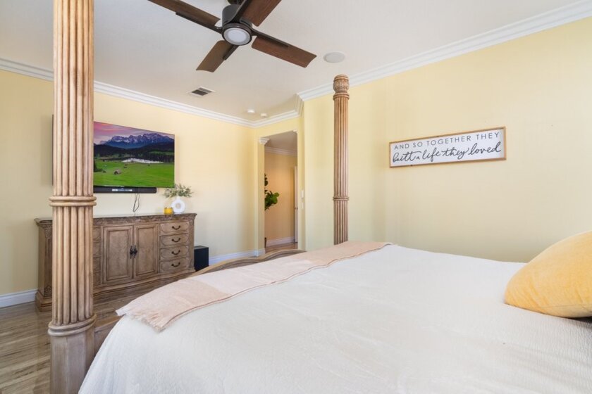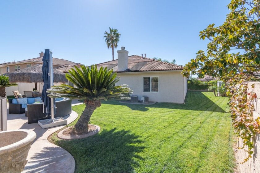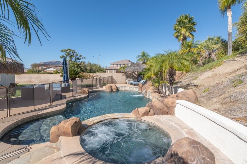 Cancel the vacation ticket! Discover this resort-style living in this rare single-story home on a 0.35-acre corner lot in the Golf Club at Rancho California. Designed for flexibility and function, this property includes a private casita with its own exterior entrance and full bath, perfect for guests, extended living, or a private office. The main residence offers three bedrooms plus a versatile den, along with a luxurious primary suite featuring a double walk-in shower, heated towel rack, and custom walk-in closet. Inside, you’ll find fresh interior paint, crown molding, and an open-concept floor plan that connects the kitchen, dining, and living areas. The kitchen showcases shaker-style cabinetry, granite countertops, dual ovens, a five-burner cooktop, and designer lighting, ideal for everyday cooking and entertaining alike. The formal dining area is currently styled as a billiards lounge, offering a seamless transition for gatherings and celebrations. Step outside to your private backyard oasis with a sparkling pool featuring a slide and water features, an attached spa, pergola-covered seating, lush tropical landscaping, and a built-in BBQ beneath a palapa bar. Additional upgrades include home solar, pool solar, a central vacuum system, epoxy-finished garage floors, and a large potential RV location. An outdoor shed provides extra storage space for tools and seasonal gear. This property combines privacy, space, and convenience, located just minutes from shopping centers, top-rated schools, and major freeways. With no HOA and low taxes, this exceptional home delivers the best of Murrieta living in one of the area’s most desirable golf-course communities.