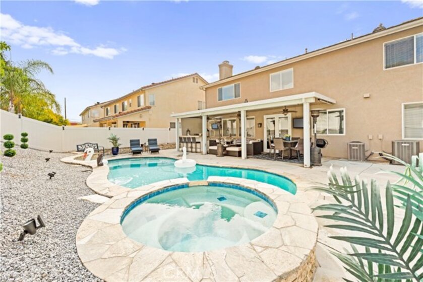 HONEY STOP THE VEHICLE! THIS IS THE BEST VALUE HOME IN ALL OF MURRIETA! This two story POOL home is fully upgraded inside and out! The home has low maintenance front yard, front porch, upon entry has vaulted ceilings, formal entry, formal living and dining area. Hardwood floors throughout the main level, kitchen is fully renovated with new cabinets, quartz countertops, double pantry, tile flooring, new doors to the backyard, spacious family room with gas fireplace, downstairs bedroom, full renovated bathroom with a tile shower, additional bonus room/office, and downstairs laundry. Upstairs you have an oversized loft, plush carpeting, two spacious secondary bedrooms, renovated hallway bathroom, large primary bedroom, fully renovated primary bathroom with soaking tub, tile shower with glass enclosure, and a spacious double walk in closet with lots of built in storage! Now to what is arguably the best part of the home… The entertainers backyard! Brand new HEATED POOL only a few years old with jacuzzi, pebble tech finish, alumawood patio cover with fans, BUILT IN GAS BBQ with double fridges, multiple drawers, and tile top with stucco finish. Pure entertainment area cannot be complete without a full built in gas FIRE PIT! This home truly has it ALL! Brand new dual zone AC units, OWNED SOLAR!!!! 2 car garage with ample storage and a exterior EV charging box if you want the option to charge inside or out. Located around the corner off Winchester Rd for easy access and down the street from shops and eateries.