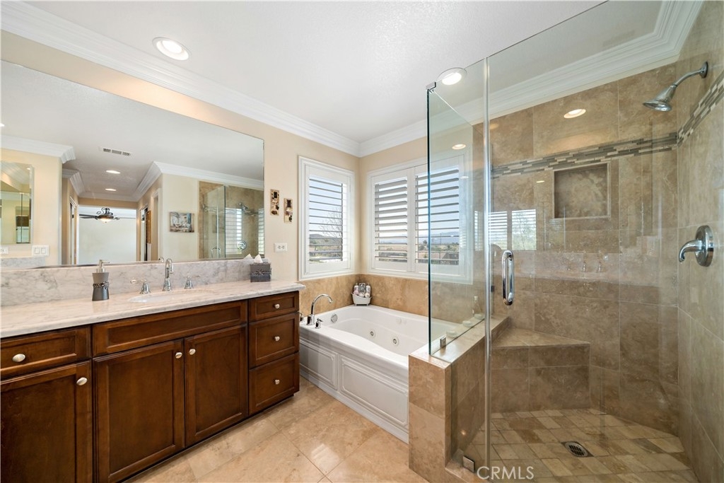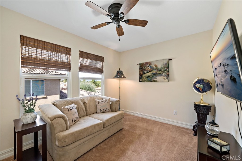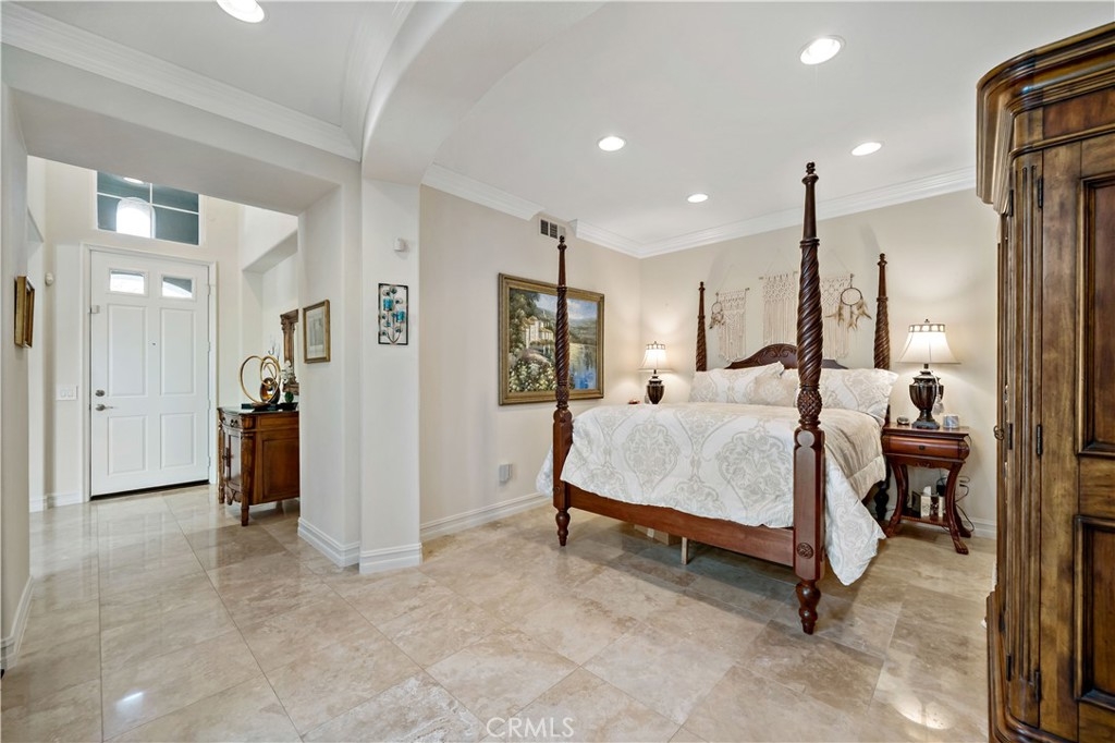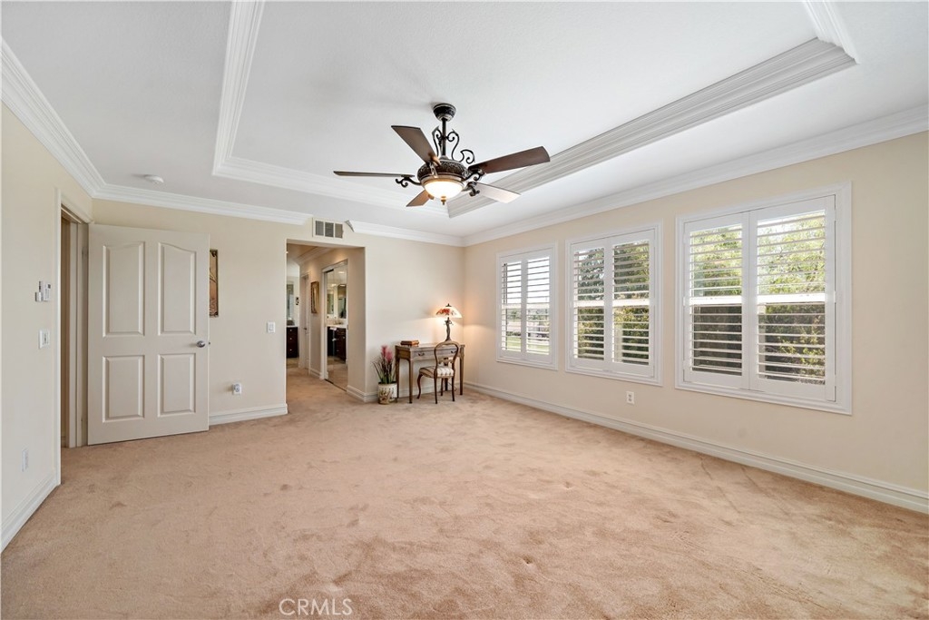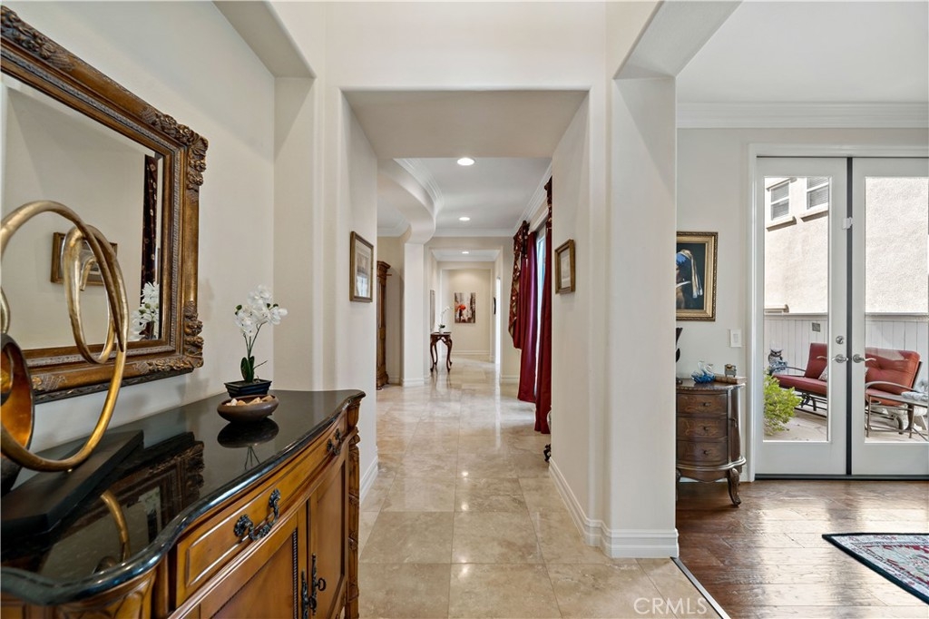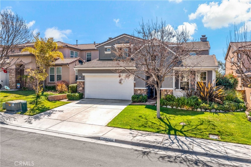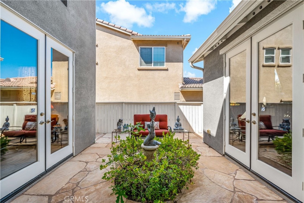 Welcome to your dream home in Murrieta, where stunning views of golf course and luxurious upgrades await! This property boasts 5 bedrooms plus a separate primary retreat that can be converted to a 6th bedroom. As you enter, you'll notice the formal living room, separate dining room/den and the downstairs bedroom (being used as office) all feature French doors that connect them to the serene side courtyard/French patio, perfect for your morning coffee or evening gatherings. Also on the main floor, the beautifully upgraded bathroom featuring a newer high end vanity with granite/quartz countertop, along with stylish light fixture and custom mirror. Now, let’s talk the chef's kitchen! It features gorgeous granite countertops, stainless steel appliances, and extra cabinets for all your culinary needs. The oversized kitchen island is perfect for meal prep or casual gatherings with friends and family. Head upstairs into the large expansive primary bedroom, where recessed ceiling and a two-sided fireplace creates a warm and inviting atmosphere. The primary retreat is a true sanctuary is a bonus seating area or hobby room. You’ll love the luxurious bathroom featuring a jetted tub, a stunning stone shower with frameless glass doors, and marble vanities for that touch of elegance, all with gorgeous views of the mountains. There is also an open bonus room which leads to the three well appointed secondary bedrooms. The endless upgrades include: travertine stone floors, wood flooring in living and family rooms, upgraded ceiling fans throughout the home, custom built ins in family room, retreat and upstairs hallway, plantation shutters, crown molding and 6 inch baseboards throughout, whole house water softener, 3 car tandem garage with storage and insulated garage door, PAID SOLAR and too many more to list! From the charming flagstone porch to the gorgeous backyard with mature landscaping, views of the golf course and mountains and the flexibility of no HOA, this home is the one you were waiting for!