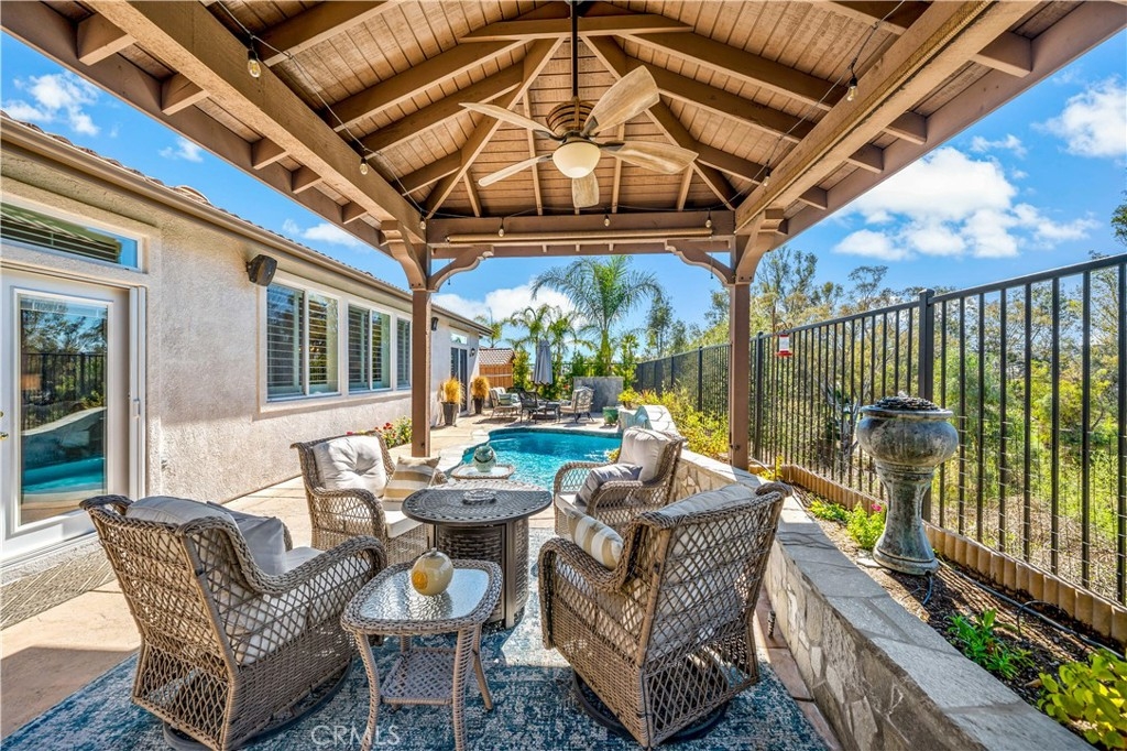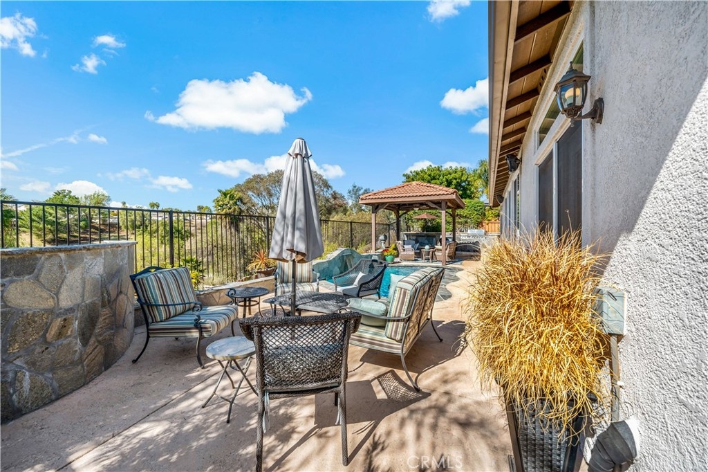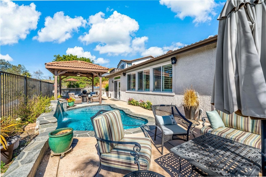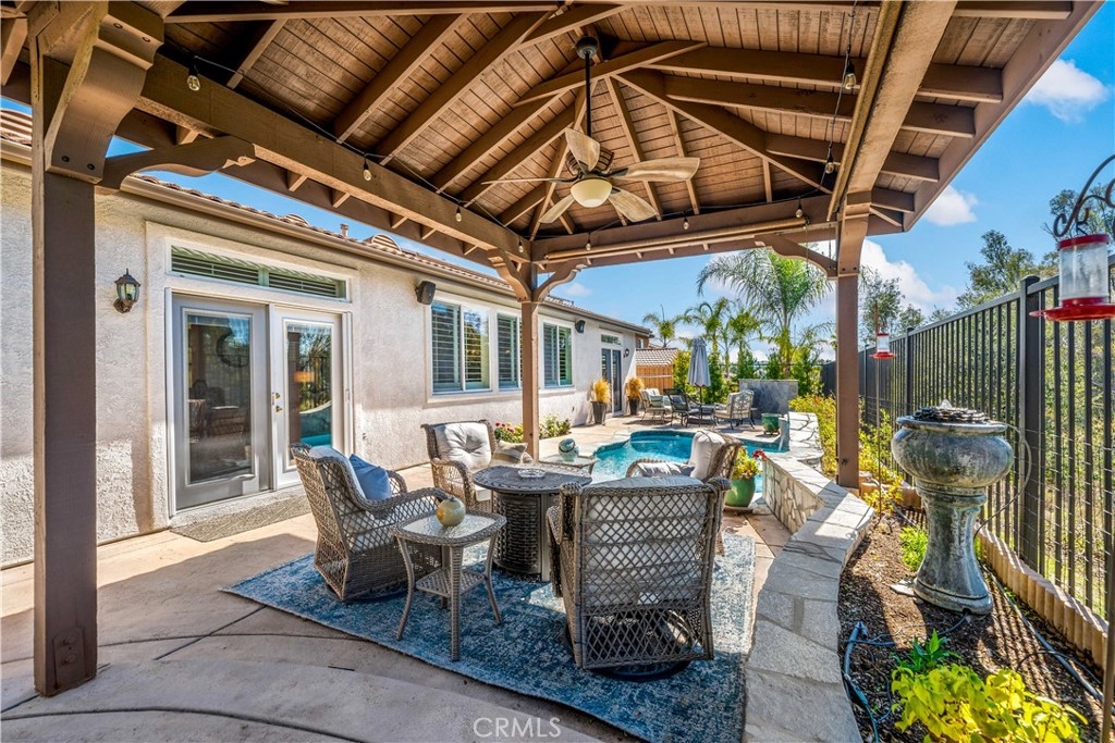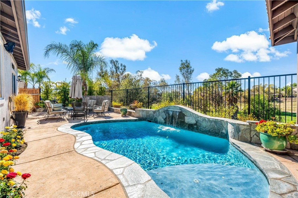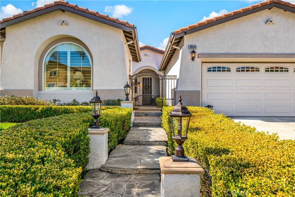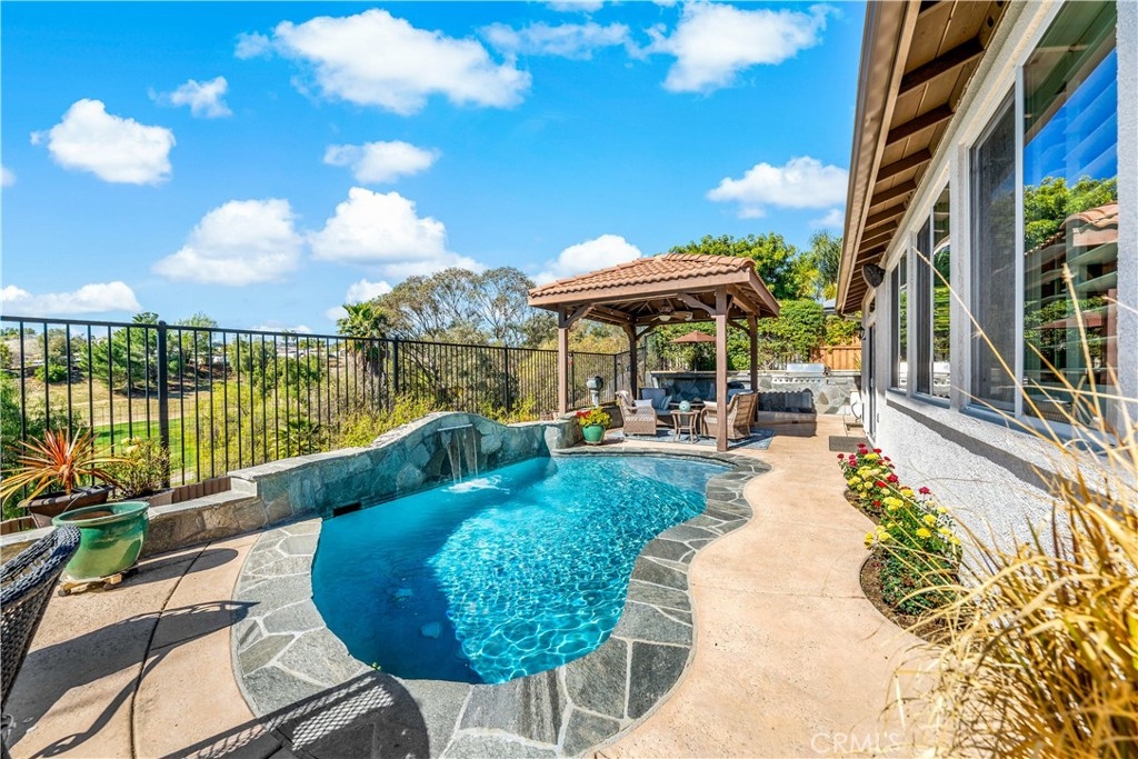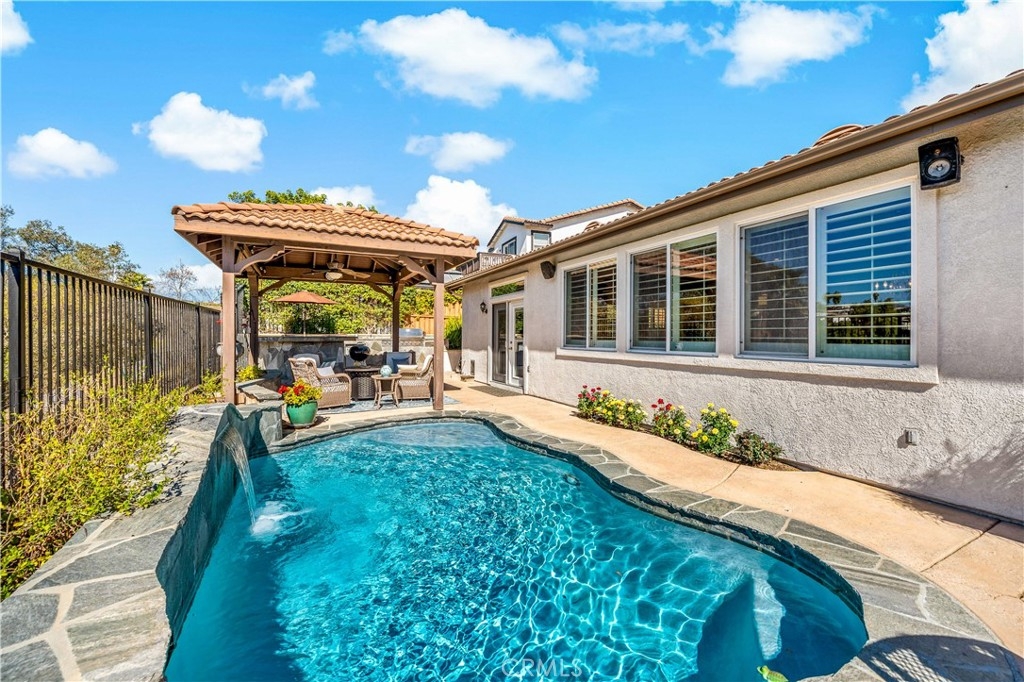This home truly embodies the saying, "Entertainer's Delight!" Rare opportunity! Golf course views? Check! Sparkling pool, gourmet kitchen, money saving solar? Check, check, check! Welcome to 38693 Clearbrook Drive a home where you will instantly FALL IN LOVE. The freshly painted exterior exudes charm, complemented by manicured landscaping and lighted flagstone steps leading to the gated front courtyard. Step inside to discover an open floor plan filled with natural light, hardwood floors, soft neutral tones, and ceiling fans throughout. The formal dining and family rooms are seamlessly connected, creating the ideal space for hosting guests. A stacked-stone fireplace with hearth and mantel anchors the family room, accompanied by plantation shutters, recessed lighting, crown molding, and surround sound. This GOURMET KITCHEN has been recently remodeled to PERFECTION - a Chef's Dream! It boasts leathered MARBLE countertops and backsplash, Maple cabinetry with soft-close features and tongue-and-groove construction. Top-of-the-line appliances include a 5-burner stove, Bosch dishwasher, and THREE ovens. A stunning copper sink, built-in mixer shelving, wine refrigerator, and glass-front lighted cabinetry elevate the space to a whole other level of LUXURY. Enjoy ample storage, pull-out drawers, custom wood shelving, and a built-in desk. An eat-in dining area and elegant pendant lighting complete the kitchen. Adjacent to the kitchen is the laundry room with its own sink, and direct access to the epoxy-floored 2-car garage, offering plenty of storage. Behind the Formal Dining room, sits the Primary Bedroom Suite which offers French doors to the backyard. LOVELY barn door separates the beautiful 5-piece bathroom, a soaking tub, walk-in shower, dual vanities, and a spacious walk-in closet. Closer to the entryway, this home also includes a den/office which could become a 4th bedroom, two additional nicely sized bedrooms, and a full and half bathroom - which feels to be a separate wing of the home. Step outside to breathtaking Golf Course Views from the backyard, elevated above the 3rd Hole of The Golf Club at Rancho California. The sparkling pool w/ a streaming cascade feature is where you will want to spend those warm summer days. Multiple seating areas provide the perfect retreat to relax and unwind. An outdoor kitchen with a built-in BBQ, refrigerator, and stone bar making outdoor entertaining effortless. Lower taxes and no HOA! Minutes from Temecula Wine Country.