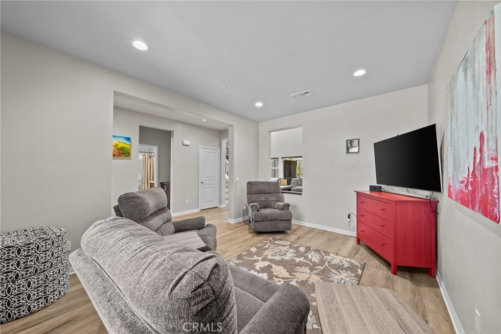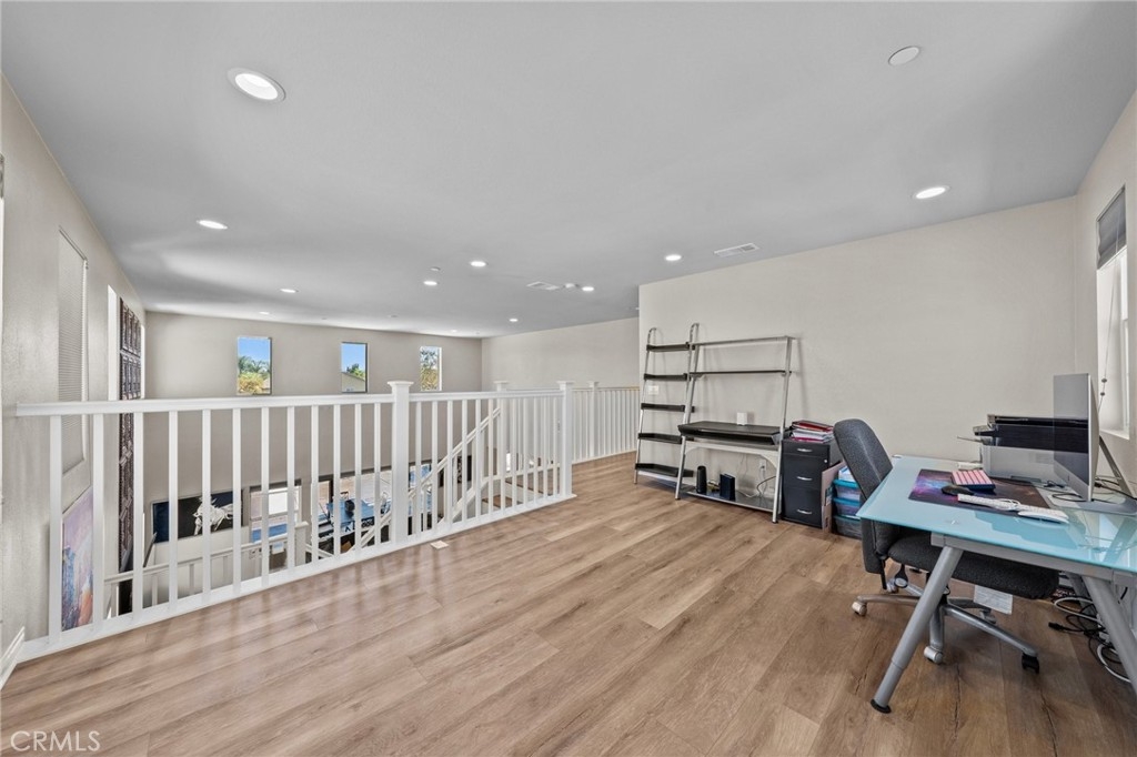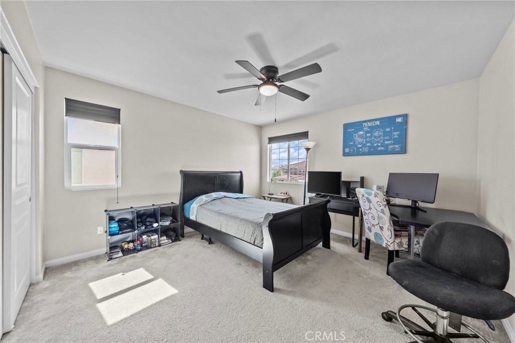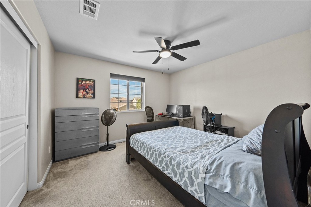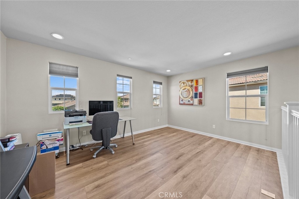 Welcome home!! Discover the epitome of comfort and luxury living in this stunning 4-bedroom, 3-bathroom, loft & office home perfectly situated on a premium lot, cul-de-sac street, in the renowned community of Spencer's Crossing. Featuring a 3-car tandem garage with overhead storage and custom front landscaping, this residence is designed for both comfort and elegance. As you arrive you are welcomed by the beautifully manicured front yard which features low-maintenance landscaping with drought-tolerant plants, lush artificial grass, and a lime tree. The large covered front porch invites you to relax and enjoy the beautiful surroundings. As you enter, you are greeted by an Office/Den area to your right, perfect for remote work or study. The main floor bedroom to your left is conveniently located next to a full bathroom perfect for guest. LVP flooring throughout the main living areas. Continuing down the hall, the space opens up into a bright and inviting family room with vaulted ceilings, flowing seamlessly into the heart of the home, the kitchen. The gourmet kitchen features espresso-colored high-end cabinetry, granite countertops, stainless steel appliances, newer dishwasher, plenty of storage, and walk-in pantry! The large kitchen island faces the family room, making it an ideal setup for entertaining. Step outside to the large covered Aluma wood patio, complete with 2 ceiling fans, providing the ideal space for outdoor gatherings year-round. Low-maintenance landscaping. With no direct rear neighbors, the yard offers both privacy and tranquility. On the second floor, you'll find a spacious loft, two additional bedrooms, plenty of storage space, and the expansive primary bedroom featuring an en suite bath and a walk-in closet. Additional highlights include a quite cool fan, large laundry room with a sink, folding table, & closet. The home boast fully paid solar panels, helping you save on energy cost. Enjoy access to the community's Resort-style amenities such as pools, parks, playgrounds, dog park, clubhouse, and so much more. You'll also enjoy the convenience of being just minutes from award-winning schools, shopping, and nearby freeways making this the perfect place to call home. This house is an absolute MUST SEE!