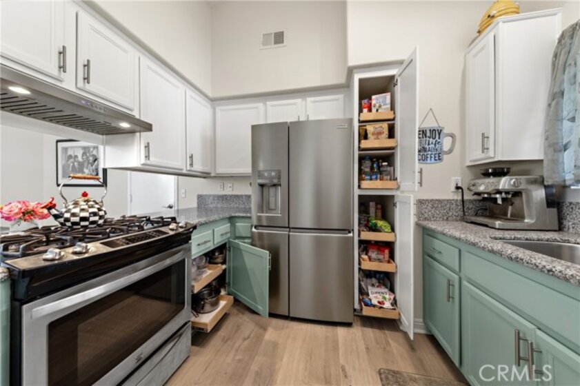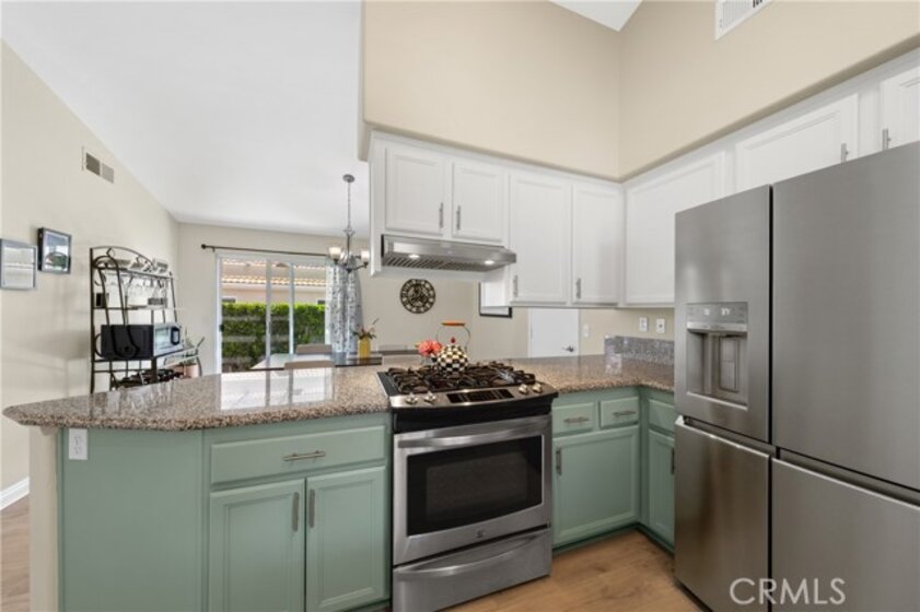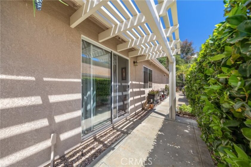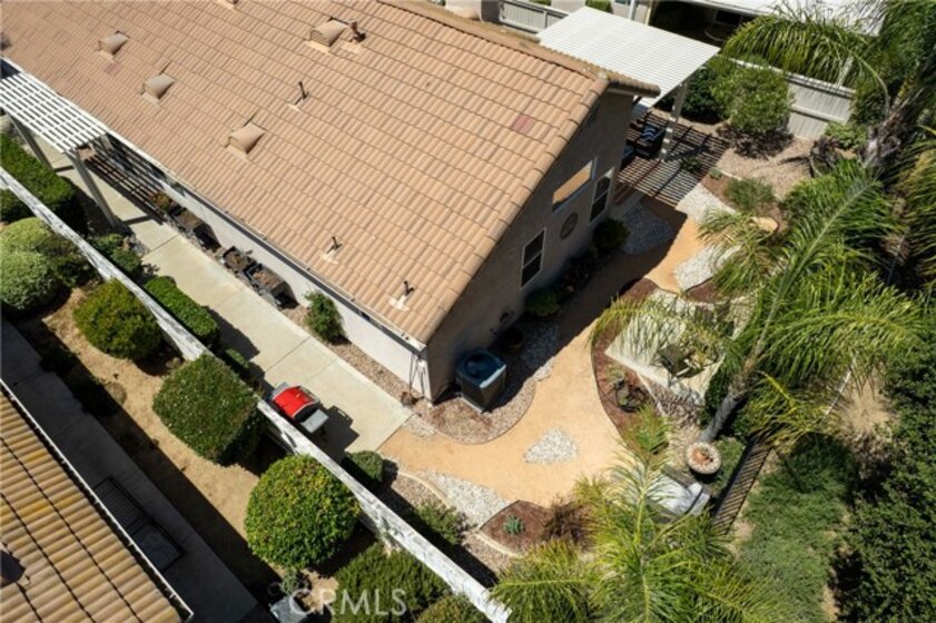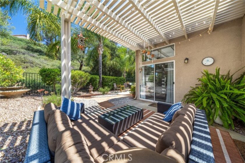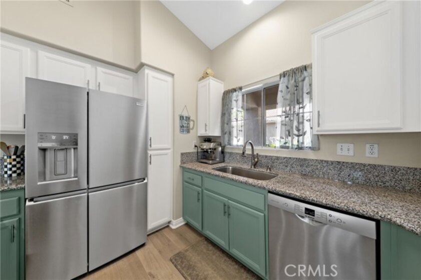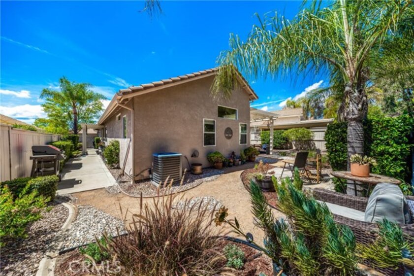 Stylish & beautiful up-to-date home on a fantastic private lot with a lush open greenbelt behind you. You'll be impressed from the moment you enter & see the neutral wood-look laminate flooring that extends throughout the entire home. The living room has a stacked stone fireplace, vaulted ceiling, lots of natural light & opens to a large patio with a newish aluminum cover. Your kitchen has granite counters & stainless-steel appliances with a convenient laundry closet. You will love the pull-out shelves in the pantry & lower cabinets. Your spacious dining area has a sliding door to a private side patio, with an aluminum cover. The primary suite is very roomy with a vaulted ceiling and relaxing views of palms & leafy trees from the overhead windows. There is a large walk-in closet & a dual sink bath with a quartz countertop, newish cabinets & updated fixtures. The shower is recently refurbished for a super clean presentation. The second bedroom boasts a Murphy bed (can be included in the sale) to expand the options for this room. There is a guest bath nearby. Relax to the sound of your gurgling fountain from the patio, which is like another outdoor room with so much privacy on this oversized lot. Wander along the path in the back to another nice side area & patio outside your dining room. Most windows have soft shades & there are light curtains on the sliding doors. The storm door on the entry lets you enjoy lots of natural light & breezes. Your garage has plenty of room for 2 cars + lots of built-in cabinets. Dishwasher is appx 1 year new, water heater was replaced in 2022. Residents of the Colony enjoy an active and fulfilling lifestyle in a PREMIER GATED SENIOR COMMUNITY. The RESORT CLASS CLUBHOUSE boasts a year-round pool, 2 spas, lighted pickle ball/paddle tennis & tennis courts. You have the benefit of a gym, library, ping pong, billiards, hair/nail salon. There are groups, clubs & activities for all interests with a spacious auditorium for shows, dances, banquets, concerts, movies, bingo & parties for all occasions. A privately owned 18-hole golf course is inside the gate. The HOA waters & maintains all front landscaping. The guard gated entry and 24-hour security patrol give you security & peace of mind. Ideally located close to stores, restaurants, medical services, casinos & wineries. Make the most of your retirement years with the friendly neighbors & sense of community as you enjoy TRUE RESORT STYLE SENIOR LIVING in The Colony.