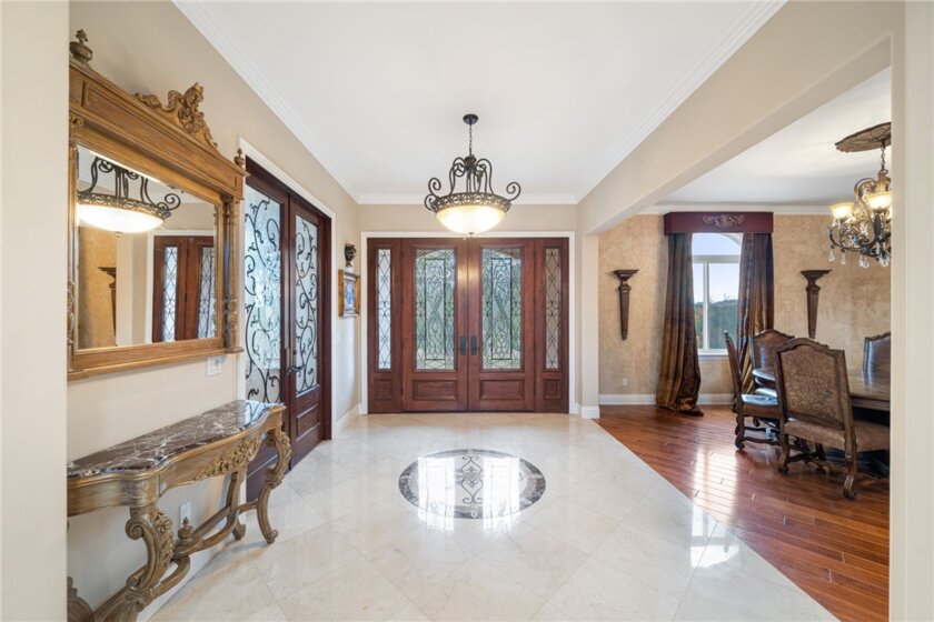 Experience Elevated Living in La Cresta Highlands! Nestled along the scenic horse trails of Santa Rosa Highlands, this extraordinary estate offers a rare blend of timeless elegance and limitless potential. Set on park-like acreage adorned with majestic oaks and natural boulders, the property boasts soaring 360-degree views of the Santa Ana Mountains, tranquil meadows, and the serene beauty of one of Murrieta’s most coveted equestrian communities. Spanning approximately 5,200 sq. ft., the residence showcases ornate, impeccable finishes throughout. Step inside to discover a home that feels brand new, where craftsmanship meets sophistication: venetian plaster walls, custom-painted ceiling medallions, and iron scrollwork accent a 23-ft great room with old-world charm. Polished travertine, rustic chiseled stone, and hardwood floors complement wood-beamed ceilings and custom doors. A gourmet kitchen with exotic granite, premium appliances, and a custom hutch is wired for expansion with space for a third oven and warming drawer. The owner’s suite on the main level offers a spa-inspired bath with heated floors, dual water closets, bidet, jetted tub, and an artist-designed shower framed by curved leaded glass windows. Beyond the home, the possibilities are endless. The expansive backyard is a blank canvas for your vision —design a resort-style pool and cabana, plant a fruit grove, or create equestrian facilities for horses to roam. A graded upper lot is ready for a guest house, ADU, workshop, or additional garages. If you can dream it, this property can accommodate it. Additional highlights include a hearth room with wood-burning fireplace, a sprawling stamped-concrete patio, and a 3.5-car garage with pass-through for ATVs or golf carts. Privacy and natural beauty define this estate, offering a lifestyle of luxury, recreation, and tranquility. If this property doesn’t have it yet, there’s room to build it. Discover the unmatched charm and potential of the highlands—your private sanctuary awaits.
