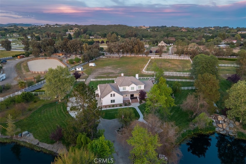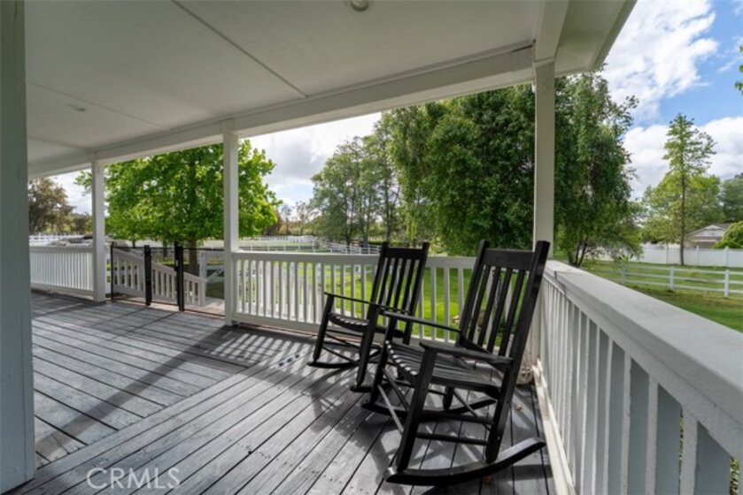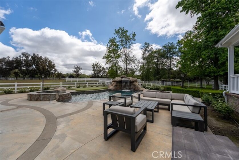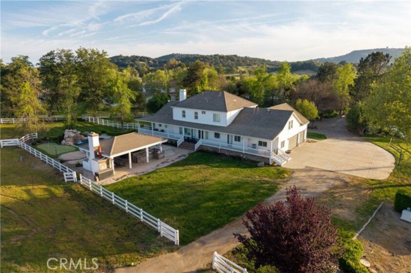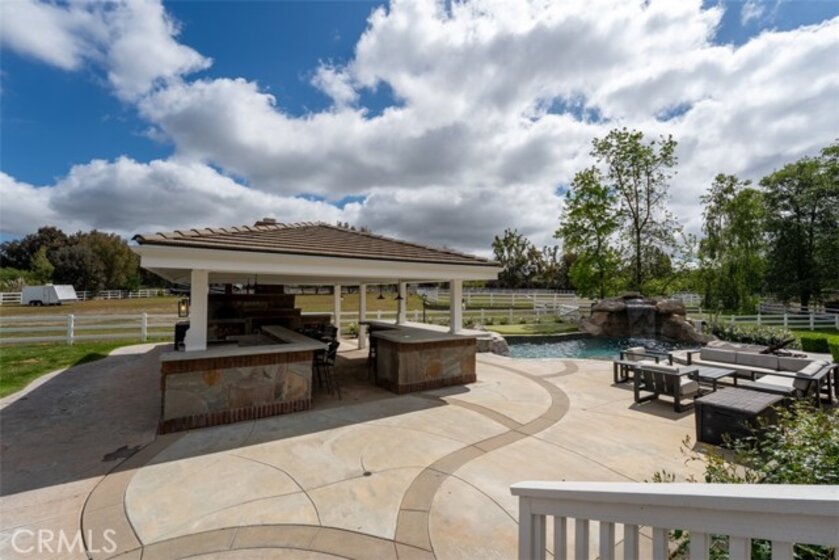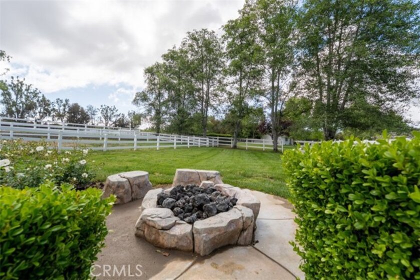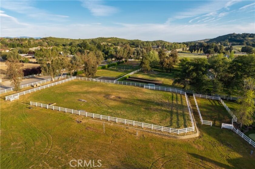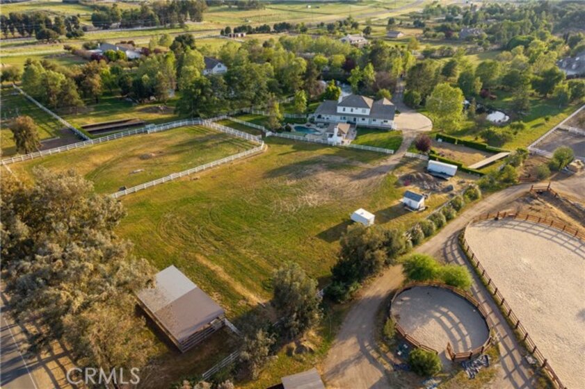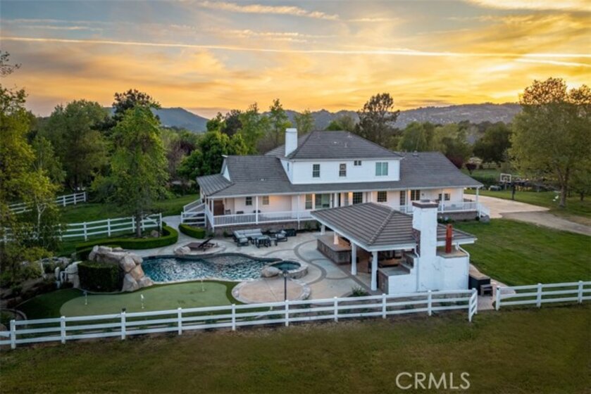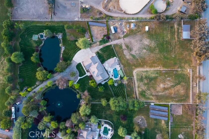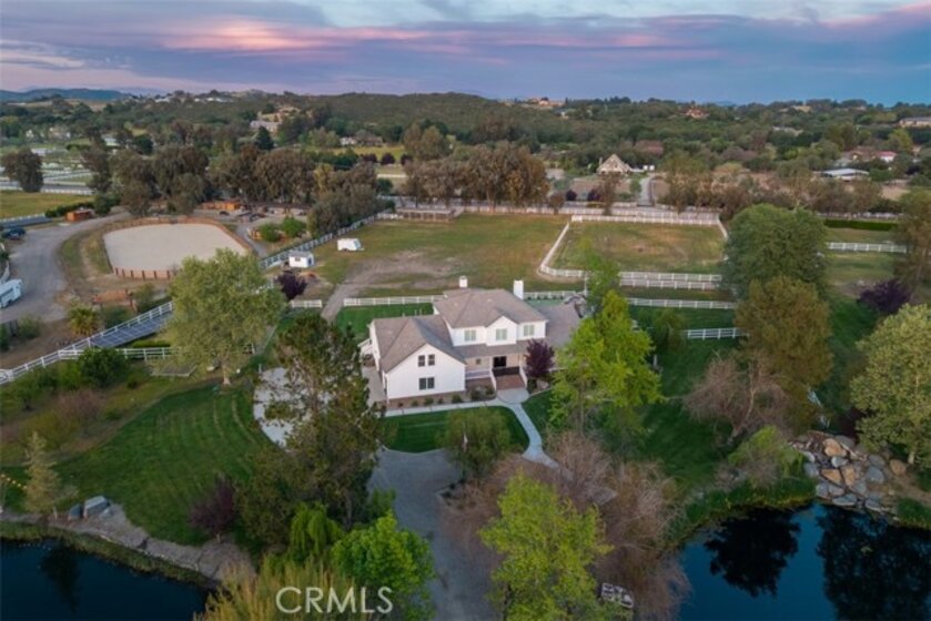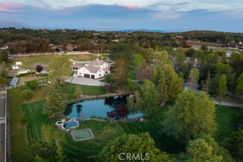 Your private oasis awaits. Set on 4.83 fully usable acres at the end of a quiet cul-de-sac in the gated Meadow Oaks community of La Cresta's coveted Tenaja neighborhood, this custom 4 bedroom, 4.5 bath ranch estate delivers true country living in one of Southern California's most sought-after equestrian enclaves on the Santa Rosa Plateau. Live off the grid in spirit, just minutes from civilization. The property features owned solar power, a private well for the grounds, septic system, 1,000 gallon propane, 400 amp electrical service, and a whole-house Generac generator that self-tests monthly. A concrete tile roof, raised brick foundation, and full fire sprinklers in both the house and garage round out the systems. Inside the approximately 4,226 square foot main residence, the main-level primary suite features a remodeled spa bath with heated Carrara marble floors, a freestanding tub, and an oversized shower. The chef's kitchen opens to the great room with Indian black granite counters, a prep island, and premium appliances. Dual staircases lead upstairs to three en-suite bedrooms, an office/loft, and a spacious game room. Step outside to your resort. A custom pool and spa, a BBQ pavilion with a wood-burning pizza oven and outdoor fireplace, two stocked ponds (3 lb bass, koi, turtles) with a managed water-level system and LED-lit fountain, 15 producing fruit trees (pomegranate, peach, apple, pear, lime, orange, blackberry), and a drip-irrigated garden. The equestrian setup is turnkey: 5 stalls plumbed with water and electric, a fully sprinklered barrel arena, and direct access to La Cresta's celebrated trail system. Over $125,000 in recent capital improvements: new concrete tile roof with a 5 year transferable warranty, whole-house Generac generator, new HVAC, upgraded pool equipment and monitor, fresh exterior siding and paint, and new window screens. Minutes to I-15, Temecula Wine Country, top Murrieta Valley schools, hospitals, and shopping. A rare offering in one of the most sought-after pockets on the Plateau.