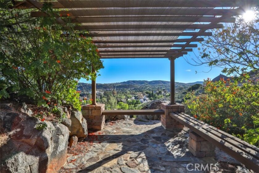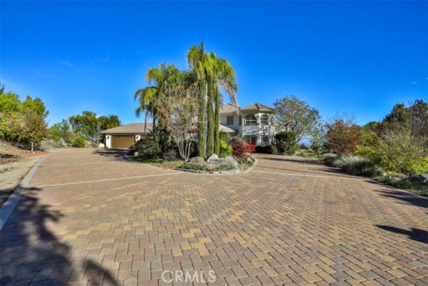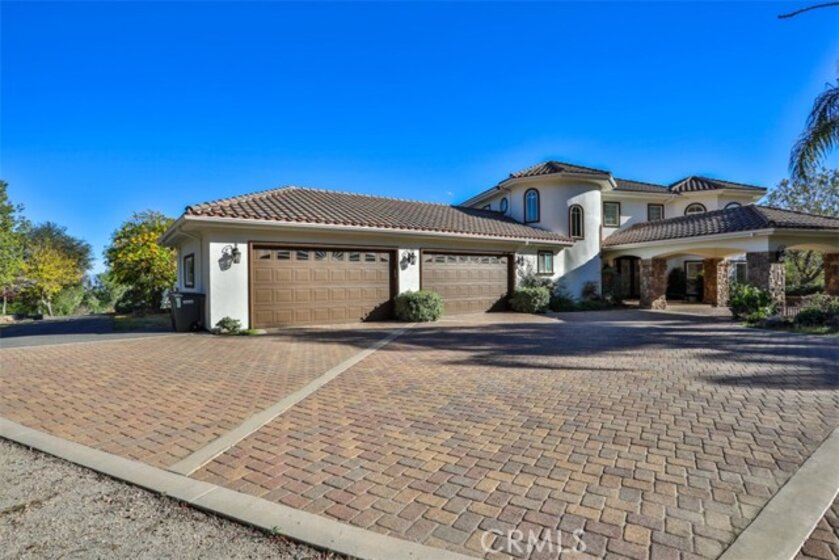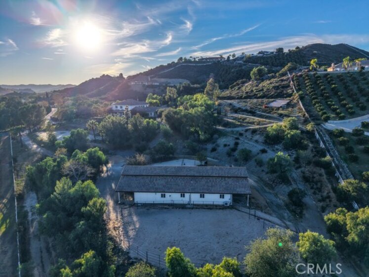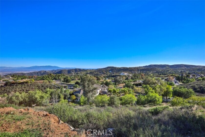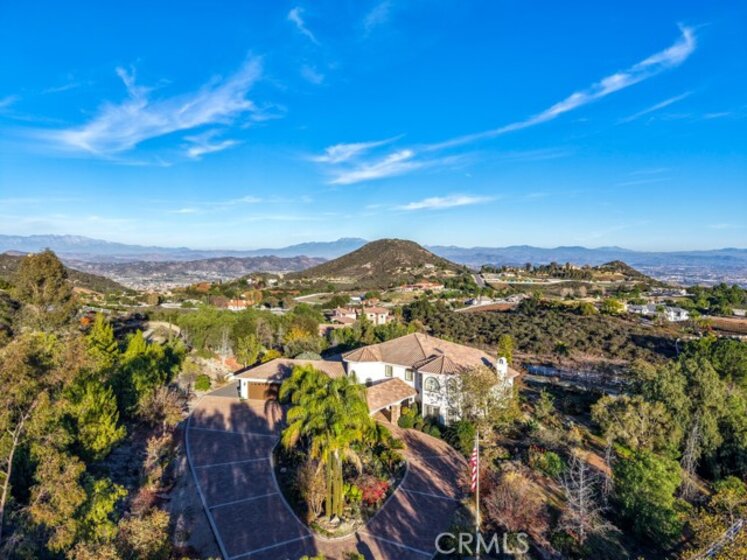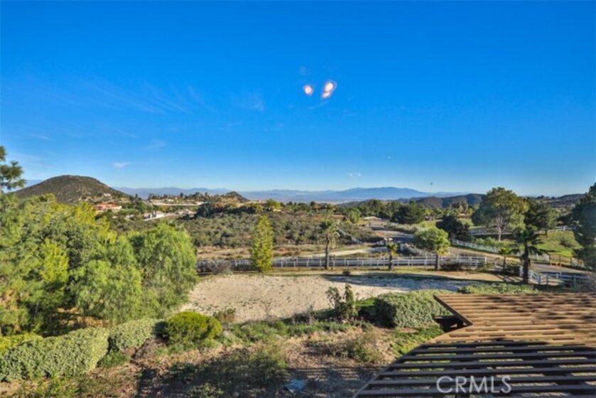 Stunning La Cresta Estate with Panoramic Valley, City-Light & Mountain Views Perched on just over five fully fenced acres, this exceptional custom La Cresta estate offers breathtaking views of the Temecula Valley, city lights, and surrounding mountains. A dramatic stone and wrought-iron gated entry leads to an expansive circular paver driveway, porte cochère, and elegant valet-style entrance. Inside, a grand foyer with soaring ceilings opens to an expansive great room featuring a fireplace, built-ins, and walls of windows framing the spectacular scenery. The open-concept layout includes a formal dining room, sunny breakfast nook, and a well-appointed kitchen with large island, built-in refrigerator, ample storage, and ideal for both entertaining and everyday living. The main-level primary suite offers a walk-in closet, dual vanities with makeup area, soaking tub, and spacious walk-in shower. Also on the main floor are a large office with closet, powder room, full bath, and an oversized laundry room with chute. Upstairs, a sweeping curved staircase leads to a secondary primary or junior suite with ensuite bath, two additional bedrooms, a full bath, and a light-filled bonus room/library. Outdoor living is equally impressive with covered patios, manicured grounds, fruit trees, walking paths, and a grassy area with room for a pool. At the highest point of the property, a viewing platform captures unforgettable 360-degree views and star-filled skies. Equestrian amenities include a large breezeway barn with three in-and-out stalls, tack room, workshop, paddocks, round pen, wash stations, and a separate living quarters featuring a bedroom, bathroom, kitchen, and living area with its own septic system—ideal for guests, caretakers, or rental potential. Additional fenced areas accommodate small livestock or gardening. This meticulously maintained, estate includes paid-off solar array, a tankless water heater, and mature landscaping throughout. Located in the desirable Santa Rosa Plateau, enjoy privacy, trails, and open space just minutes from schools, shopping, the 15 freeway, and Temecula Wine Country. A rare opportunity to own a refined equestrian estate offering luxury, versatility, and breathtaking views.