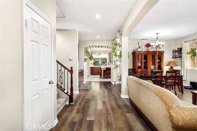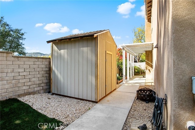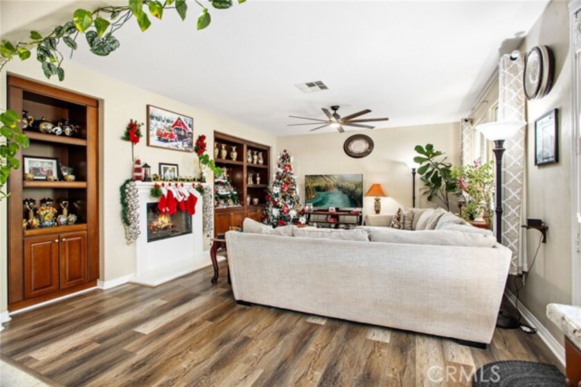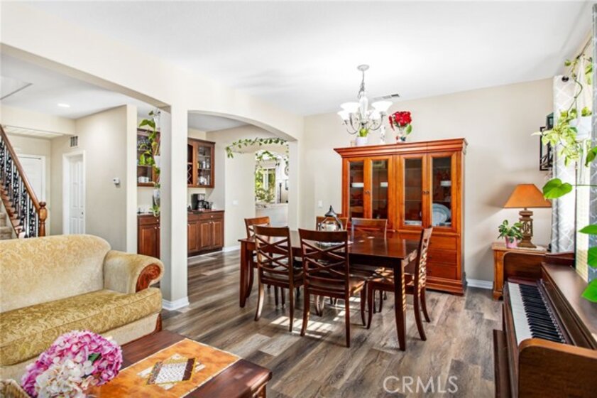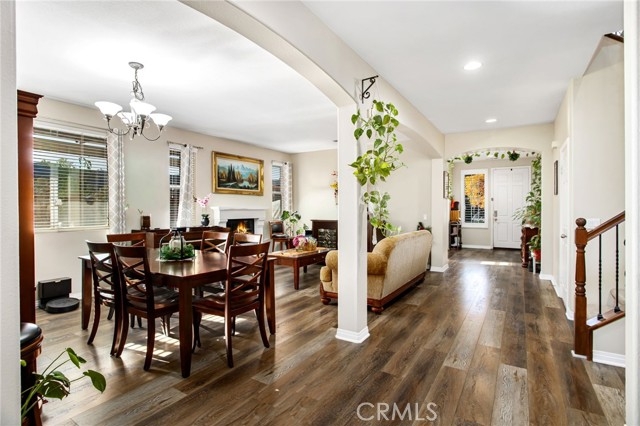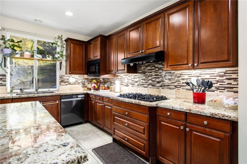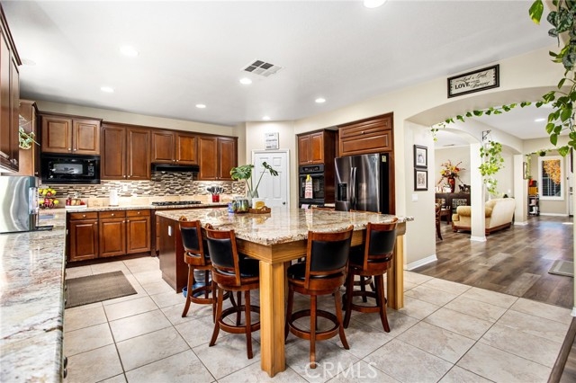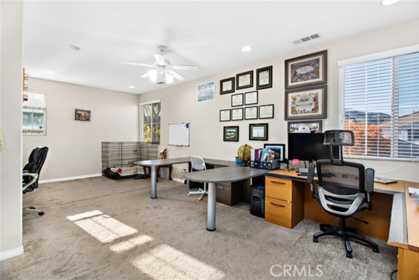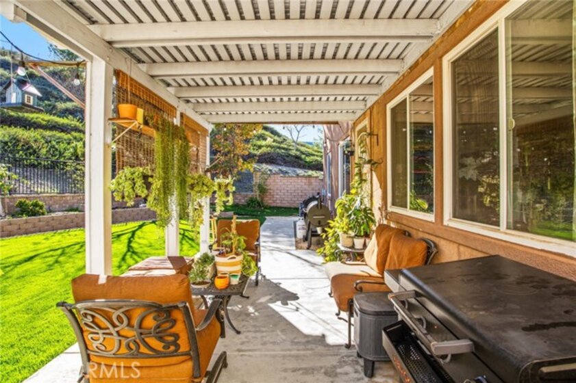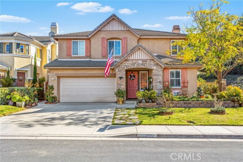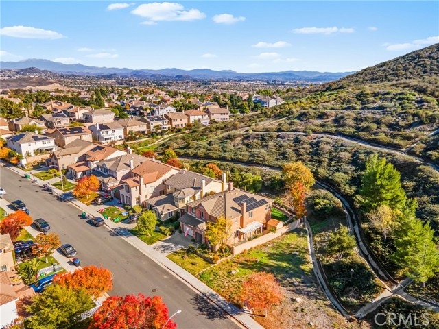 Nestled in the Copper Canyon community on the west side of Murrieta, this spacious 5-bedroom, 4-bath home offers 3,646 sq. ft. of well-planned living space with a private setting and only one neighboring property. The location is tucked against the hills and offers top rated schools. The main level includes a full bedroom and bathroom, ideal for guests, work space, or multi-generational needs. The entry opens to a large formal living and dining area with a fireplace and laminate wood flooring. The kitchen features a substantial center island, granite countertops, double ovens, a gas cooktop, tile flooring, and a walk-in pantry, and it flows into the family room with built-in cabinetry. Upstairs offers a generous loft that can serve as a media room, home office, or potential 6th bedroom. Secondary bedrooms each have access to well-appointed bathrooms with dual sinks and tub-shower combinations, including a Jack and Jill layout. The primary suite includes laminate wood floors, a large bathroom with dual sinks, a vanity, soaking tub, walk-in shower, and dual walk-in closets. The backyard features new sod, a covered patio structure, and a private setting with no direct neighbors on one side or behind. Additional highlights include a wrought iron staircase and a solar system to keep the energy bills low. A rare combination of size, functionality, and privacy in one of Murrieta’s most established west-side neighborhoods.