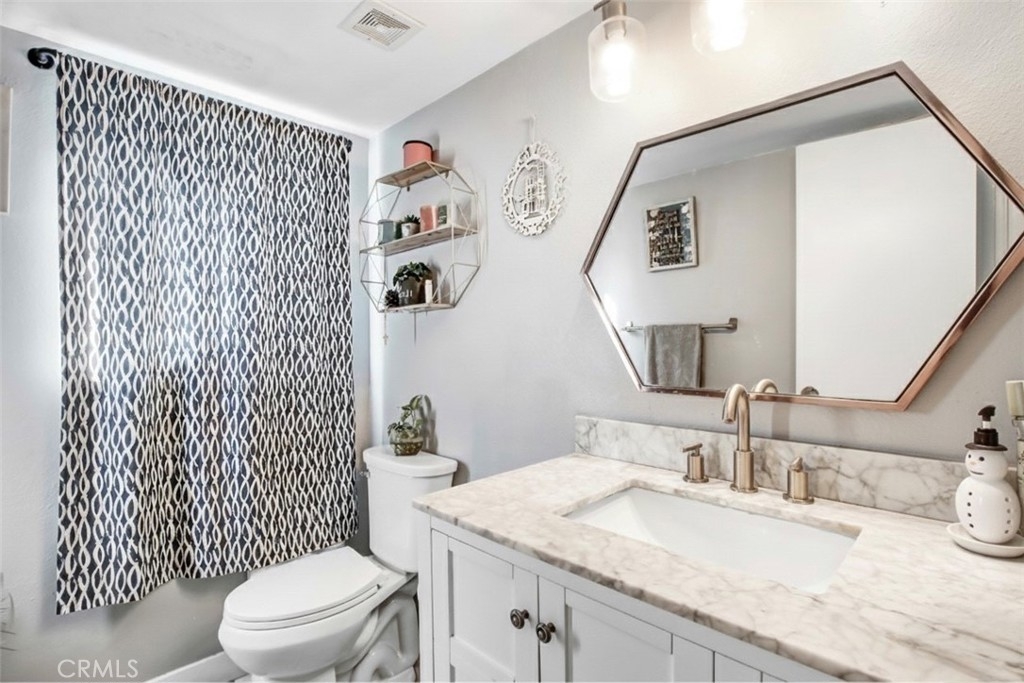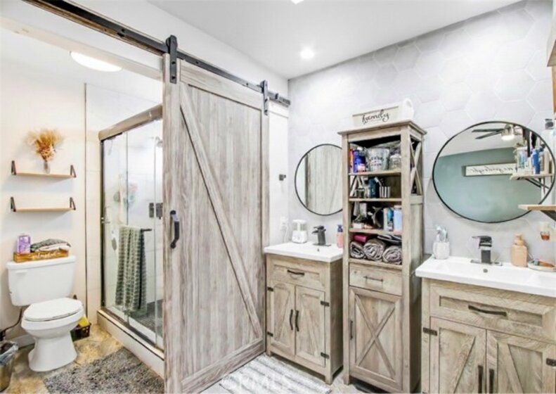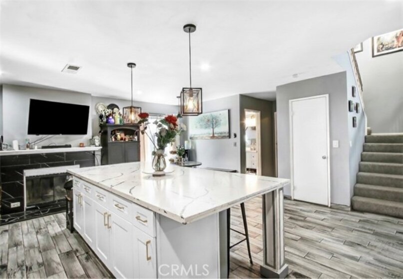 Welcome Home! Nestled in one of Murrieta's most coveted neighborhoods, this exquisite residence offers the best of family living: no HOA and access to top-tier schools, which makes this home the perfect family home. With upgraded tile flooring and abundant natural light throughout, this home is truly a bright and welcoming retreat. The heart of the home, the kitchen, has been thoughtfully updated with a spacious quartz-clad island perfect for hosting gatherings, a charming farmhouse sink, and ample counter space for creating amazing family dinners. A cozy fireplace in the kitchen adds a warm, inviting touch to the space. On the first floor, you'll find two generously sized bedrooms perfect for guests or multi-gen living for the parents, accompanied by a full bathroom with a walk-in shower for convenience, plus a separate half bath for guests. Ascend to the upper level to discover 2 good size bedrooms along with the Primary bedroom. The serene primary suite has vaulted ceilings that create an open, airy ambiance. The en-suite Primary Bathroom is a luxurious retreat, featuring beautiful sleek tile flooring, dual vanities, a spacious remodeled shower, and a beautifully crafted barn-style door for added charm and privacy. Don't miss out on this opportunity to own this gem! Schedule a showing today
