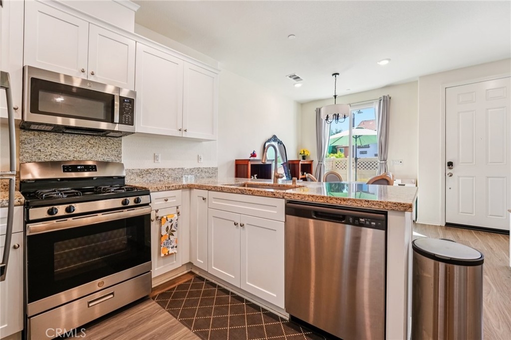 Like new, Built in 2021, 3 bed/2.5 bath home located in the desirable Solera Community is ready to be made yours! The main floor is open and spacious with recessed lights, a modern chandelier over the dining area, lots of natural light, as well as a Quiet Cool System. The kitchen features stainless steel appliances, granite counters and backsplash, and white cabinetry. All of the bedrooms are located on the 2nd floor, are generously sized, and have ceiling fans. The large primary suite offers a walk-in closet as well as private ensuite with dual sink vanity and full-size walk-in shower. There is also a full-size hall bathroom for the 2 secondary bedrooms to share, and a half bathroom on the main floor for guests. Also enjoy the gated front patio area with low maintenance concrete. This home also has Solar Panels, an attached 2-Car garage, and in-unit laundry room! Residents get to enjoy a sparkling pool and spa, covered patio area by the pool, BBQs, and a playground with picnic area. Conveniently located across the street from Murrieta Valley High School, as well as shopping, dining, and not far from the 15 & 215 Fwys. Set up your tour today!