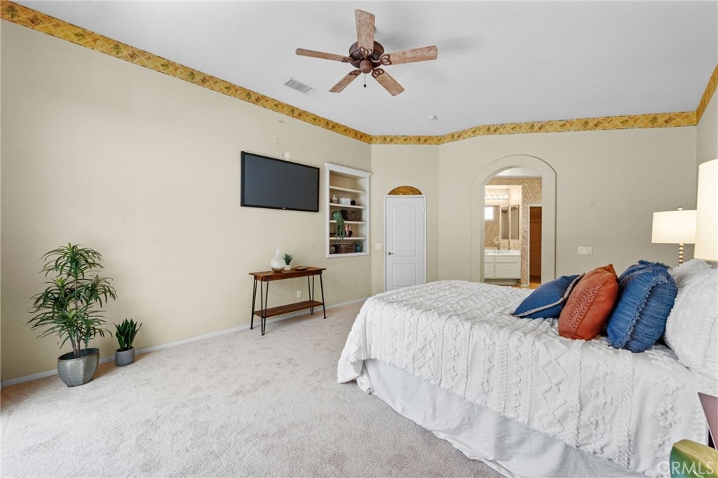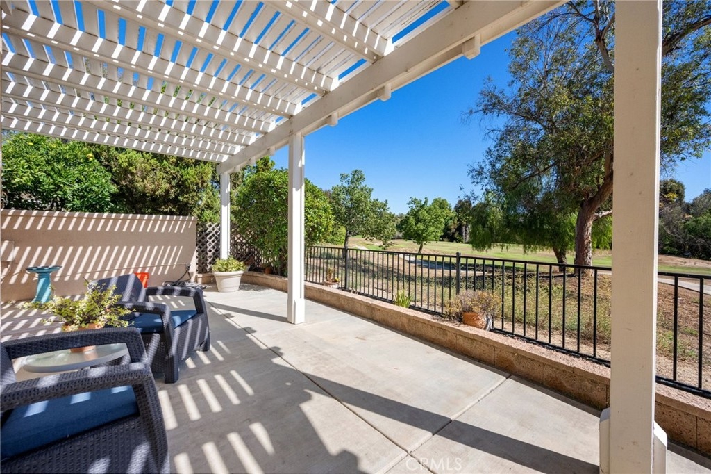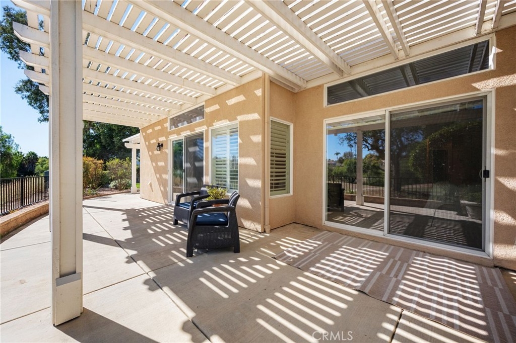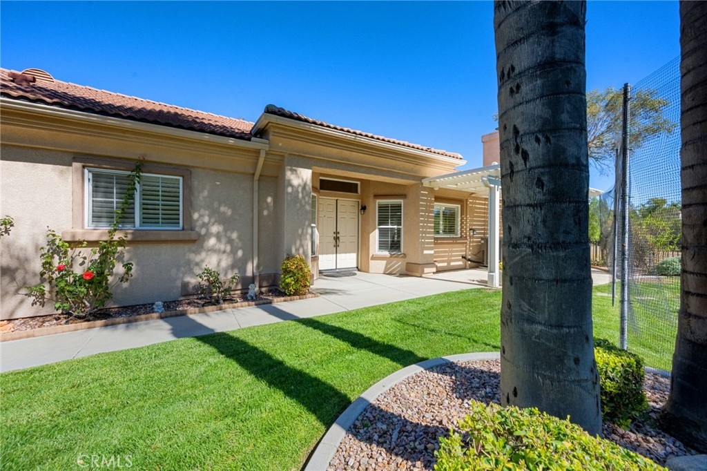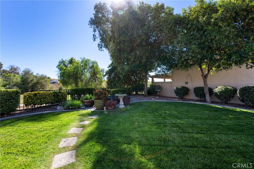 Welcome to one of the best locations ON the golf course at The Colony – Murrieta’s premier 55+ gated community! Enter through your private gate into a beautiful large yard—unique to this home’s location—before stepping inside this beautifully maintained single-story residence. Offering the perfect blend active adult living, this home sits on a quiet cul-de-sac overlooking the 1st fairway. The spacious, light-filled floor plan features vaulted ceilings, custom tile flooring, plantation shutters, and a cozy fireplace. The large well-appointed kitchen with a dining area features rich wood cabinetry, Corian countertops, Bosch dishwasher, stainless steel LG oven and built-in microwave, a six-burner gas cooktop, large pantry, and the stainless steel refrigerator is included. The primary suite features vaulted ceilings and opens directly to the covered wrap-around patio with golf course views. The en-suite bathroom offers dual sinks, a soaking tub, walk-in shower, separate vanity, and a large walk-in closet. Two additional bedrooms are generously sized with wood floors, and the second bathroom also includes a walk-in shower. The large laundry room provides abundant cabinetry, a deep sink, and comes complete with washer and dryer. You'll also enjoy direct access to the two-car garage with built-in cabinets. Residents of The Colony enjoy resort-style amenities including an 18-hole public golf course (fee), clubhouse, pool and spa, fitness center, tennis and pickleball courts, plus a vibrant calendar of social clubs and community events. The 24/7 guard-gated entry ensures peace of mind in a beautifully maintained setting. Ideally located near Temecula Valley’s renowned wineries, Old Town Temecula, shopping, dining, and top-rated medical facilities. Nearby hiking trails, scenic drives, and outdoor recreation make this the perfect place to enjoy the best of the active Southern California lifestyle.