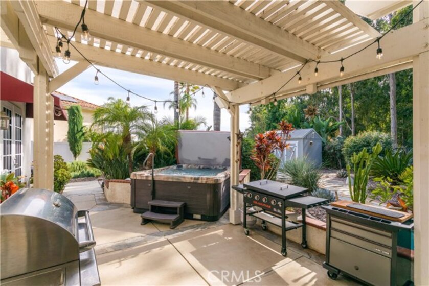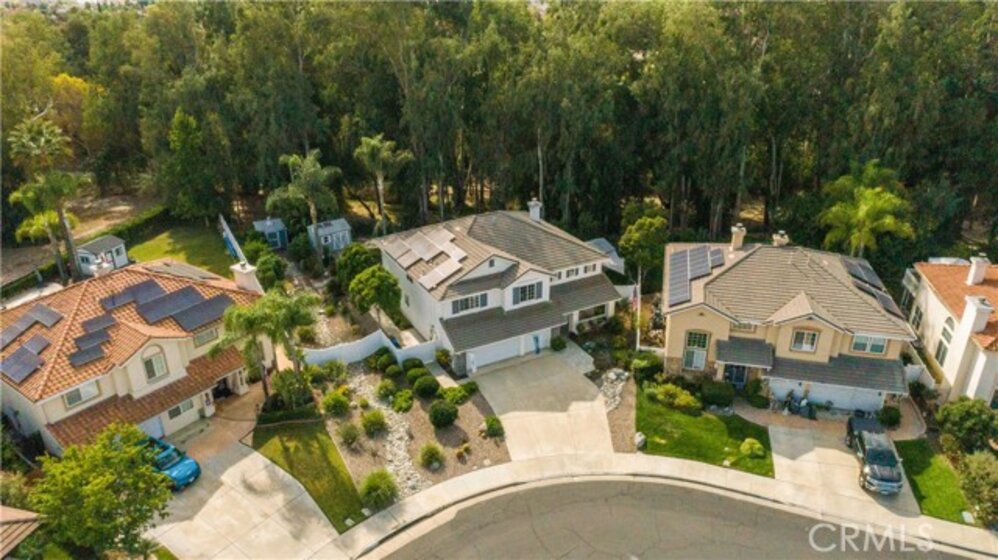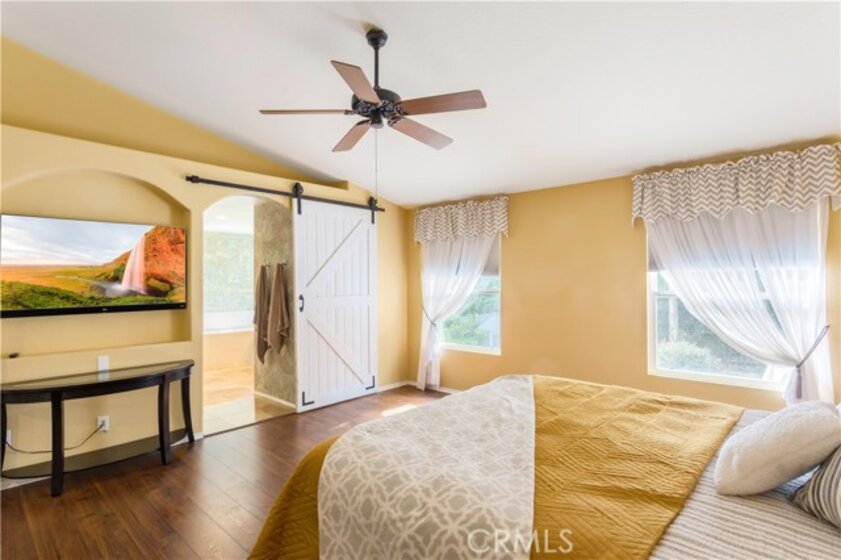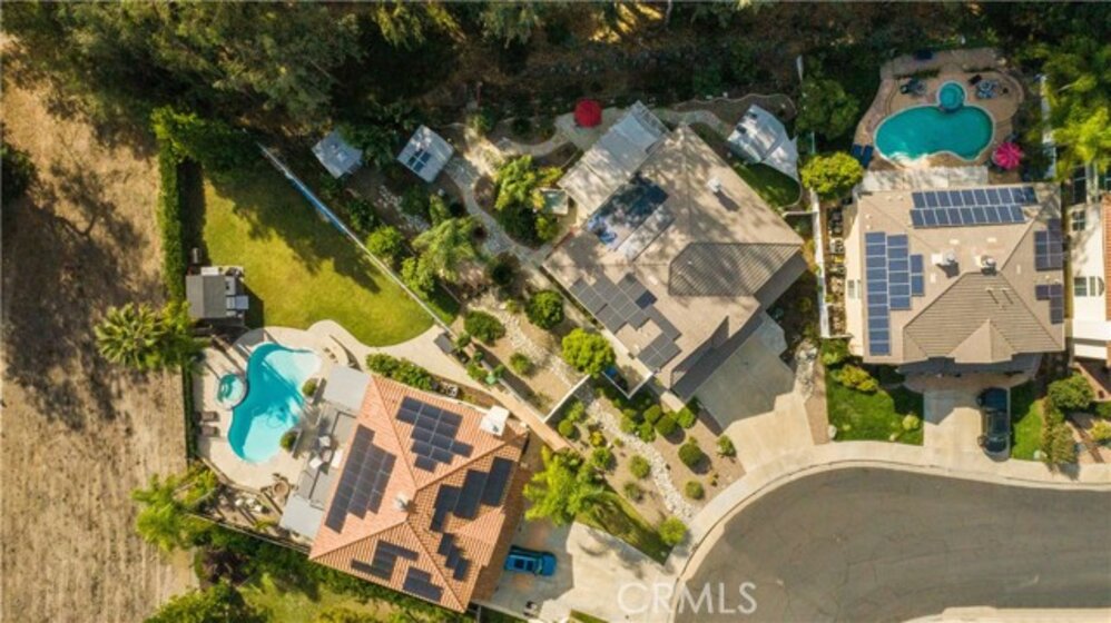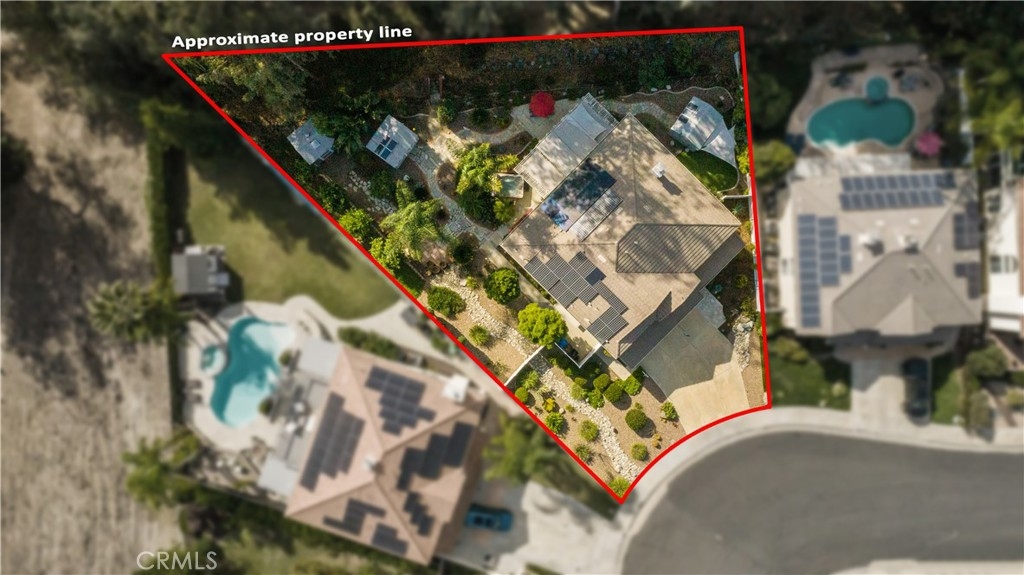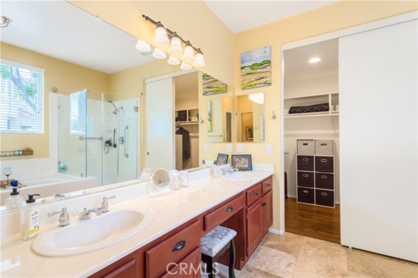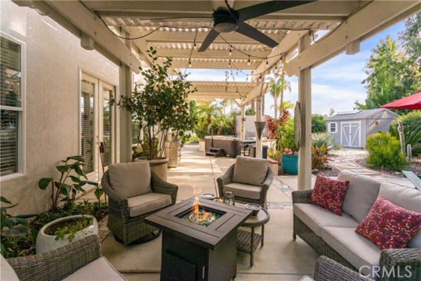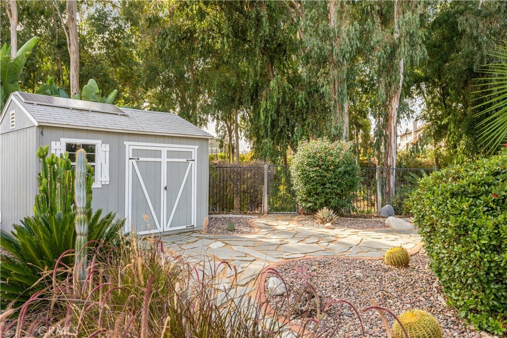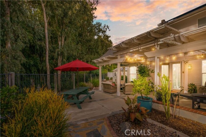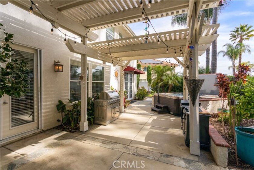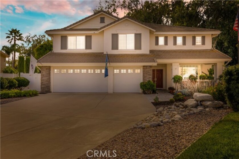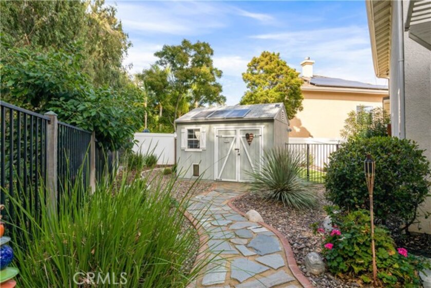 Welcome to a stunning and thoughtfully upgraded home featuring two primary suites, elegant finishes and a thoughtfully landscaped, low maintenance backyard oasis! A Monserrat Classic home in a well-established neighborhood. There is very little turnover in this tract because of the low taxes, great location and the quality of the homes. Pride of ownership is evident when you drive through the neighborhood. When you open the front door and walk into this beautiful home you are met with a vaulted ceiling and gorgeous Travertine floors. Family room downstairs has a fireplace and built-in bar area. The chef's kitchen has double convection ovens, newer appliances, hanging pot rack & recessed lighting. French doors lead outside to the backyard and covered patio. Downstairs primary bedroom also has French doors leading to the backyard. The ensuite has a large walk-in closet, separate tub and shower and dual sinks. Separate laundry room downstairs offers a lot of storage and a sink. Upstairs there is another spacious primary bedroom with a barn door separating the bedroom from the ensuite. The ensuite has a soaking jet tub, separate shower, his and her sinks. The expansive walk-in dressing room/closet has a vanity and mirror. Two more bedrooms & full bath upstairs. The loft has been set up as a media room complete w/ black out curtains, rustic accent wall, surround sound speakers, and built-in area that has a microwave and mini refrigerator. This very private backyard backs up to a green belt/park area and is landscaped with slate and river rocks. No grass! There is a hot tub, 3 sheds including a SHE shed and a tool shed that are solar powered, outdoor speakers, and a covered patio. Fruit trees include an orange, lemon, lime, and grapefruit. There is also an irrigation drip system. A gate in the back fence leads to the green belt and walking trails. On one side of the house there is a dog run that has artificial turf, a built-in water dispenser and a shaded area. The flooring throughout this stunning home consists of Travertine and Pergo Max Premium flooring excluding one bedroom that has carpet. The three-car garage has epoxy floors, a built-in work bench, & of storage. Permanent holiday lights are installed and ready to use through an app on your phone. Ring cameras throughout the house. 24 solar panels are paid for with 12 more being leased. Has the potential to be a 5 bedroom home. An electrical outlet in the garage is suitable for EV charging.