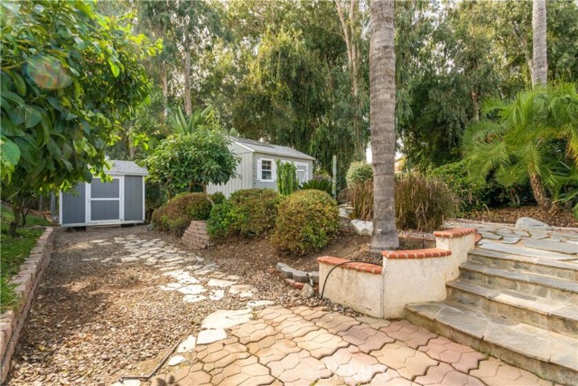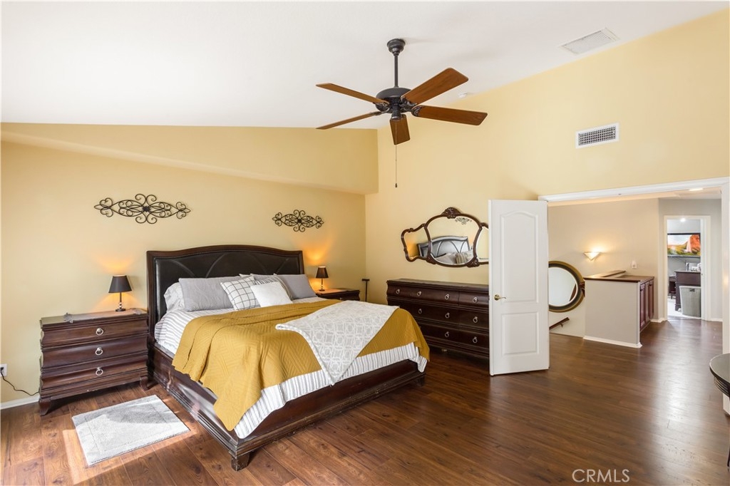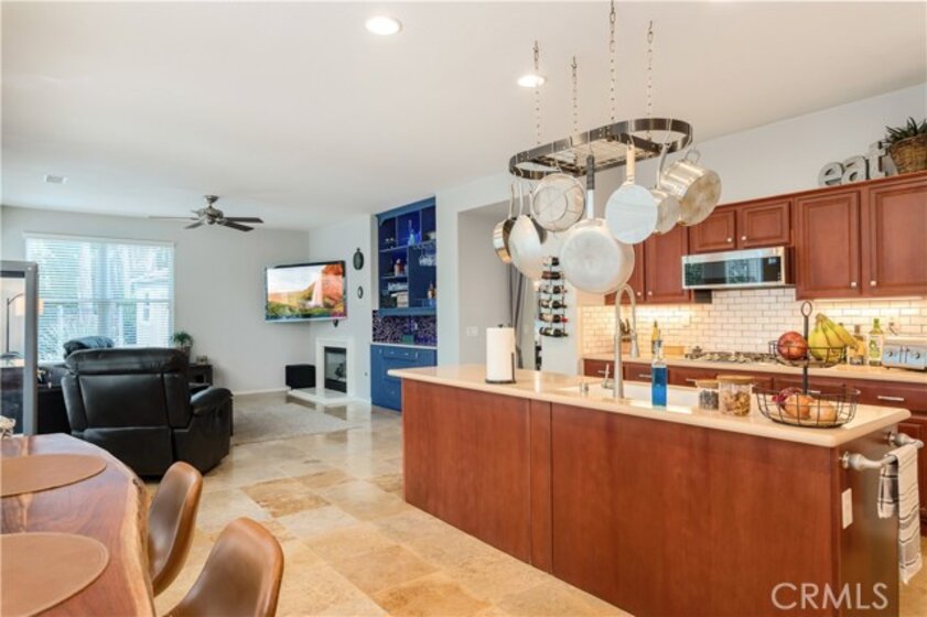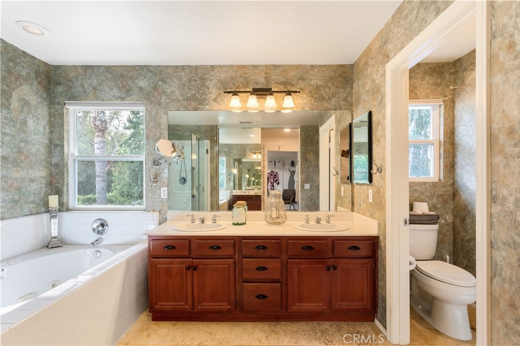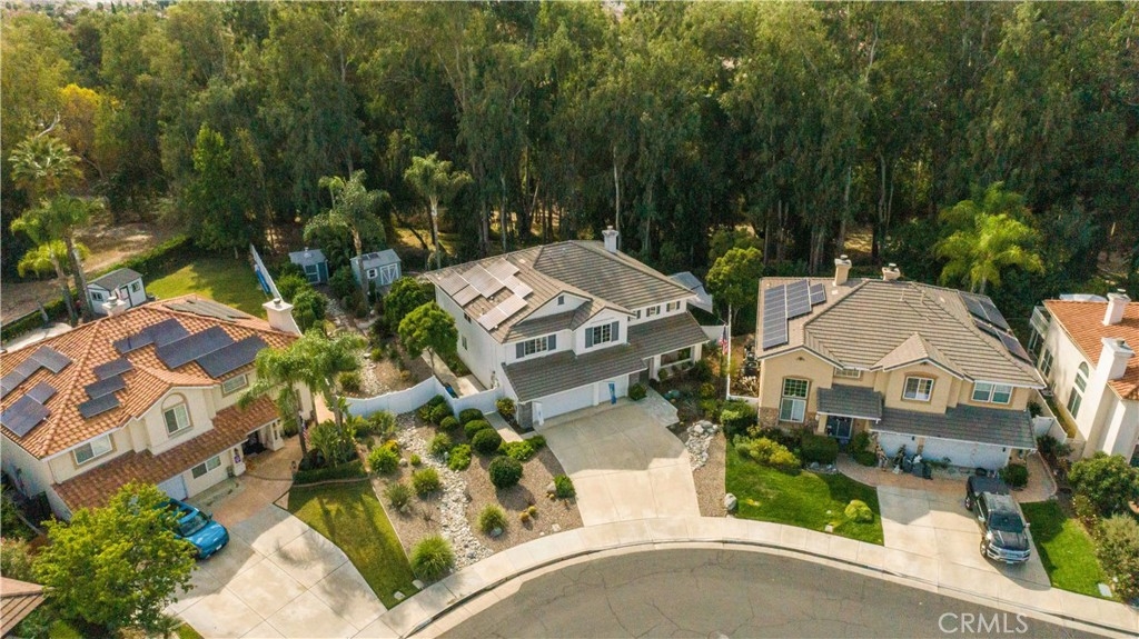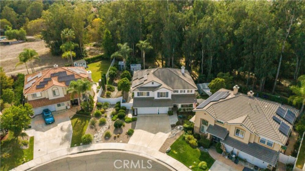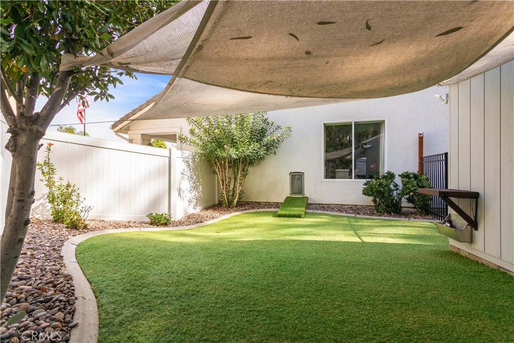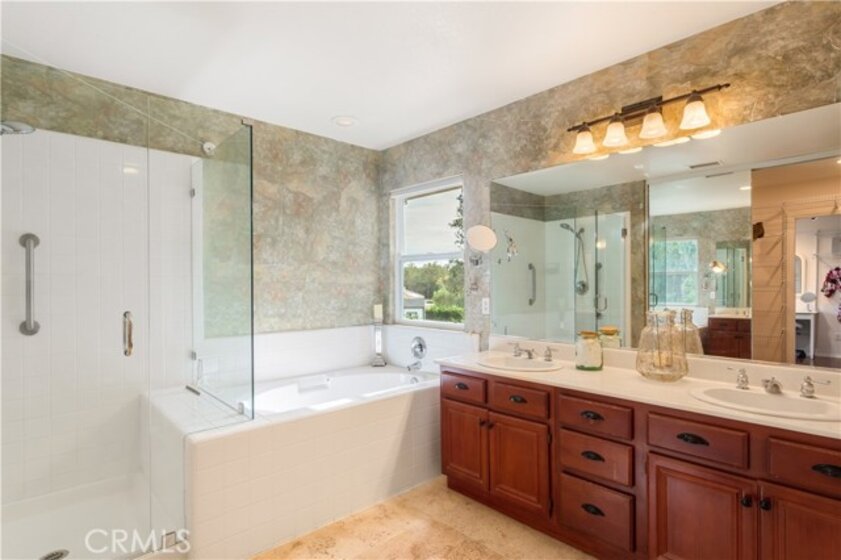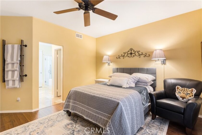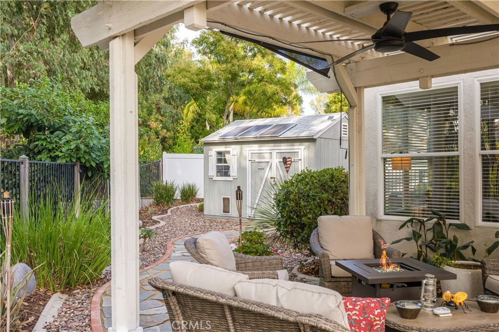 Welcome to a stunning and thoughtfully upgraded home featuring two primary suites, elegant finishes and a thoughtfully landscaped, low maintenance backyard oasis! A Monserrat Classic home in a well-established neighborhood. There is very little turnover in this tract because of the low taxes, great location and the quality of the homes. Pride of ownership is evident when you drive through the neighborhood. When you open the front door and walk into this beautiful home you are met with a vaulted ceiling and gorgeous Travertine floors. Family room downstairs has a fireplace and built-in bar area. The chef's kitchen has double convection ovens, newer appliances, hanging pot rack & recessed lighting. French doors lead outside to the backyard and covered patio. Downstairs primary bedroom also has French doors leading to the backyard. The ensuite has a large walk-in closet, separate tub and shower and dual sinks. Separate laundry room downstairs offers a lot of storage and a sink. Upstairs there is another spacious primary bedroom with a barn door separating the bedroom from the ensuite. The ensuite has a soaking jet tub, separate shower, his and her sinks. The expansive walk-in dressing room/closet has a vanity and mirror. Two more bedrooms & full bath upstairs. The loft has been set up as a media room complete w/ black out curtains, rustic accent wall, surround sound speakers, and built-in area that has a microwave and mini refrigerator. This very private backyard backs up to a green belt/park area and is landscaped with slate and river rocks. No grass! There is a hot tub, 3 sheds including a SHE shed and a tool shed that are solar powered, outdoor speakers, and a covered patio. Fruit trees include an orange, lemon, lime, and grapefruit. There is also an irrigation drip system. A gate in the back fence leads to the green belt and walking trails. On one side of the house there is a dog run that has artificial turf, a built-in water dispenser and a shaded area. The flooring throughout this stunning home consists of Travertine and Pergo Max Premium flooring excluding one bedroom that has carpet. The three-car garage has epoxy floors, a built-in work bench, & of storage. Permanent holiday lights are installed and ready to use through an app on your phone. Ring cameras throughout the house. 24 solar panels are paid for with 12 more being leased. Has the potential to be a 5 bedroom home. An electrical outlet in the garage is suitable for EV charging.