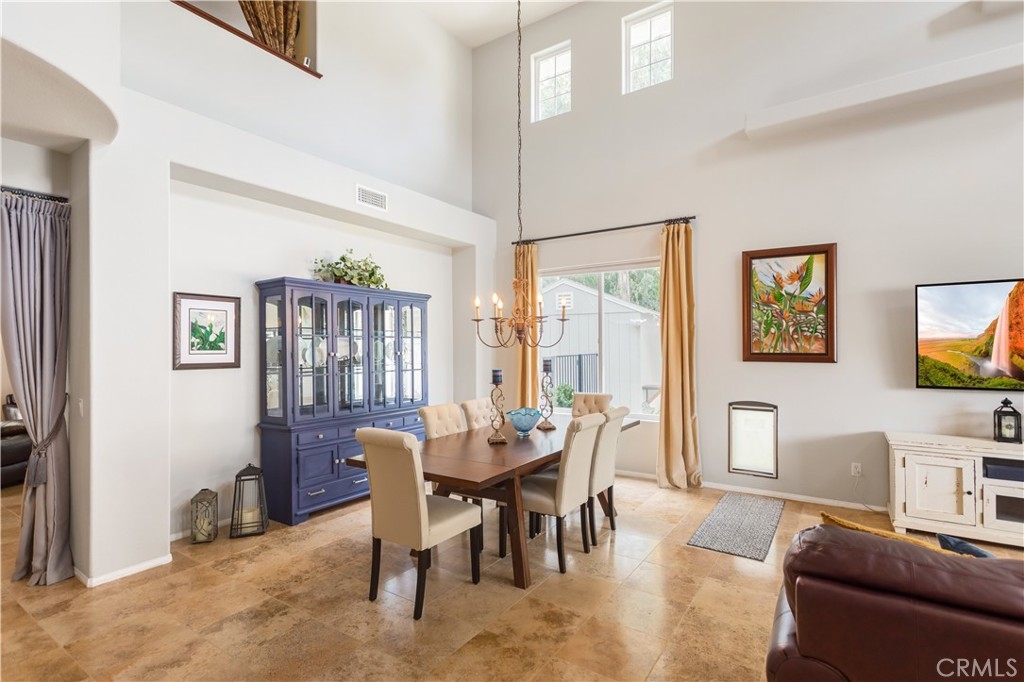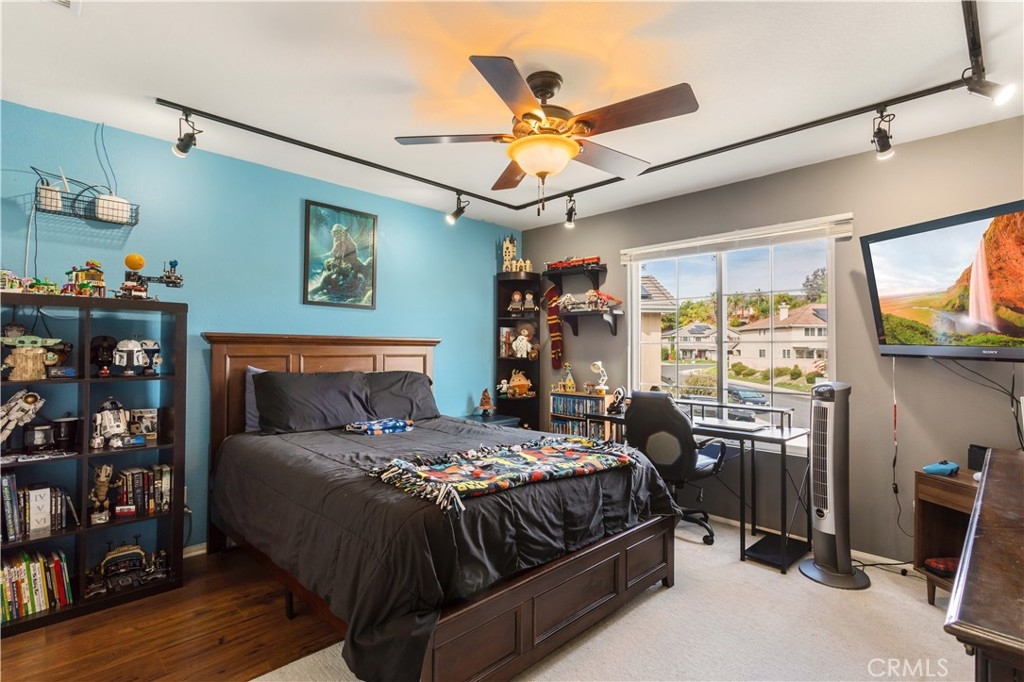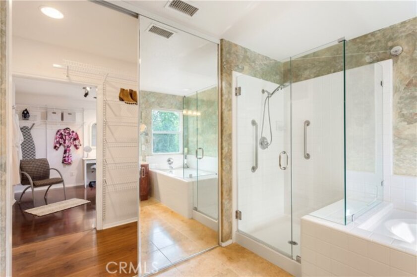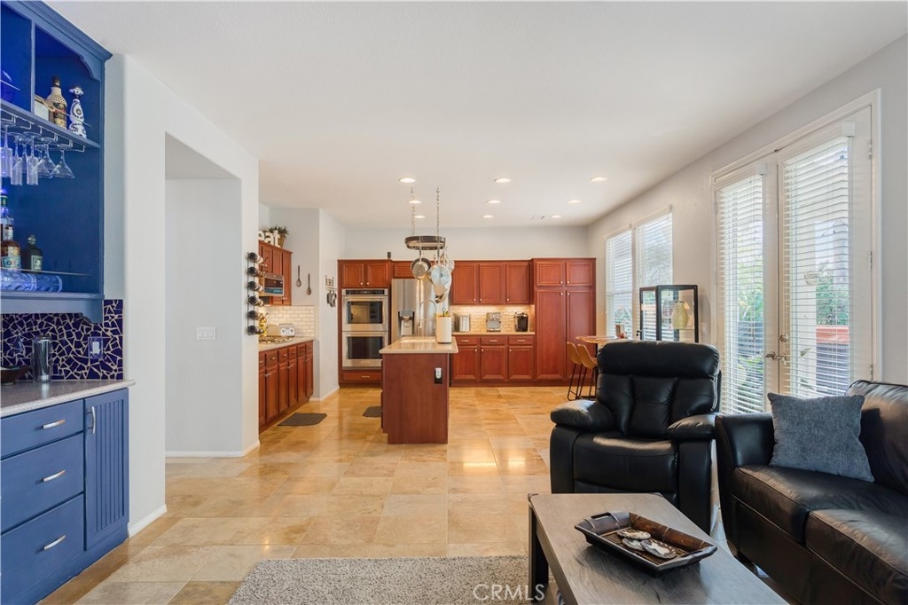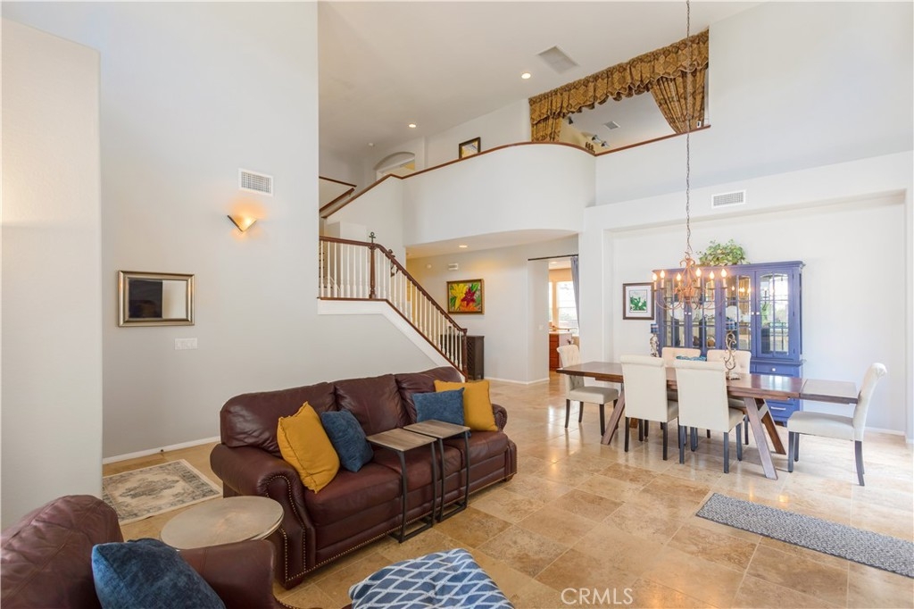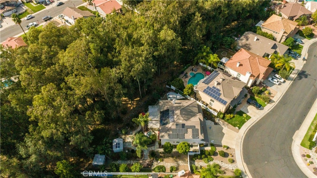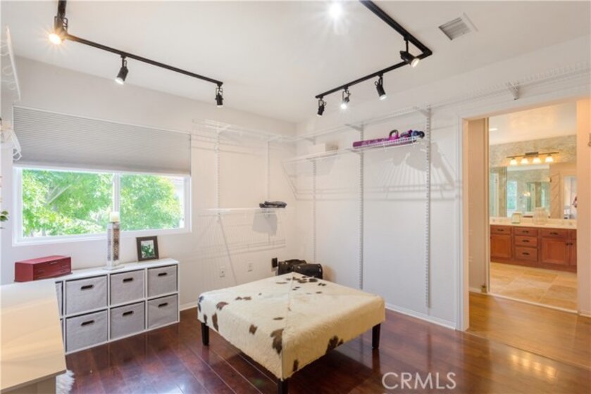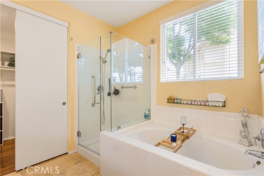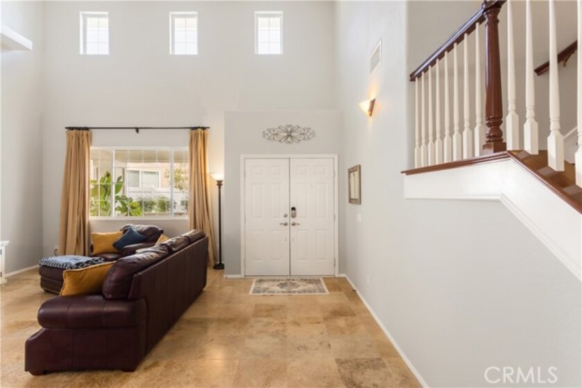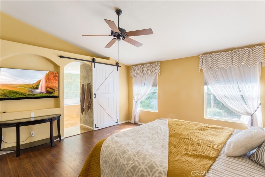 Welcome to a stunning and thoughtfully upgraded home featuring two primary suites, elegant finishes and a thoughtfully landscaped, low maintenance backyard oasis! A Monserrat Classic home in a well-established neighborhood. There is very little turnover in this tract because of the low taxes, great location and the quality of the homes. Pride of ownership is evident when you drive through the neighborhood. When you open the front door and walk into this beautiful home you are met with a vaulted ceiling and gorgeous Travertine floors. Family room downstairs has a fireplace and built-in bar area. The chef's kitchen has double convection ovens, newer appliances, hanging pot rack & recessed lighting. French doors lead outside to the backyard and covered patio. Downstairs primary bedroom also has French doors leading to the backyard. The ensuite has a large walk-in closet, separate tub and shower and dual sinks. Separate laundry room downstairs offers a lot of storage and a sink. Upstairs there is another spacious primary bedroom with a barn door separating the bedroom from the ensuite. The ensuite has a soaking jet tub, separate shower, his and her sinks. The expansive walk-in dressing room/closet has a vanity and mirror. Two more bedrooms & full bath upstairs. The loft has been set up as a media room complete w/ black out curtains, rustic accent wall, surround sound speakers, and built-in area that has a microwave and mini refrigerator. This very private backyard backs up to a green belt/park area and is landscaped with slate and river rocks. No grass! There is a hot tub, 3 sheds including a SHE shed and a tool shed that are solar powered, outdoor speakers, and a covered patio. Fruit trees include an orange, lemon, lime, and grapefruit. There is also an irrigation drip system. A gate in the back fence leads to the green belt and walking trails. On one side of the house there is a dog run that has artificial turf, a built-in water dispenser and a shaded area. The flooring throughout this stunning home consists of Travertine and Pergo Max Premium flooring excluding one bedroom that has carpet. The three-car garage has epoxy floors, a built-in work bench, & of storage. Permanent holiday lights are installed and ready to use through an app on your phone. Ring cameras throughout the house. 24 solar panels are paid for with 12 more being leased. Has the potential to be a 5 bedroom home. An electrical outlet in the garage is suitable for EV charging.