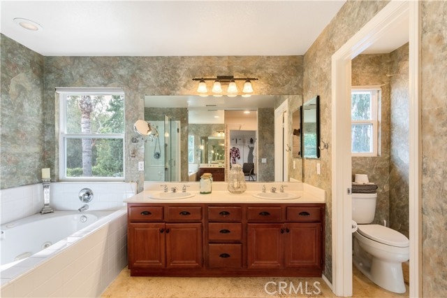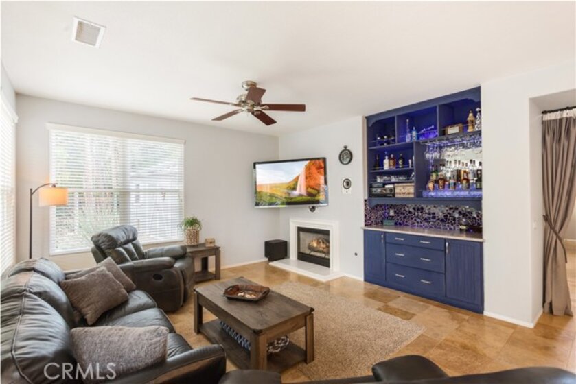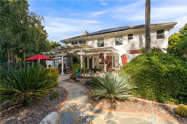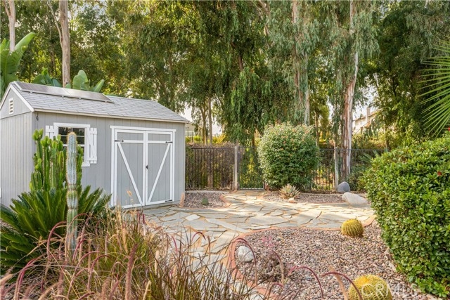Welcome to this stunning and thoughtfully upgraded home featuring two primary suites, elegant finishes and a thoughtfully landscaped, low maintenance backyard oasis! A Monserrat Classic home in a well-established neighborhood. There is very little turnover in this tract because of the low taxes, great location and the quality of the homes. Pride of ownership is evident when you drive through the neighborhood. When you open the front door and walk into this beautiful home you are met with a vaulted ceiling and gorgeous Travertine floors. The family room downstairs has a fireplace and built-in bar area. There is a chef's kitchen complete with double convection ovens, newer appliances, hanging pot rack and recessed lighting. French doors lead outside to the backyard and covered patio. The downstairs primary bedroom also has French doors leading to the backyard. The ensuite has a large walk-in closet, separate tub and shower and dual sinks. Separate laundry room downstairs that has a lot of storage and a sink. Upstairs there is another spacious primary bedroom complete with a barn door separating the bedroom from the ensuite. The ensuite has a soaking jet tub, separate shower, his and her sinks. There is an expansive walk-in dressing room/closet with vanity and mirror. Two more bedrooms & full bath upstairs. The loft has been set up as a media room complete w/ black out curtains, rustic accent wall, surround sound speakers, and built-in area that has a microwave and mini refrigerator. This very private backyard backs up to a green belt/park area and is landscaped with slate and river rocks. No grass! There is a hot tub, 3 sheds including a SHE shed and a tool shed that are solar powered, outdoor speakers, and a covered patio. Fruit trees include an orange, lemon, lime, and grapefruit. There is also an irrigation drip system. A gate in the back fence leads to the green belt and walking trails. On one side of the house there is a dog run that has artificial turf, a built-in water dispenser and a shaded area. The flooring throughout this stunning home consists of Travertine and Pergo Max Premium flooring excluding one bedroom that has carpet. The three-car garage has epoxy floors, a built-in work bench, and lots of storage. Permanent holiday lights are installed and ready to use through an app on your phone. Ring cameras throughout the house. 24 solar panels are paid for with 12 more being leased. Has the potential to be a 5 bedroom home.