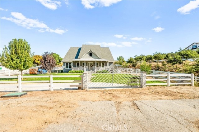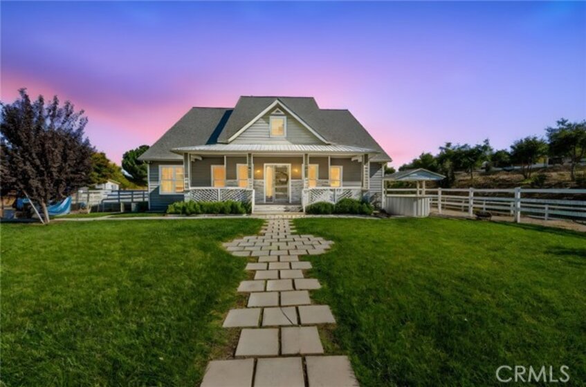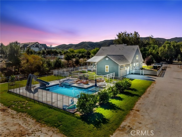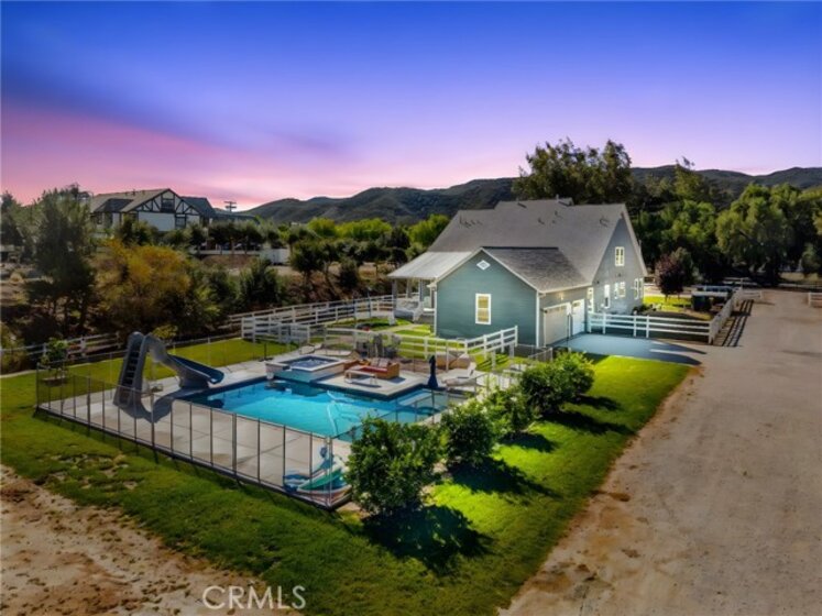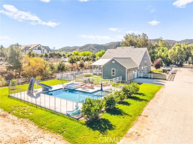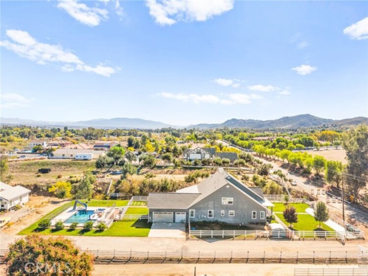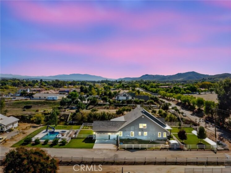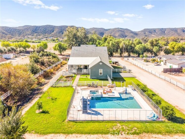 Luxury Farmhouse Living, Entertainer’s Pool, Wine Cellar & Mountain Views! Welcome to this stunning custom 4,000 SF 6 BR + Loft (used as 7th BR) / 4 BA home just west of historic Old Town Murrieta with gorgeous mountain & creek-bed views. Single-level living with large upstairs loft and seamless indoor-outdoor flow. Chef’s Kitchen features custom all wood soft-close cabinetry, 6-burner double oven range with 48” hood & pot filler, 5’x10’ Bianco Carrara marble island with wine fridge, microwave drawer, and storage galore. Enjoy your own wine tasting room with 11’x11’ wine cellar, perfect for entertaining. Open the 20’ moving glass wall to 440 SF of covered outdoor living space with misters, fan, & surround sound. Relax in the pebble-tec pool & spa with top of the line slide and secure safety fence. Home includes premium LVP flooring, energy-efficient windows, marble bathrooms, and fire resistant siding. Spacious primary suite with barn doors, walk-in closet, dual rain head shower, soaking tub & bidet. Property upgrades include state of the art well pump with artesian spring water, fruit bearing trees, raised bed garden, predator proof fencing, chicken coop with established laying hens (optional), and solar mounted security system. Loft is enclosed with locking door and plumbed for kitchenette or bath. Zoned for agriculture, so bring your animals! 3-car garage (25’x33’x13’H) fits boat or small RV + RV parking. Two tankless water heaters, advanced fire abatement sprinkler system, and neighbors who “mind their own business.” This property perfectly combines luxury, privacy, and the charm of country living, minutes from town!