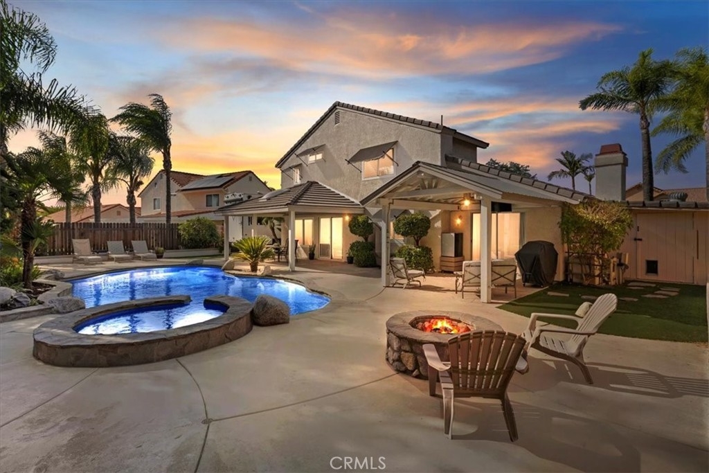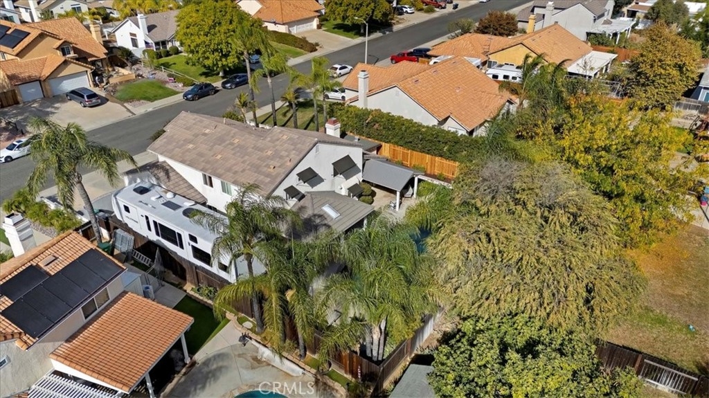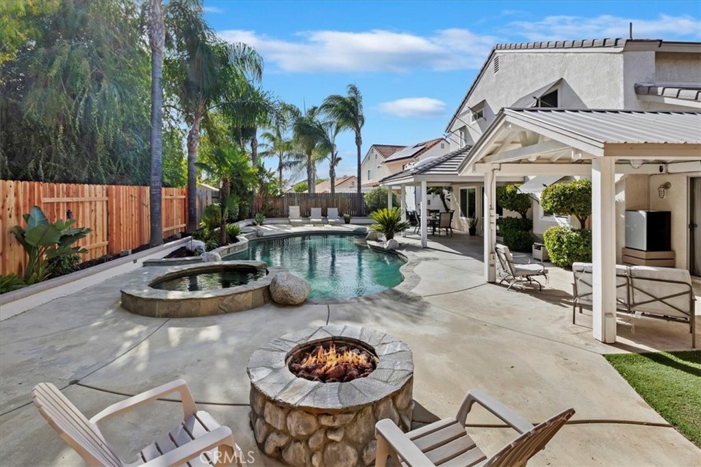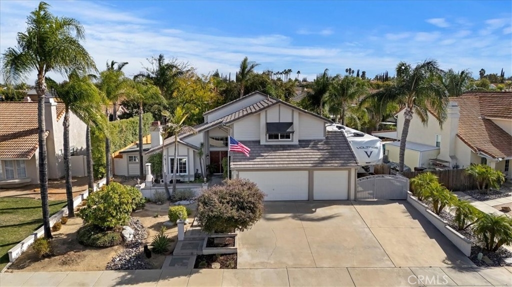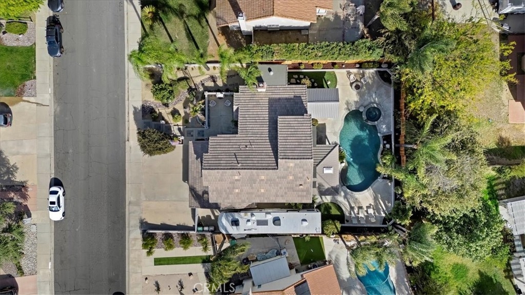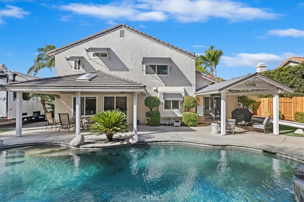 Stunning & immaculate 2200 sf pool home with RV parking on a large lot! This Murrieta beauty has 4 bedrooms plus a large game/bonus room (can easily be turned into a 5th bedroom) with an oversized 3 car garage. Ample RV parking with electrical hookups & wrought iron gate access. Impressive curb appeal with the meticulous landscaping, newer exterior paint, custom awnings & flagstone walkway with lighted pilasters. You are greeted by an inviting courtyard at the entry with a calming fountain and outdoor fireplace. Dramatic entry through double doors into a foyer with stone flooring and high ceilings. Just some of the features inside the house include plantation shutters, wrought iron stair bannisters, crown molding, ceiling fans throughout and 3 Quiet Cool house fans for energy efficiency. Large living room has a slate fireplace and is ready for those cozy family nights. Sliders from the dining area to the covered exterior area to help bring indoor and outdoor space together. Bright & sunny kitchen with tile counters and decorative backsplash that opens to the family room with surround sound speakers. There is a main floor bedroom with luxury plank vinyl flooring, mirrored closet doors and plantation shutters. Upstairs has 3 bedrooms plus a large bonus/game room. The bonus room is complete with surround sound speakers, plantation shutters and the entertainment cabinet stays. Spacious primary bedroom with two closets and TV that conveys. Three car garage with epoxy flooring, 220 outlet, and built-in cabinets. Staycation in this amazing backyard complete with a large custom Pebble-tec pool and spa with flagstone accent and variable speed pool pump. Extensive hardscape throughout the back that includes seat walls for easy entertaining! There are two stately custom-built patio covers with solid covers, TV that stays, lights, fan and impressive wood detail! Get the s'more ingredients ready to sit around the built -in firepit during the beautiful Murrieta evenings! The side yard is an exceptionally well-built custom storage room that has so many options for use (approx. 11 x 7.5). Some of the fence in the back is brand new. No need to rent RV space when you have your own RV parking with 30 amp electrical and clean out. All this in the highly desirable Rancho Acacias community with no HOA's and very low tax rate. So close to shops, restaurants, parks, schools and easy access to 15 and 215 freeway....excellent central location. Welcome home to this beauty!