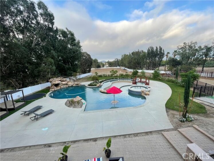 One-of-a-Kind Resort Estate! Welcome to an extraordinary private estate offering a rare blend of architectural grandeur, resort-level amenities, and multi-residence flexibility on 4.85 lushly landscaped acres zoned for residential rural living with equestrian potential. Designed for elevated living and unforgettable entertaining, this property features two separate single-family homes anchored by a world-class pool, spa, and lazy river experience rarely found in Southern California. The main residence spans three impressive levels and showcases refined craftsmanship, scale, and thoughtful design throughout. The home offers five spacious bedrooms, including three upstairs bedrooms featuring a Jack-and-Jill bath plus a private en-suite, and two luxurious primary suites on the main level—one with its own private entrance, ideal for multigenerational living, guests, or executive accommodations. The main level is appointed with an elegant formal dining room, a private office, and an expansive chef’s kitchen equipped with Sub-Zero refrigeration and high-end appliances, thoughtfully designed to serve both daily living and large-scale entertaining. Two laundry rooms—one upstairs and one downstairs—add everyday convenience and functionality. Living spaces flow seamlessly to a stunning elevated deck overlooking the resort grounds, offering panoramic views of the pool, lazy river, and landscaped acreage below. The lower level transforms into a private entertainment retreat, featuring a custom movie theater, fully equipped gym, bar, game room, and an additional full bath—creating the ultimate destination for hosting, relaxation, and recreation. Outdoors, the estate truly shines. A resort-caliber pool and spa with a winding lazy river serve as the centerpiece, surrounded by expansive patios, lounging areas, and mature landscaping that delivers both beauty and privacy. The nearly five acres of usable land provide endless opportunities for equestrian use, gardens, recreation, or future enhancements, all while maintaining a serene, secluded atmosphere. A separate second residence offers exceptional versatility—perfect for extended family, guests, or private use—completing this rare compound-style offering. This is not simply a home, but a destination estate—where luxury, lifestyle, and privacy converge. An exceptional opportunity for the discerning buyer seeking space, flexibility, and resort living in one of Murrieta’s most coveted residential rural settings.