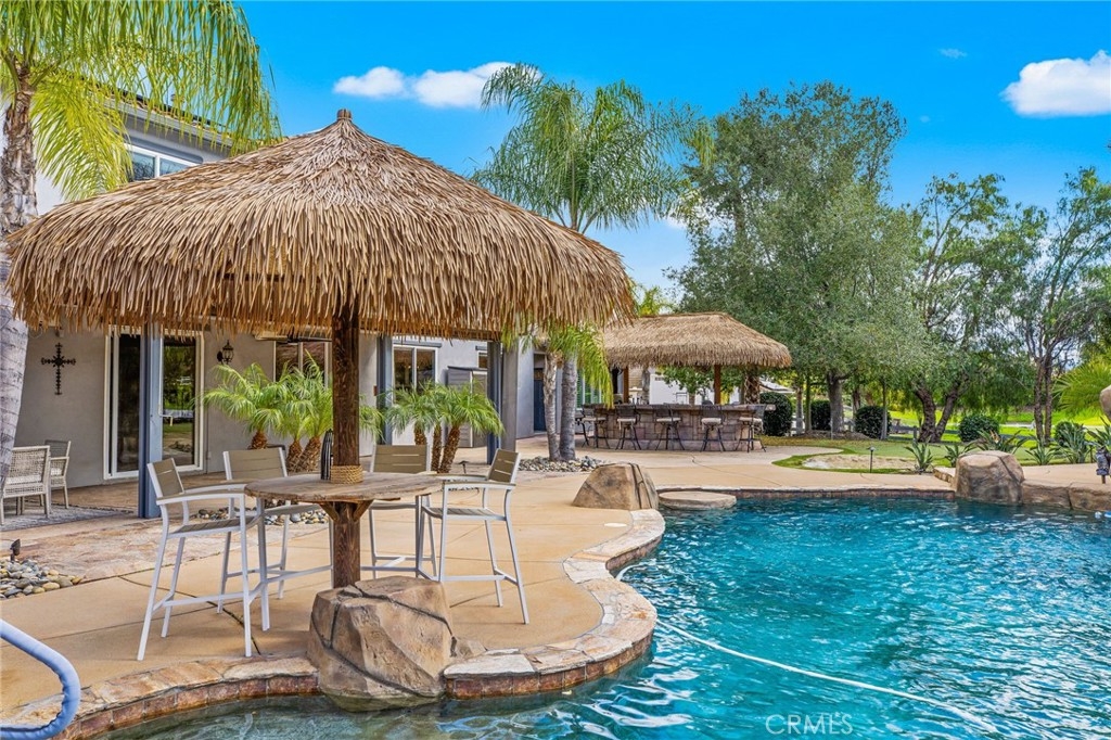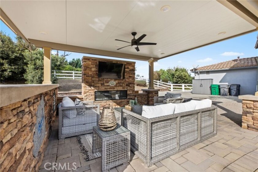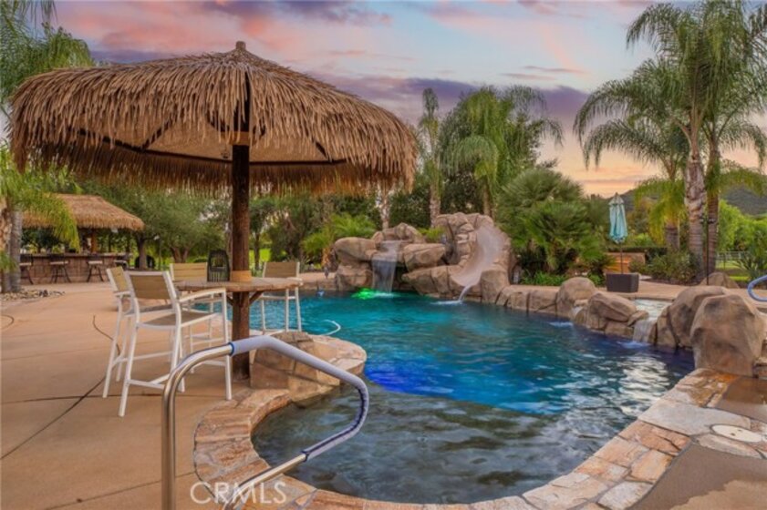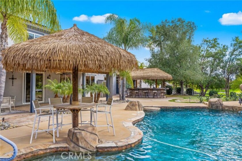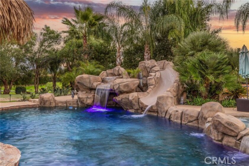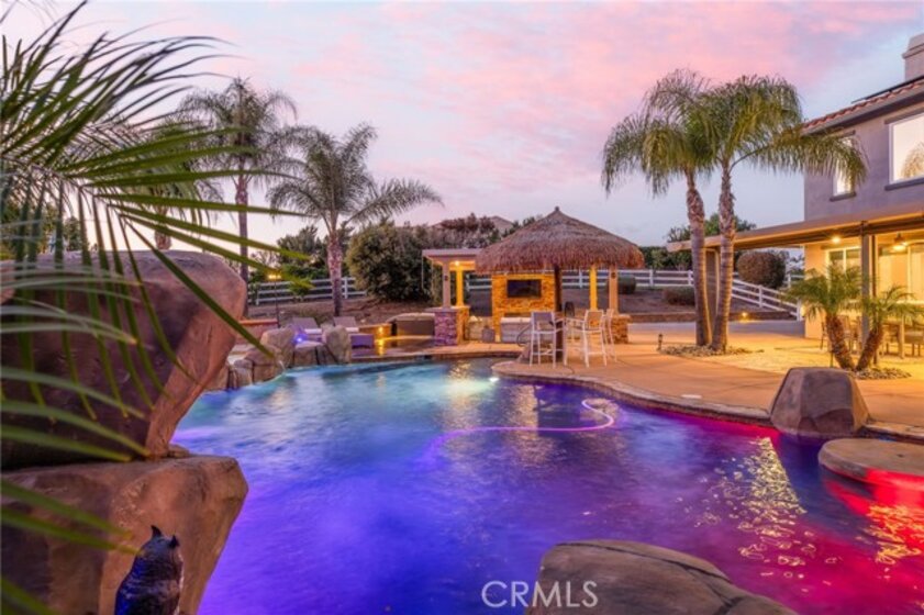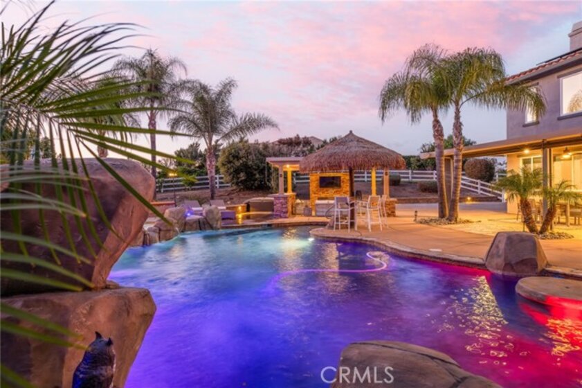 Located behind the gates of the prestigious Wynfield Estates, this exceptional residence offers a rare blend of refined luxury, privacy, and expansive ranch-style living. A private gated entrance, manicured landscaping, and striking curb appeal immediately reflect the pride of ownership throughout the estate. The thoughtfully designed home offers 6 bedrooms and 5.5 bathrooms, including a highly desirable downstairs junior suite and a separate downstairs ensuite with a full bathroom and built-ins, ideally suited for NextGen living with its own private entrance, along with a dedicated downstairs office. A custom double-door entry welcomes you into a light-filled, open floor plan that balances elegance with comfort. Formal living spaces include a private sitting room with a fireplace and a sophisticated dining room featuring a built-in bar and custom cabinetry, creating the perfect setting for entertaining. The expansive, fully remodeled kitchen serves as the heart of the home, offering a walk-in pantry, generous bar seating, and sweeping views from every window. The kitchen opens seamlessly to the spacious family room, highlighted by soaring ceilings and a statement fireplace. Upstairs, oversized bedrooms and well-appointed bathrooms create an ideal and functional layout. The primary suite is a true retreat, complete with its own fireplace, dual walk-in closets with custom built-ins, a luxurious soaking tub, and a separate walk-in shower. Designed for resort-style living, the outdoor spaces are truly exceptional. The flat, fully usable grounds feature a saltwater pool with spa grotto and rock slide, expansive views, an oversized built-in firepit with seating, and a pool cabana with its own fireplace. Entertaining is effortless with a full outdoor kitchen and BBQ, multiple seating areas, a custom palapa, dedicated area for family movie nights, and two custom covered patios. The property is fully gated and beautifully landscaped, complete with a putting green and additional flat land ideal for horses or the future addition of an ADU. Completing the estate is an immaculate four-car garage with epoxy floors and ample storage. Wynfield Estates is a private, gated enclave of custom homes offering equestrian zoning, 2.5-acre parcels, and a peaceful ranch-style lifestyle—just minutes from shopping, dining, and everyday conveniences.