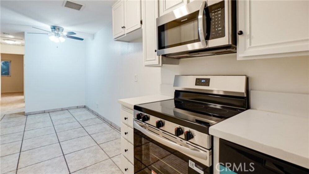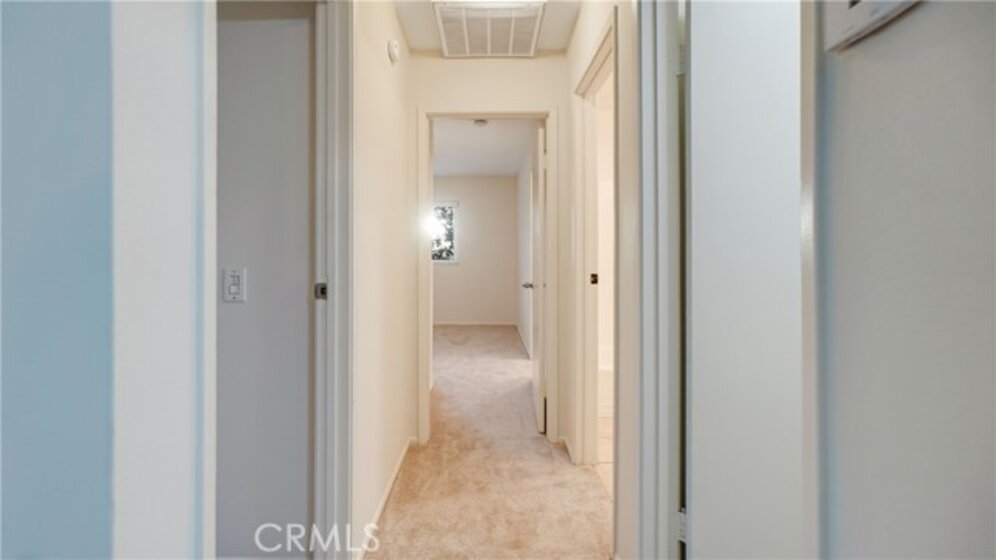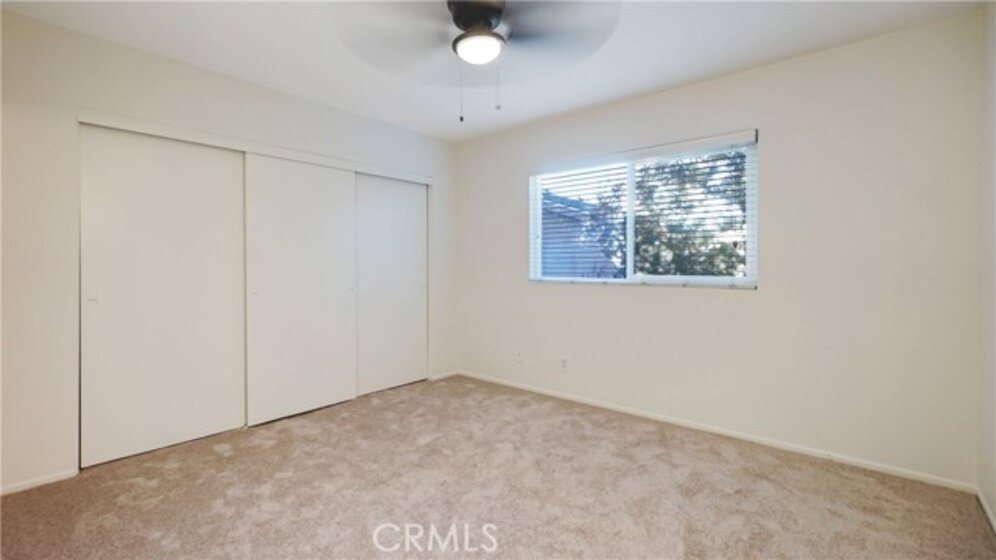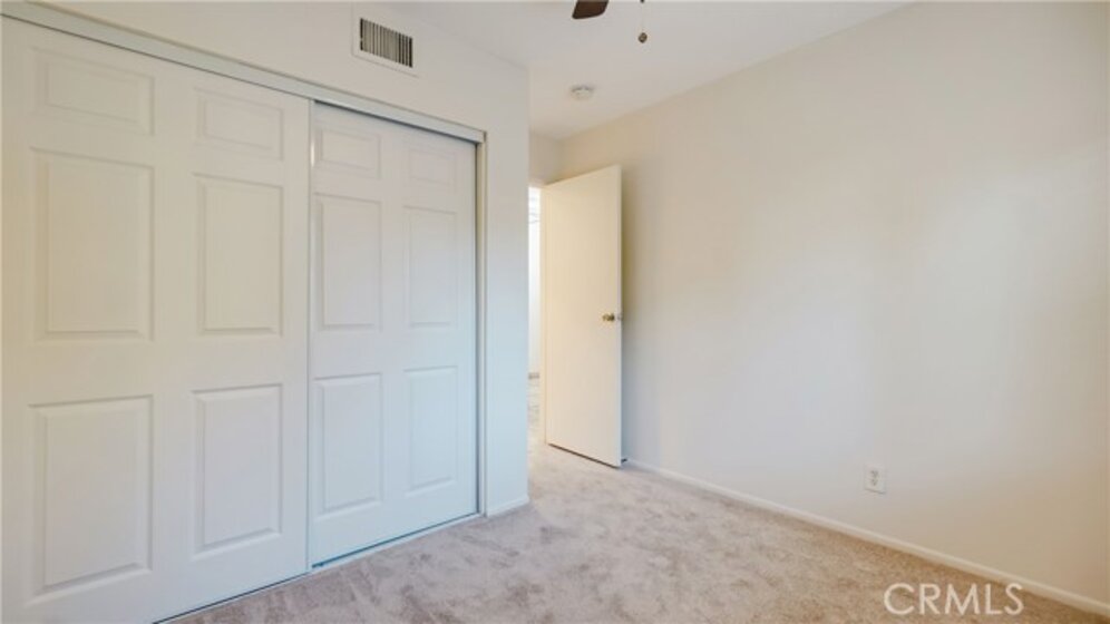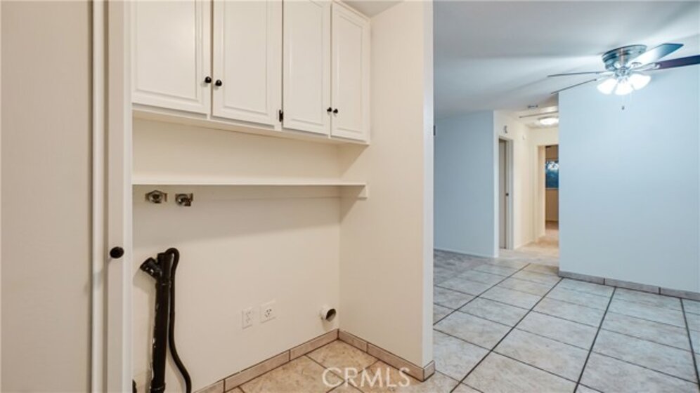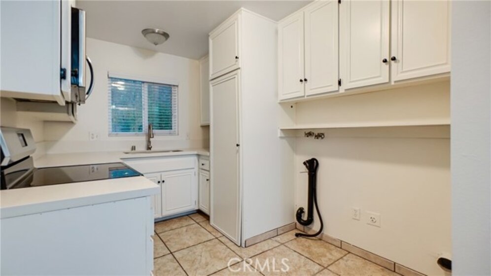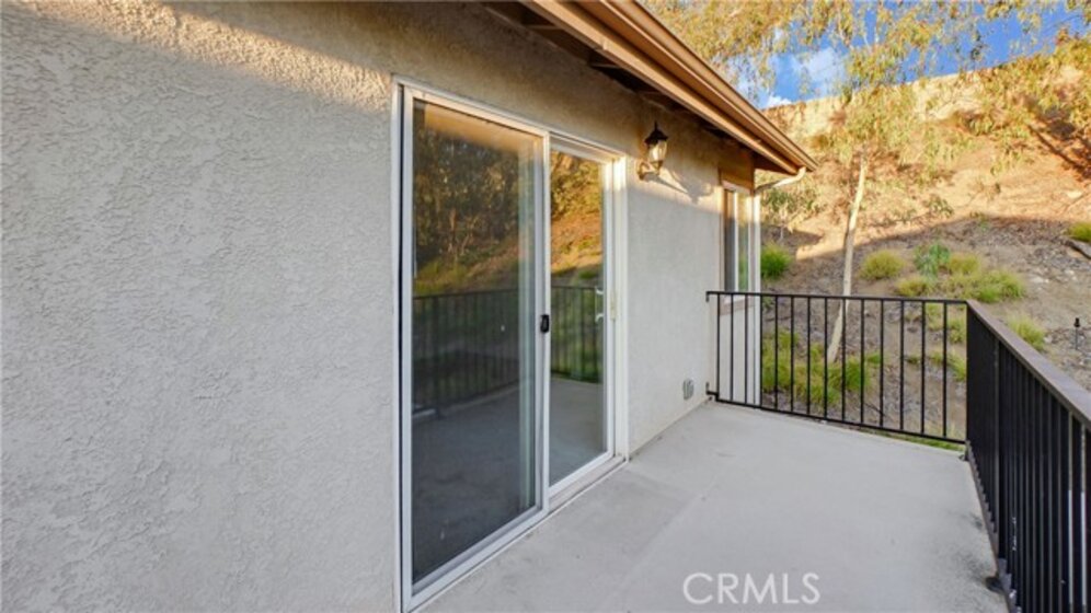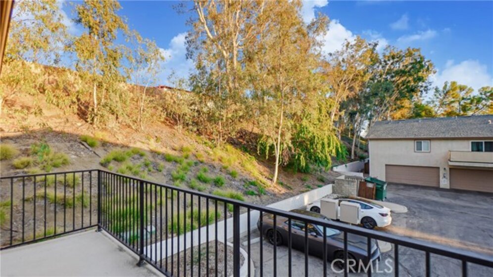 Welcome to this charming Murrieta Villas condominium! With two bedrooms and two bathrooms, this lovely upstairs unit boasts 993 square feet of living space, a private front-facing balcony and an attached garage. The entryway welcomes you at ground level, where a staircase leads to the main living area on the second floor. At the top of the stairs, natural light fills the living room from the sliding glass door to the private balcony, highlighting the combination of carpet and tile flooring and the light, neutral paint scheme throughout. Beyond the living area, the well-appointed kitchen, dining space, bedrooms and bathrooms await. The kitchen offers ample counter and cabinet space, along with a convenient in-kitchen laundry area. You will also find a 5 burner electric stove and oven, dishwasher, built-in microwave, and a window over the sink that fills the space with natural light. Down the hallway, you will find a spacious walk-in closet with built-in shelving for easy organization. The hallway bathroom features a shower/tub combination, tile flooring, and a single sink vanity. The master bedroom is complete with plush carpeting, a closet with three sliding doors, a ceiling fan for comfort, and a window that bathes the room in natural light. The attached master bathroom boasts tile flooring, single sink with a vanity sitting area, and a shower/tub combination. Equally welcoming, the additional bedroom has plush carpet flooring, a closet, a ceiling fan, and a window. Conveniently located, this home provides easy access to shopping centers, freeways, and highways, striking a harmonious balance between comfort and accessibility.