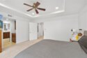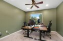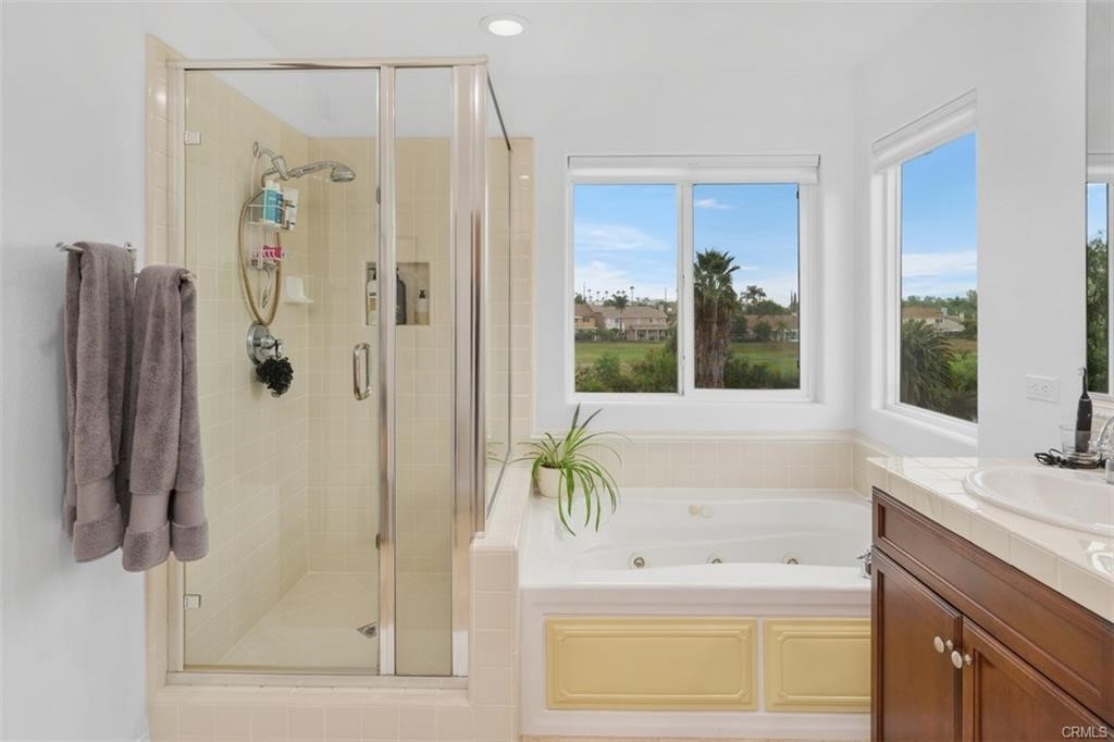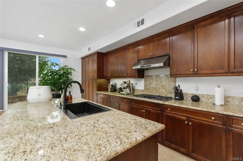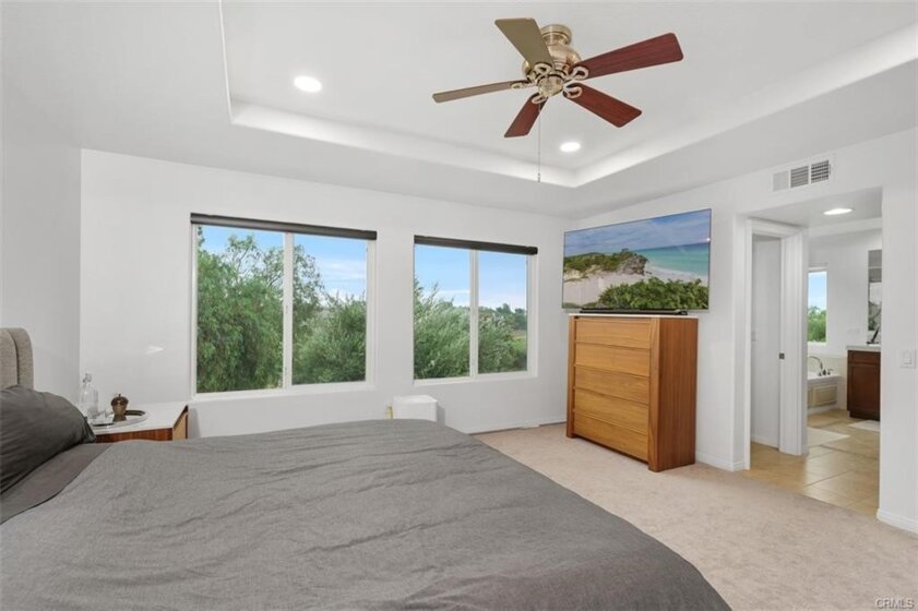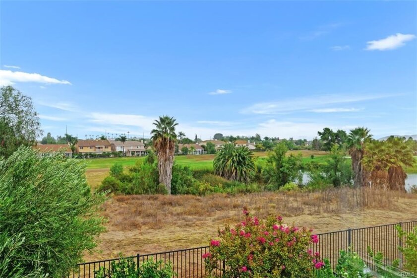 Golf-course home on a quiet cul-de-sac offering energy-efficient comfort and privacy. Enjoy dual A/C and heating units for upstairs and downstairs, ceiling fans in every room and a QuietCool whole-house fan to keep energy costs low year-round. While recessed LED lighting in every room brightens the space. The kitchen features a modern single-basin sink and exhaust fan, and the backyard provides exceptional privacy with mature fruit trees (Meyer lemon, key lime, grapefruit, and orange) framing tranquil pond and fairway views. Inside, this 5-bed, 3-bath home includes a downstairs guest suite, spacious upstairs bedrooms, and fresh updates with new flooring, carpet, and paint. Appliances include fridge, stove, dual-ovens, and W/D. Smart-home upgrades (doorbell, security cameras, light switches, and thermostat) add convenience. Garage flooring epoxied and abundant LED lighting. With low taxes, no HOA, this home blends efficiency, privacy, and modern living.