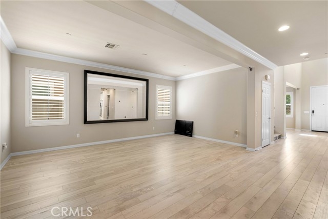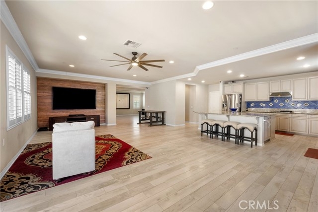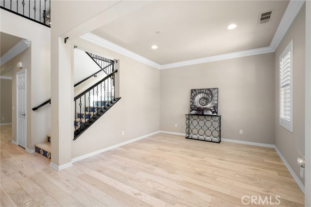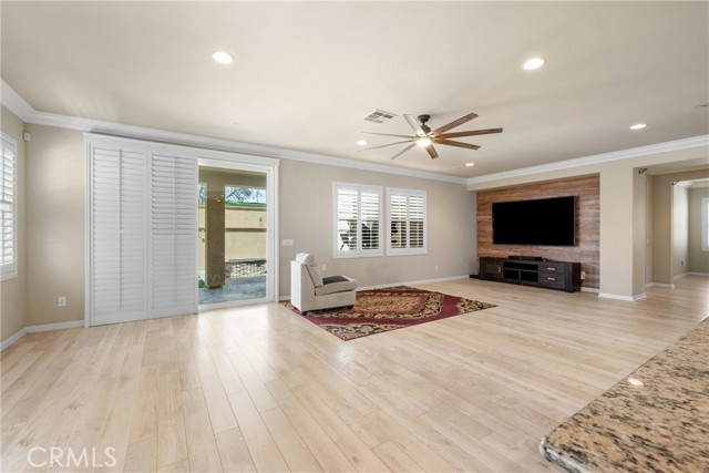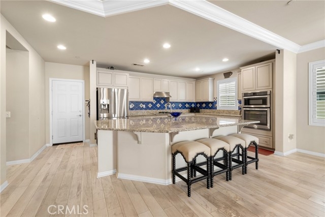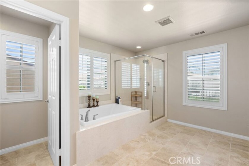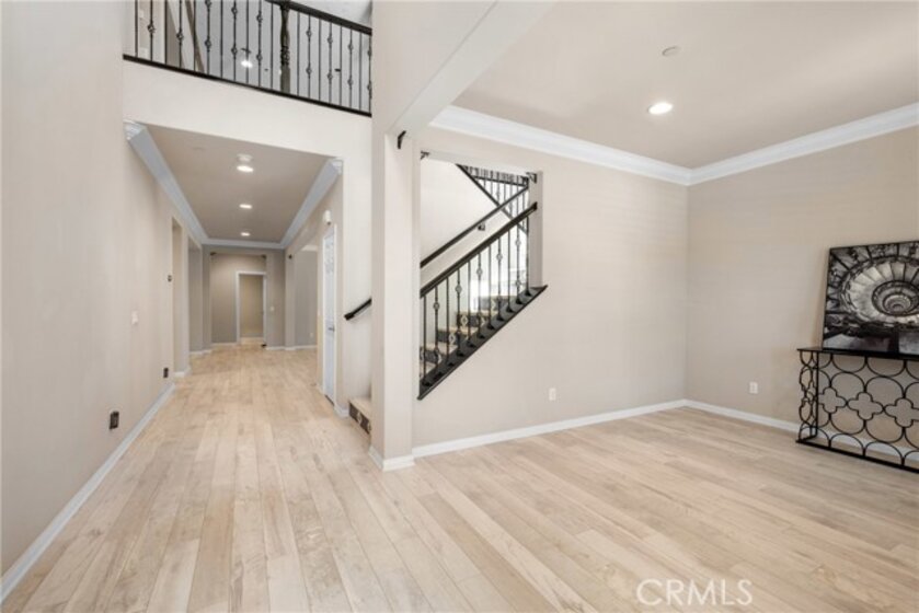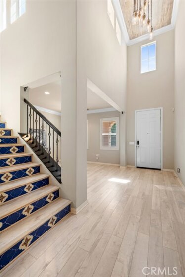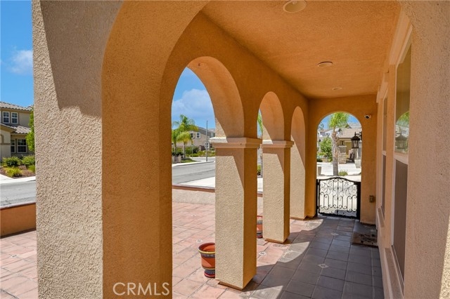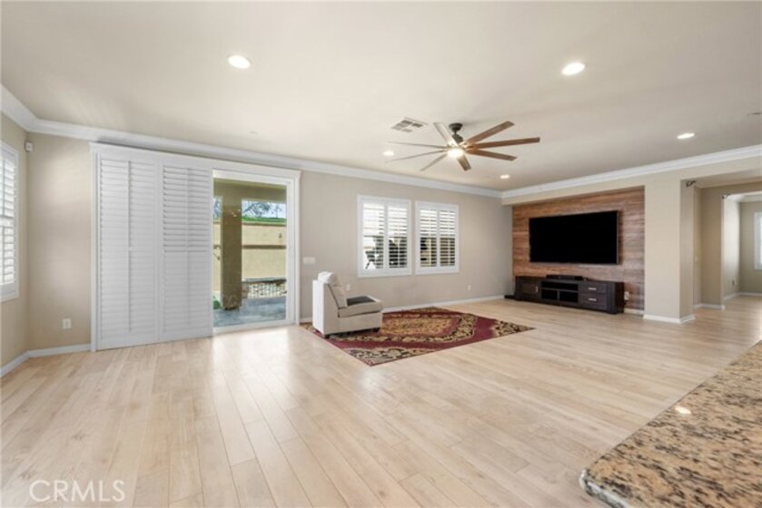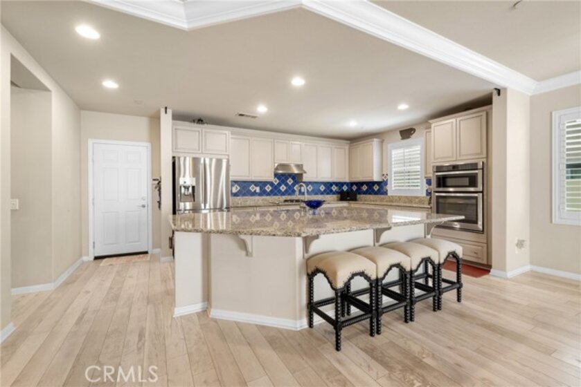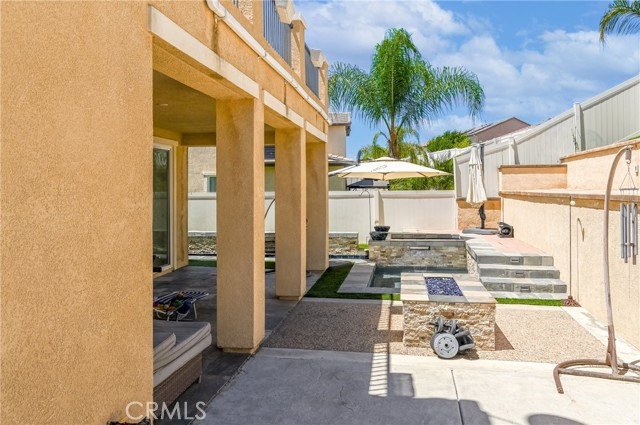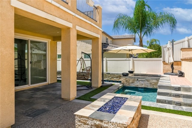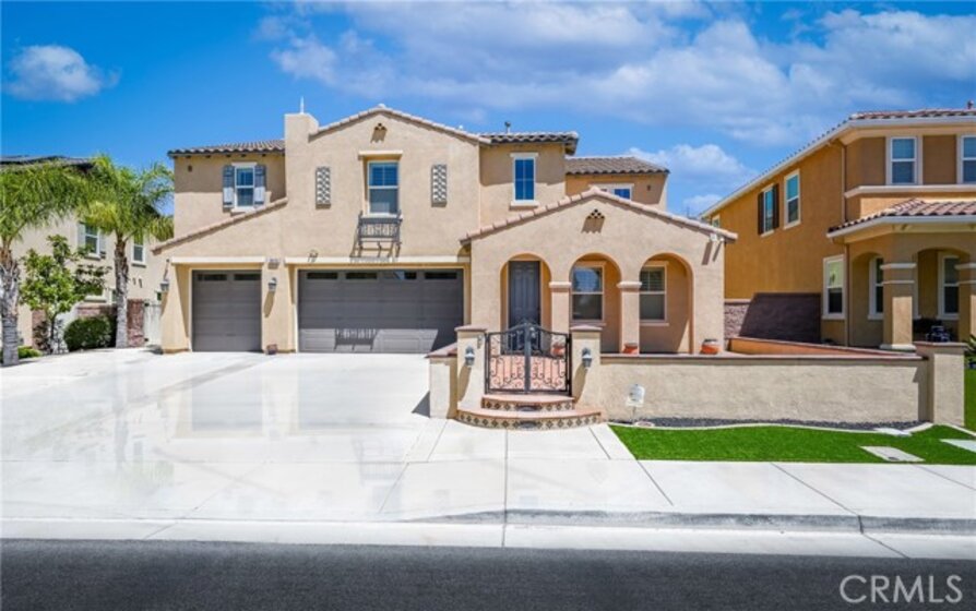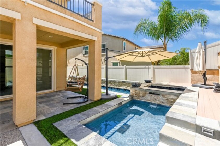Welcome to this spacious 5 bedroom, 4.5 bath Spanish-style home with a 3-car garage in a sought-after neighborhood. Designed for comfort and entertaining, the home features high ceilings, an open floor plan, and stylish upgrades throughout. The chef’s kitchen includes an oversized island, wine refrigerator, vent hood, butler’s pantry, and granite counters with rich cabinetry. The great room flows seamlessly into the backyard retreat, complete with a pool, spa, kids’ splash pool, fire pit, and low-maintenance turf landscaping. Inside, enjoy plantation shutters, engineered wood flooring, ceiling fans, and wrought iron stair railings. The primary suite offers a soaking tub, separate tile shower, and dual vanities. Extras include a tankless water heater and built-in storage racks in the garage. This is the perfect blend of indoor comfort and outdoor living — a true Southern California lifestyle home.