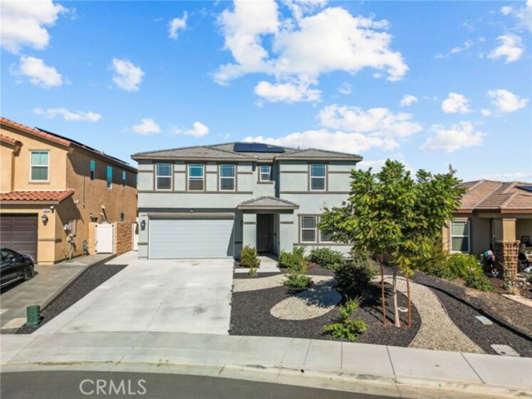 PRICED TO SELL Nestled in a serene cul-de-sac, this stunning 2023-built home offers the perfect blend of luxury and comfort. Boasting 5 spacious bedrooms and 3 full baths within its expansive 2,541 sq ft, this residence is designed for modern living. The heart of the home is the chef's kitchen, complete with elegant quartz countertops and ample space for culinary creations. A convenient downstairs bedroom with a full bath offers flexibility for guests or multi-generational living. Upstairs, a versatile loft provides additional living space, perfect for a home office or entertainment area. Enjoy energy savings with paid solar panels, while relishing the low-maintenance front and backyard, ideal for busy lifestyles. Located in a desirable school district, this home is also just moments away from shopping, offering both convenience and tranquility. With a lower tax rate and no HOA fees, this property presents an exceptional opportunity to own a dream home in a prime location. Don't miss your chance to experience the epitome of Southern California living! 3D Tour along with floor plan is available under 360 tab