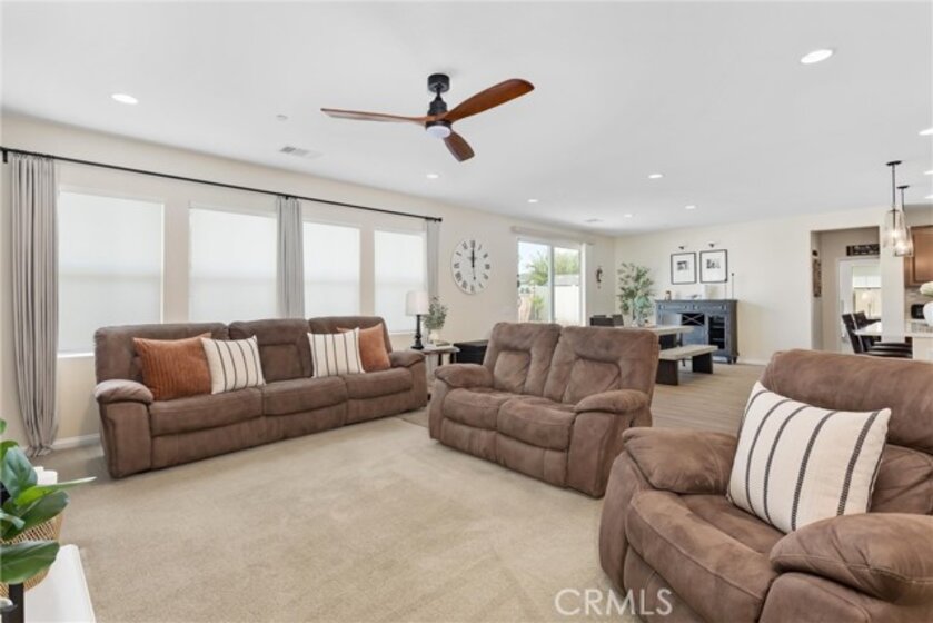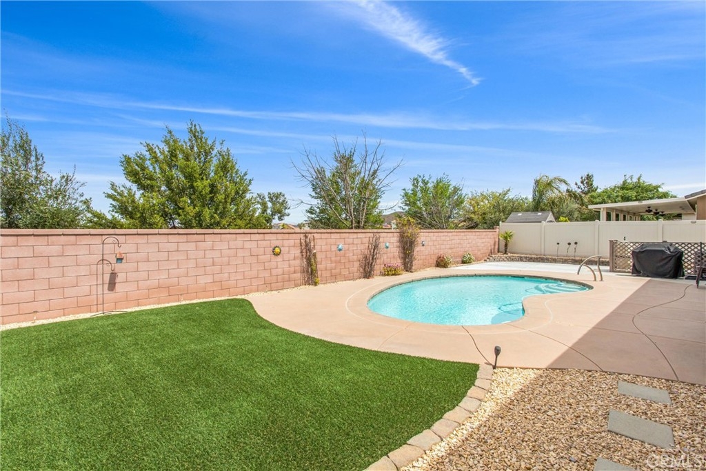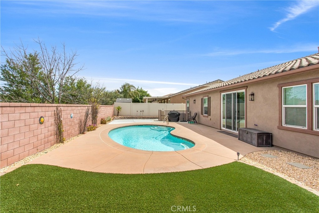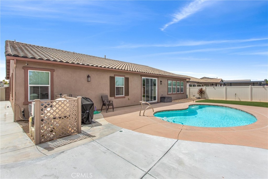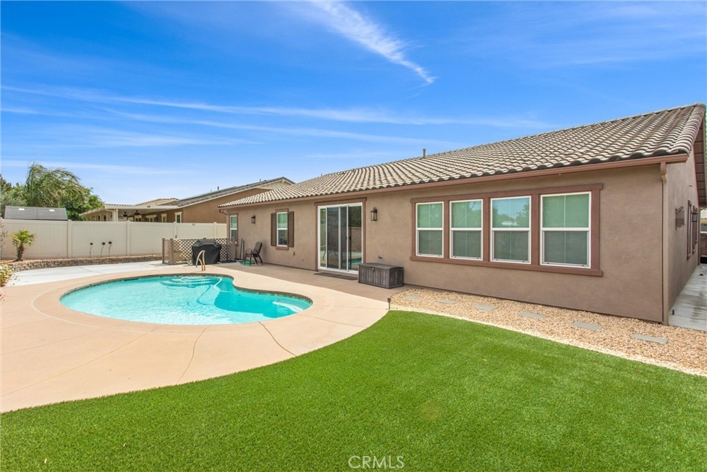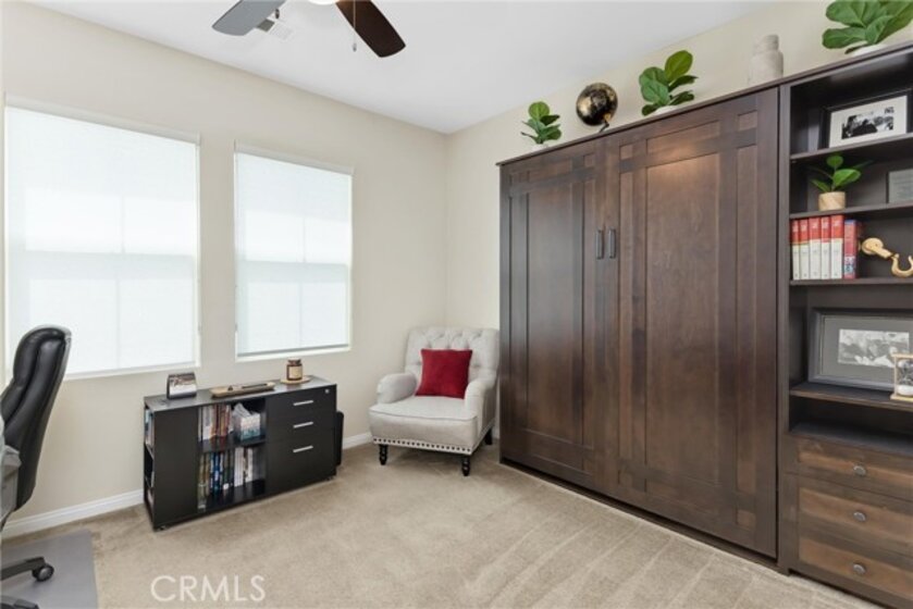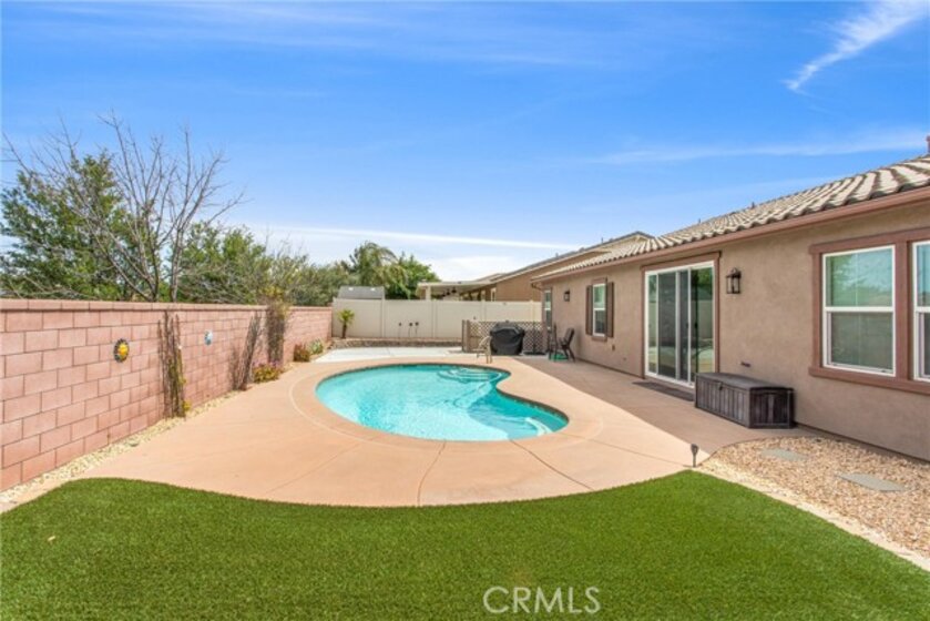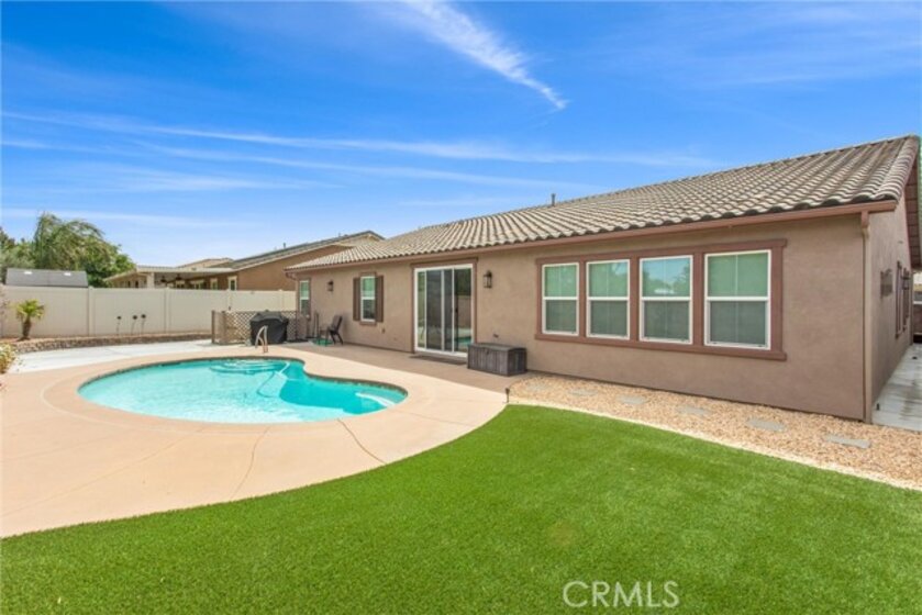 Better than new in Mahogany Hills, this single-story POOL home is the definition of model-perfect living. Immaculate, thoughtfully upgraded, and maintained with exceptional care, it offers a level of quality and presentation rarely found on the market. From the moment you arrive, the elegant front entry and striking custom door set an elevated tone. Inside, an open and airy layout unfolds—enhanced by upgraded tile flooring, 9-foot ceilings, and abundant natural light that accentuates the home’s seamless flow. Just off the foyer, a private en-suite bedroom with custom closet cabinetry provides an ideal retreat for guests or multi-generational living. A formal dining room sits adjacent, perfectly positioned for effortless entertaining. The heart of the home is the expansive family room, anchored by beautifully crafted built-in bookshelves and an entertainment center. This space opens seamlessly to the oversized kitchen and casual dining area, creating a true great-room experience. Designed for both style and function, the kitchen features a generous center island, extensive cabinetry, abundant counter space, a premium appliance package, and a butler’s pantry with wine fridge. A sliding door off the dining area extends the living space outdoors, enhancing the home’s indoor-outdoor lifestyle. Privately tucked away, the primary suite offers a serene escape—featuring a spacious walk-in closet with custom cabinetry and a beautifully finished bath. Three additional bedrooms are thoughtfully separated, providing comfort and flexibility for family or guests. A versatile office includes a custom built-in Murphy bed, ideal for work-from-home living or guest accommodations. Energy-efficient upgrades include leased solar, a tankless water heater, and a Puronics water filtration system. Step outside to the backyard that truly sets this home apart—a private pool, an exceptionally rare find in a single-story home within this community. Designed for relaxation and entertaining, the outdoor space features newly completed landscaping with premium $10K water-saving turf and a layout that encourages effortless indoor-outdoor enjoyment. Additional highlights include a 3-car tandem garage, offering valuable space for storage, a workshop, or extra parking. Located in the highly desirable Mahogany Hills community—known for its beautiful parks, miles of walking trails, mountain views, and low HOA fees—this home is not only move-in ready, it is truly exceptional in every way.