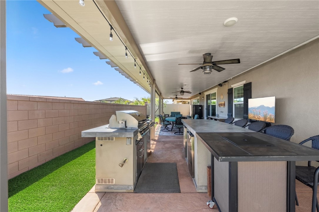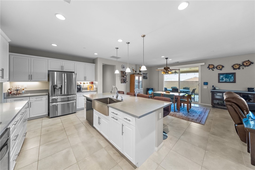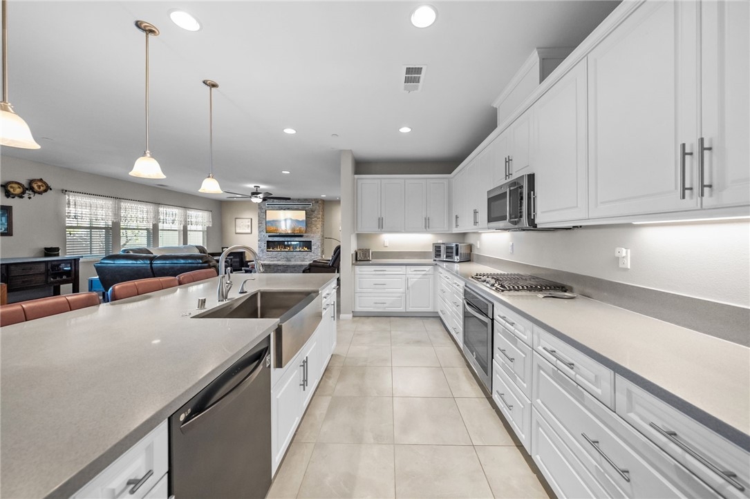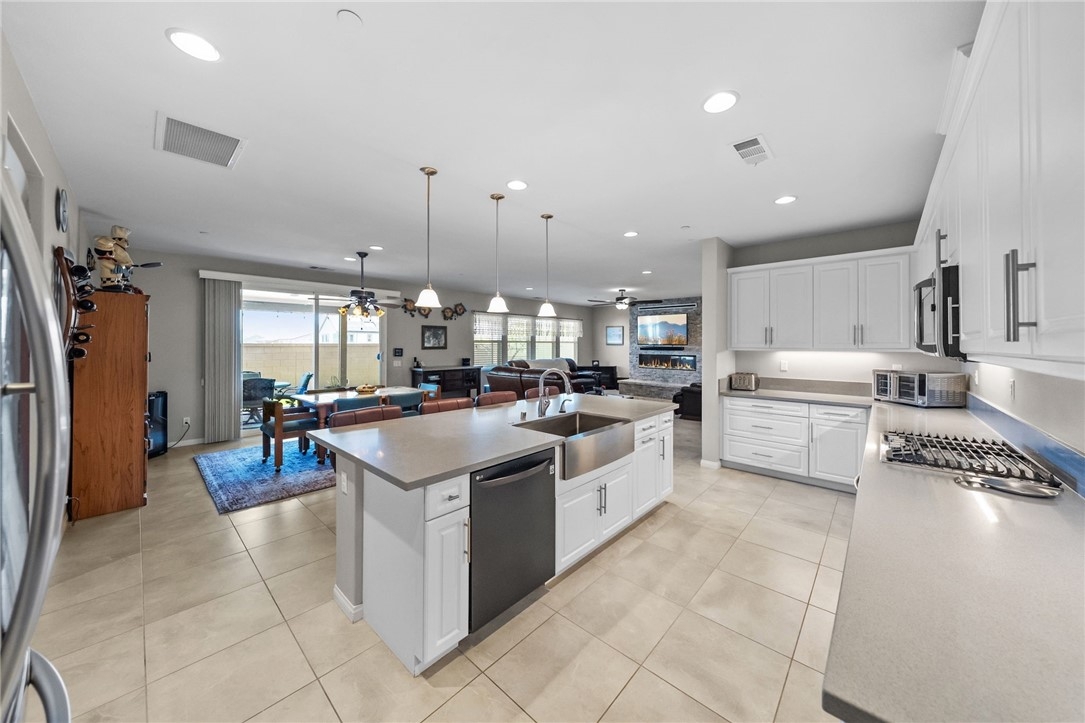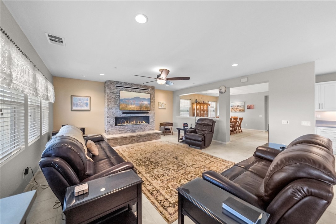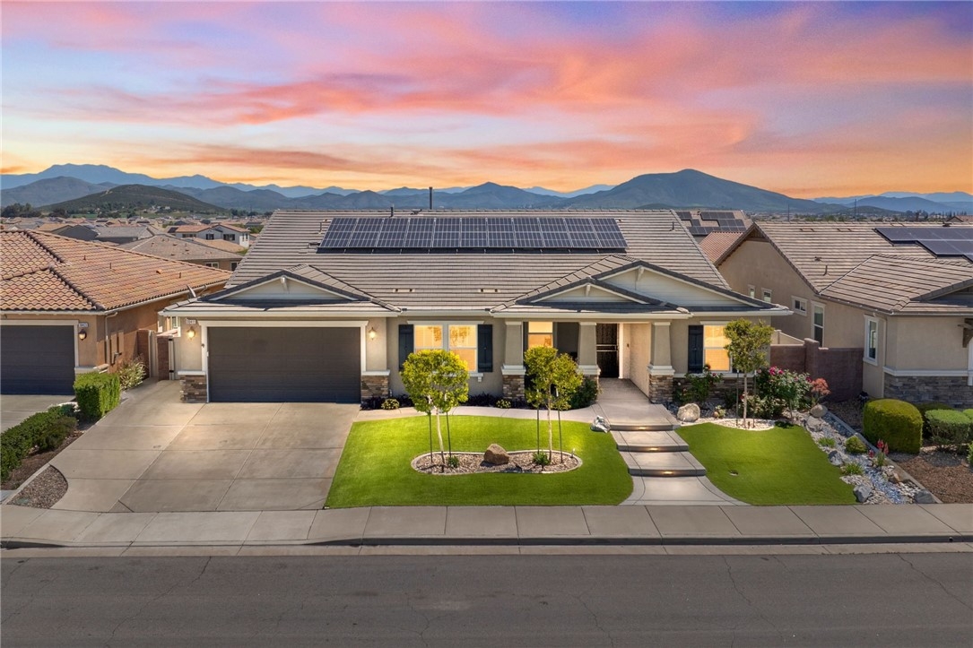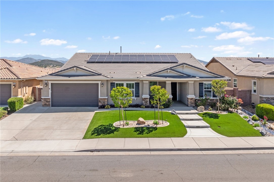 PRICE IMPROVEMENT! Beautifully upgraded Craftsman-style home, offering effortless single-story living with modern touches throughout. PAID SOLAR! The stunning front yard features a wide walkway, low-maintenance artificial turf, ambient lighting, and a spacious front porch complete with a motorized shade—perfect for relaxing outdoors. Step inside to discover elegant 18" neutral porcelain tile flooring and a thoughtful layout that begins with a junior suite upfront, complete with its own private bath—ideal for guests or multigenerational living. The large formal dining room is adorned with a fabulous chandelier, creating the perfect space for entertaining. The spacious family room boasts a custom-designed stacked stone fireplace with a color-changing horizontal gas insert and a cozy hearth you can gather around. The open-concept layout flows seamlessly into the expansive kitchen and additional sitting/dining area. The kitchen is a chef’s dream, featuring upgraded cabinetry, stainless steel appliances, a stainless farmhouse sink, quartz countertops, and an abundance of storage. You'll love the walk-in pantry, butler’s area, and dedicated space for your own coffee bar. Retreat to the luxurious primary suite with a private sitting area. The fully remodeled en-suite bathroom includes dual walk-in dual showers, dual sinks, additional cabinetry, LED lighting, a linen closet, and a spacious walk-in closet. The additional bedrooms are generously sized, one of which is currently being used as a home office. A secondary bathroom offers dual sinks, perfect for sharing. All bedrooms are equipped with ceiling fans, and the family room boasts a massive 72-inch ceiling fan for added comfort. Laundry is a breeze in the dedicated laundry room featuring built-in cabinets, a deep sink, and ample space for sorting and folding. Step outside to your entertainer’s dream backyard, with panoramic views of Big Bear and the Idyllwild Mountains. The backyard includes a built-in BBQ with searing station, a two-burner cooktop, an island, and artificial grass for low-maintenance living. The full-length AlumaWood patio cover is enhanced by remote-controlled custom shades—including side panels for added privacy. The oversized tandem 2-car garage offers additional storage space and features a tankless water heater. Enjoy life in this vibrant and growing community with nearby parks, award-winning schools, easy freeway access, and plenty of shopping and dining options.