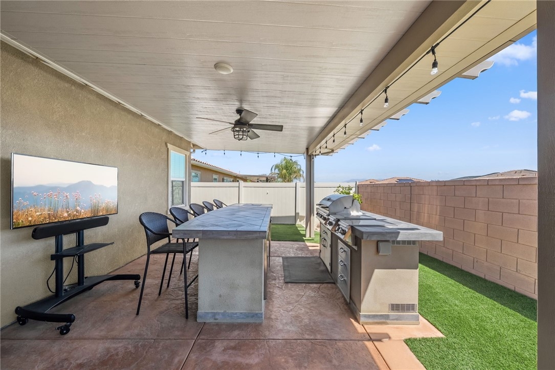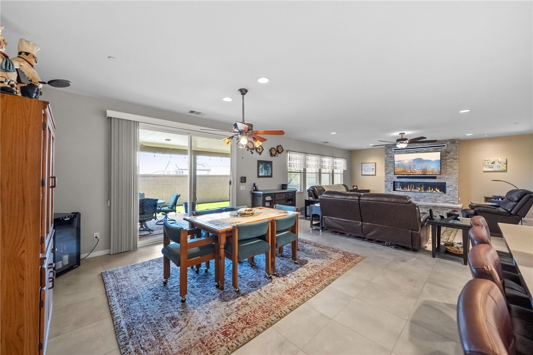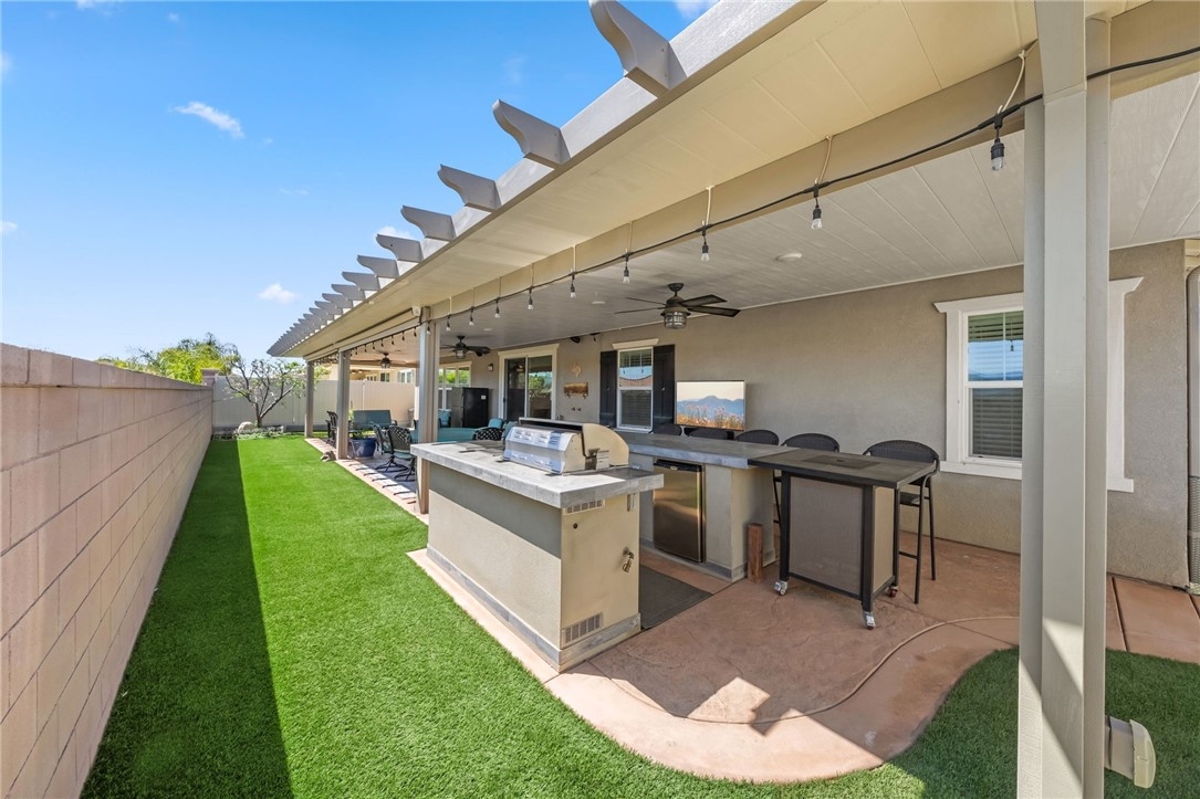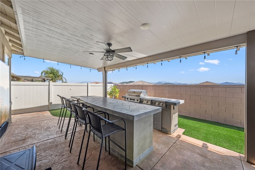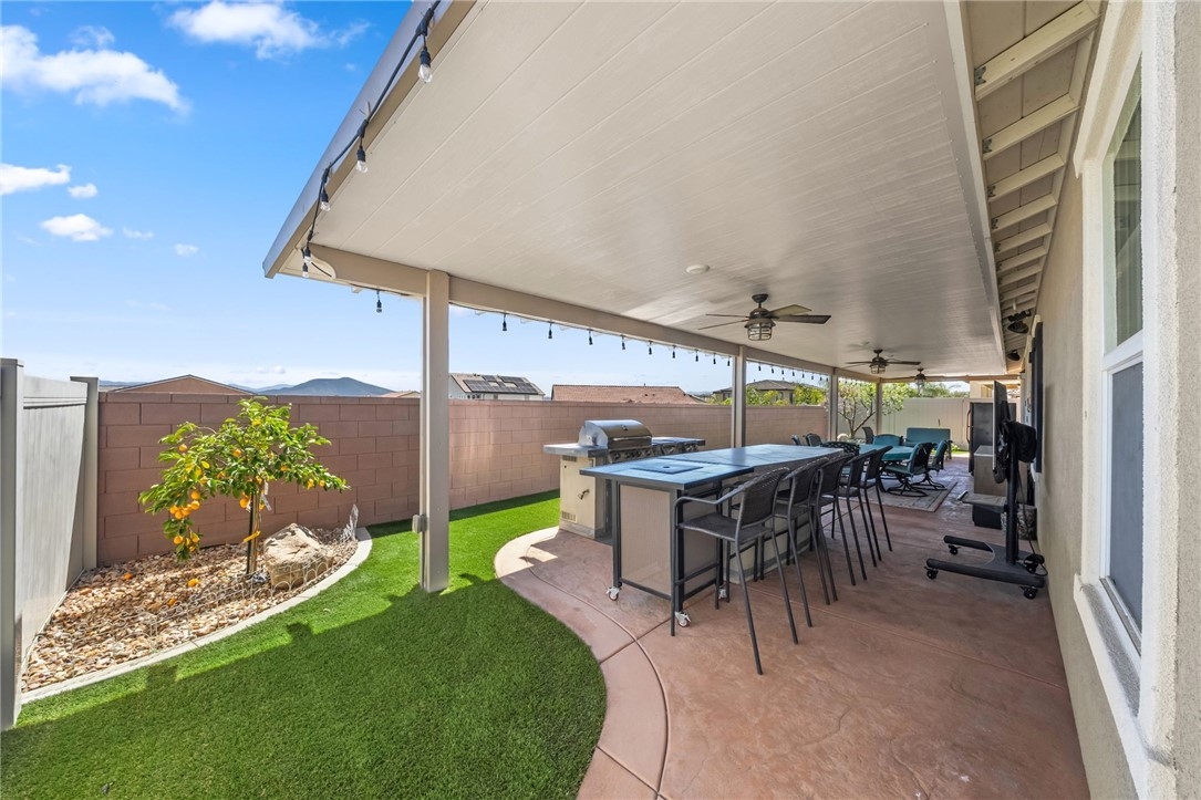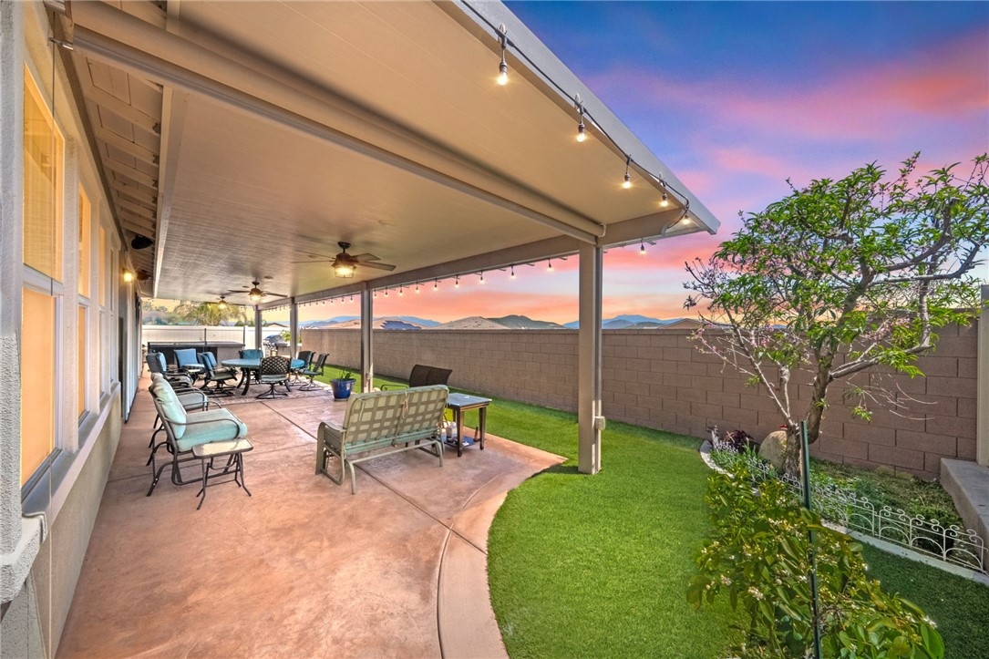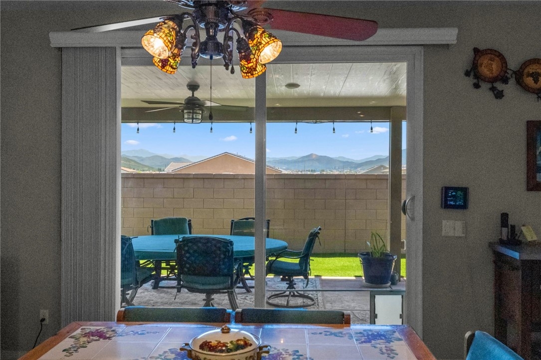 PRICE IMPROVEMENT! Beautifully upgraded Craftsman-style home, offering effortless single-story living with modern touches throughout. PAID SOLAR! The stunning front yard features a wide walkway, low-maintenance artificial turf, ambient lighting, and a spacious front porch complete with a motorized shade—perfect for relaxing outdoors. Step inside to discover elegant 18" neutral porcelain tile flooring and a thoughtful layout that begins with a junior suite upfront, complete with its own private bath—ideal for guests or multigenerational living. The large formal dining room is adorned with a fabulous chandelier, creating the perfect space for entertaining. The spacious family room boasts a custom-designed stacked stone fireplace with a color-changing horizontal gas insert and a cozy hearth you can gather around. The open-concept layout flows seamlessly into the expansive kitchen and additional sitting/dining area. The kitchen is a chef’s dream, featuring upgraded cabinetry, stainless steel appliances, a stainless farmhouse sink, quartz countertops, and an abundance of storage. You'll love the walk-in pantry, butler’s area, and dedicated space for your own coffee bar. Retreat to the luxurious primary suite with a private sitting area. The fully remodeled en-suite bathroom includes dual walk-in dual showers, dual sinks, additional cabinetry, LED lighting, a linen closet, and a spacious walk-in closet. The additional bedrooms are generously sized, one of which is currently being used as a home office. A secondary bathroom offers dual sinks, perfect for sharing. All bedrooms are equipped with ceiling fans, and the family room boasts a massive 72-inch ceiling fan for added comfort. Laundry is a breeze in the dedicated laundry room featuring built-in cabinets, a deep sink, and ample space for sorting and folding. Step outside to your entertainer’s dream backyard, with panoramic views of Big Bear and the Idyllwild Mountains. The backyard includes a built-in BBQ with searing station, a two-burner cooktop, an island, and artificial grass for low-maintenance living. The full-length AlumaWood patio cover is enhanced by remote-controlled custom shades—including side panels for added privacy. The oversized tandem 2-car garage offers additional storage space and features a tankless water heater. Enjoy life in this vibrant and growing community with nearby parks, award-winning schools, easy freeway access, and plenty of shopping and dining options.
