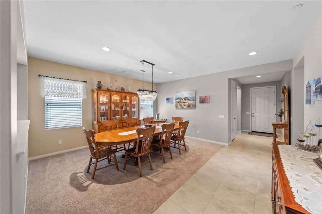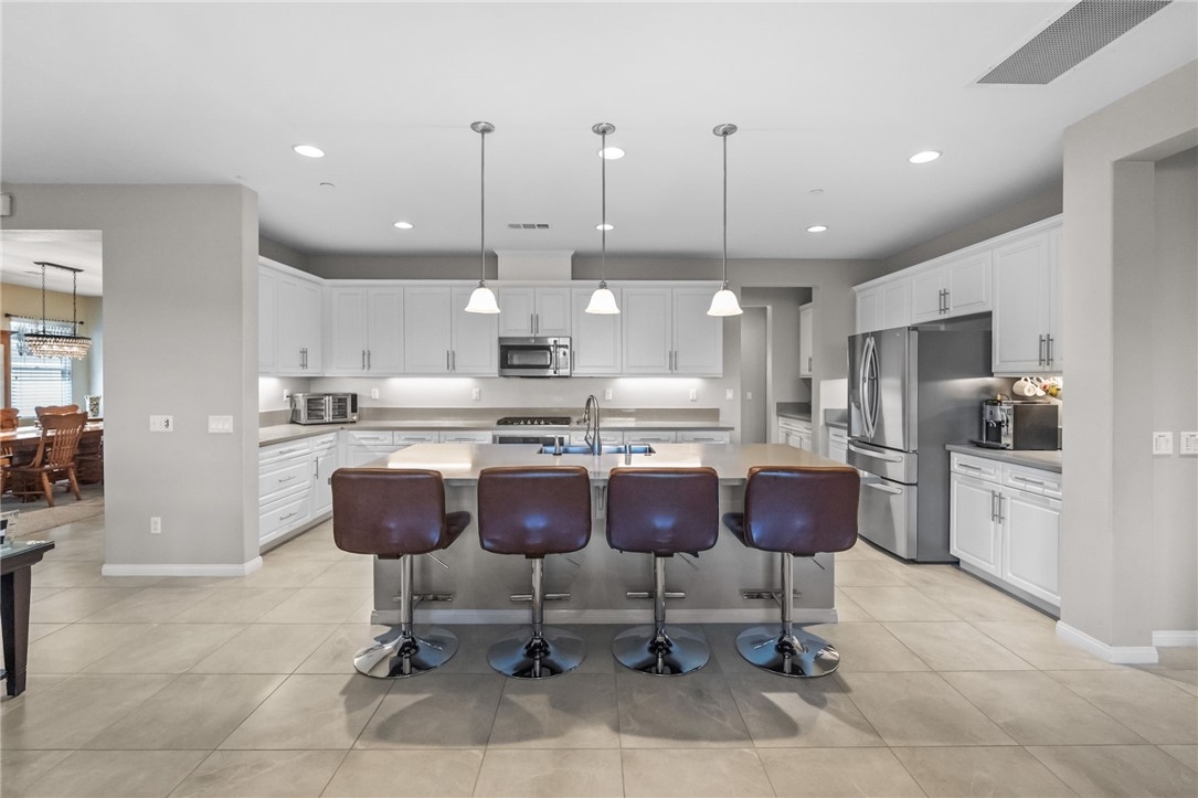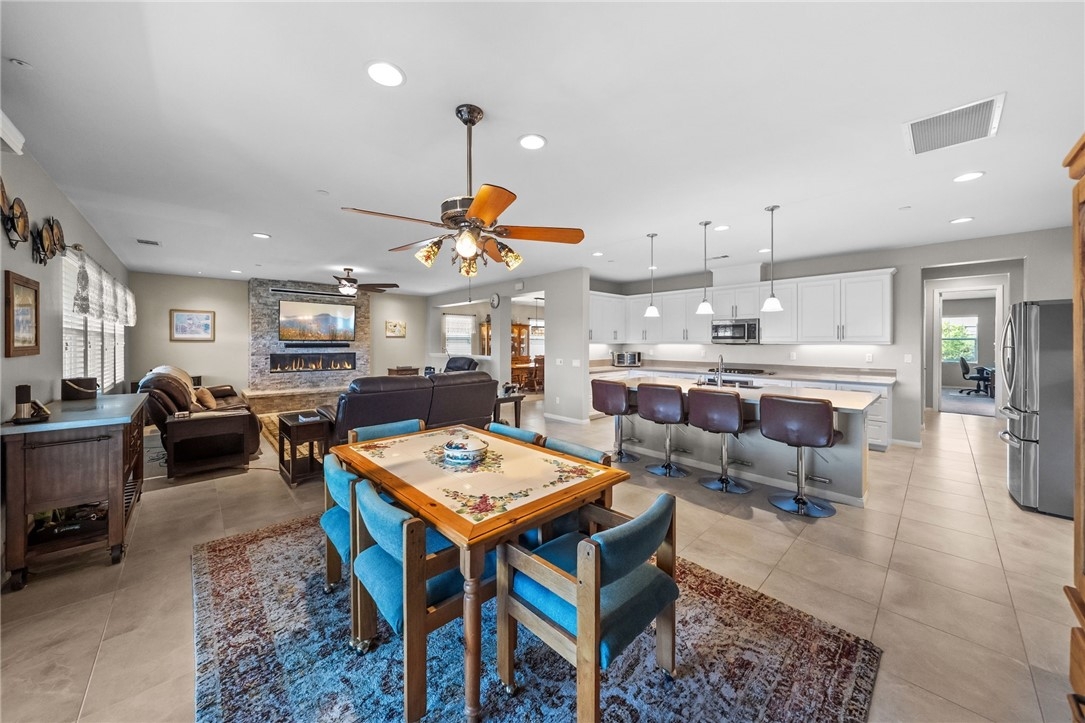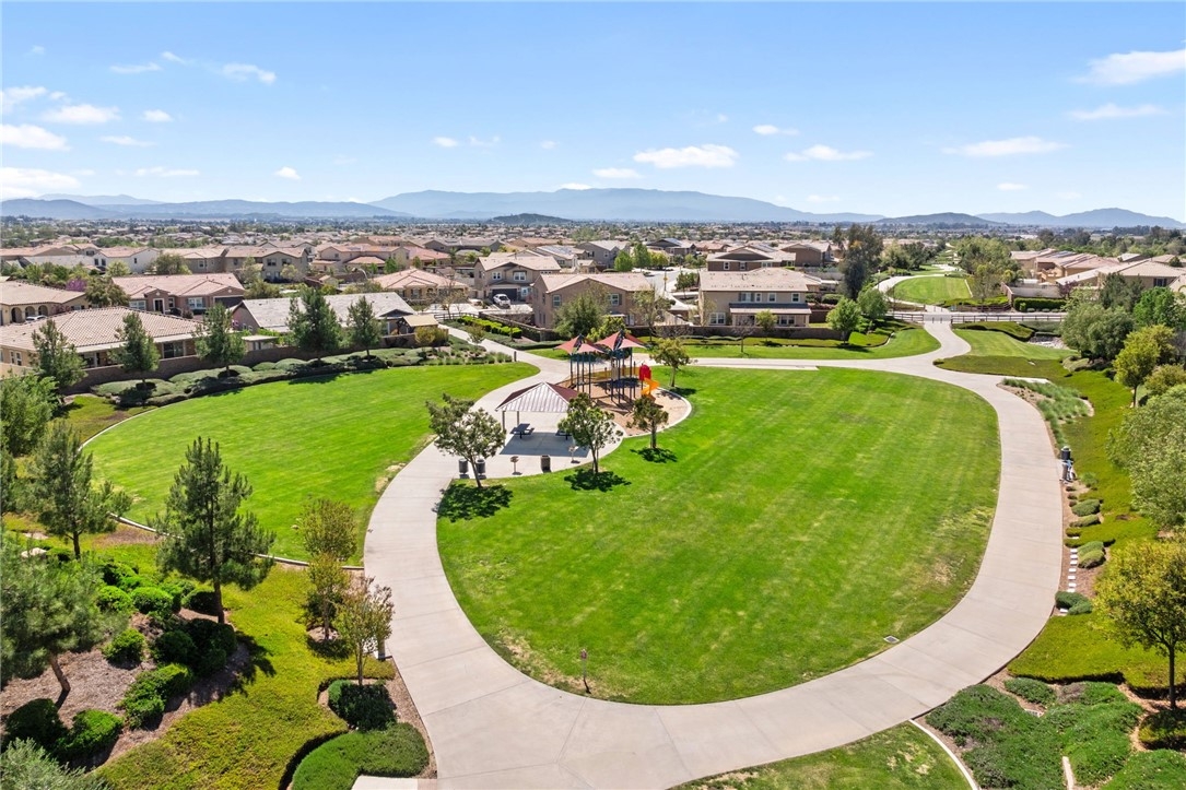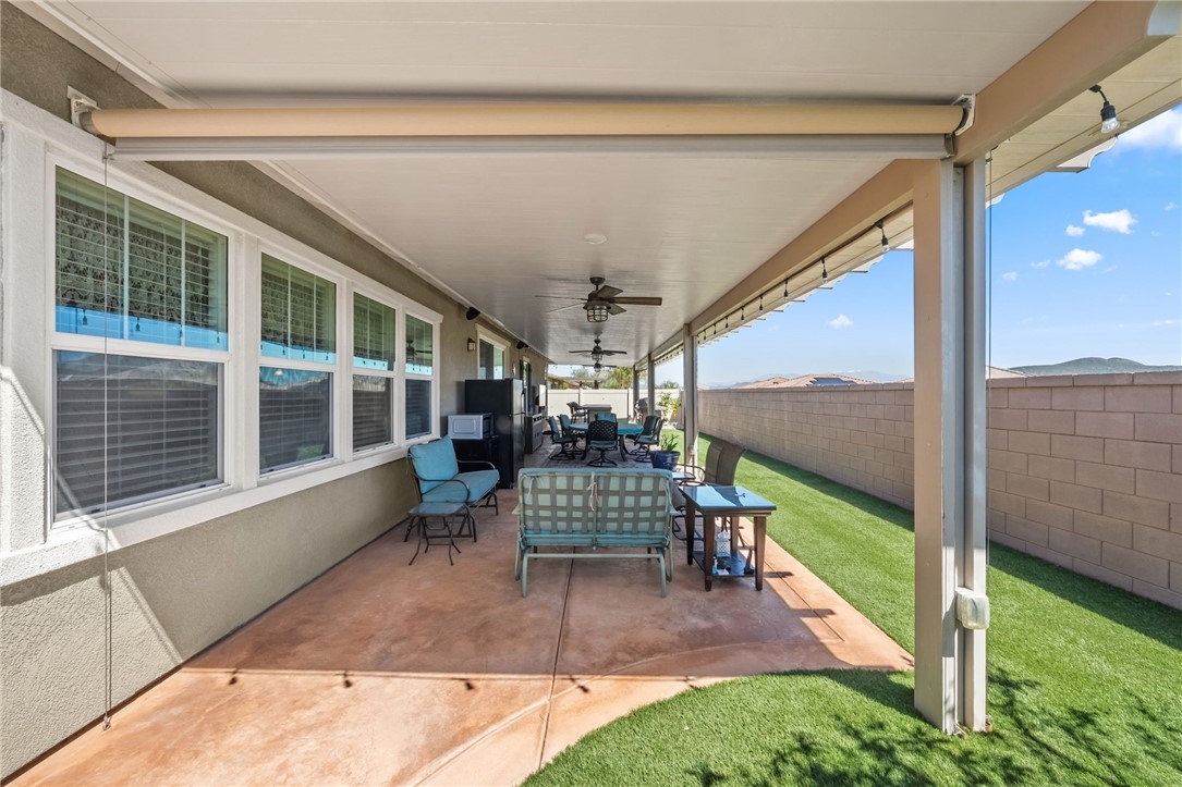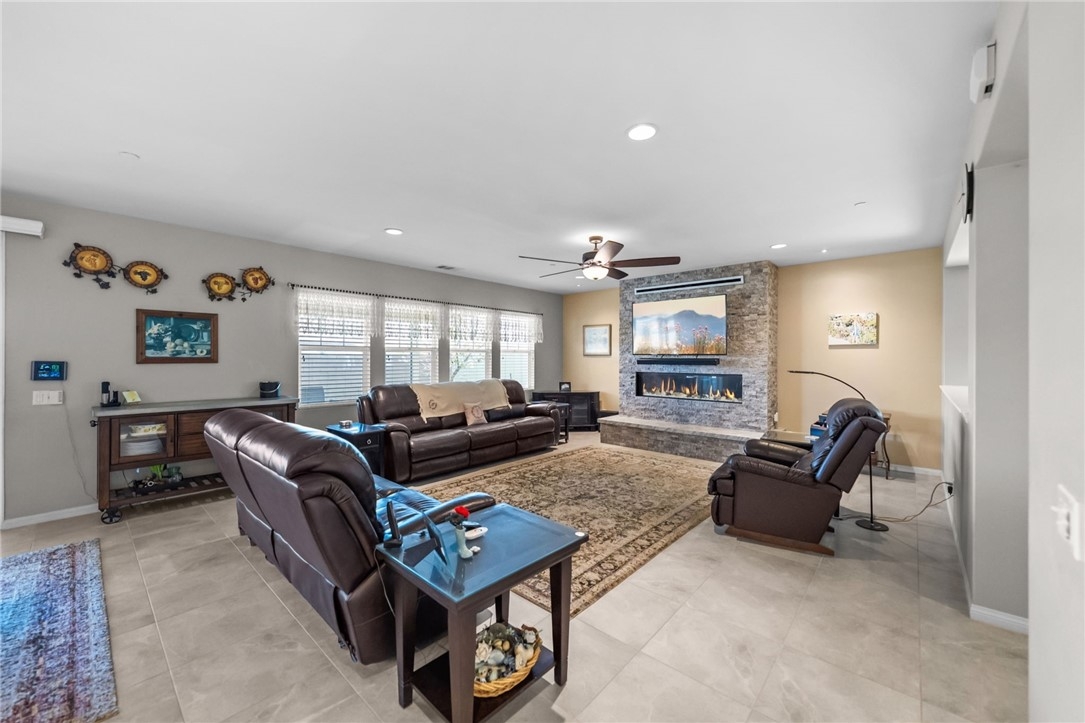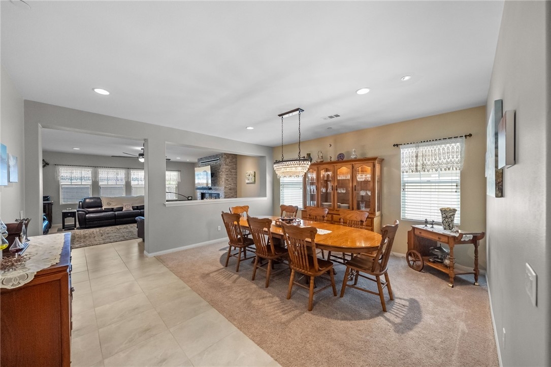 PRICE IMPROVEMENT! Beautifully upgraded Craftsman-style home, offering effortless single-story living with modern touches throughout. PAID SOLAR! The stunning front yard features a wide walkway, low-maintenance artificial turf, ambient lighting, and a spacious front porch complete with a motorized shade—perfect for relaxing outdoors. Step inside to discover elegant 18" neutral porcelain tile flooring and a thoughtful layout that begins with a junior suite upfront, complete with its own private bath—ideal for guests or multigenerational living. The large formal dining room is adorned with a fabulous chandelier, creating the perfect space for entertaining. The spacious family room boasts a custom-designed stacked stone fireplace with a color-changing horizontal gas insert and a cozy hearth you can gather around. The open-concept layout flows seamlessly into the expansive kitchen and additional sitting/dining area. The kitchen is a chef’s dream, featuring upgraded cabinetry, stainless steel appliances, a stainless farmhouse sink, quartz countertops, and an abundance of storage. You'll love the walk-in pantry, butler’s area, and dedicated space for your own coffee bar. Retreat to the luxurious primary suite with a private sitting area. The fully remodeled en-suite bathroom includes dual walk-in dual showers, dual sinks, additional cabinetry, LED lighting, a linen closet, and a spacious walk-in closet. The additional bedrooms are generously sized, one of which is currently being used as a home office. A secondary bathroom offers dual sinks, perfect for sharing. All bedrooms are equipped with ceiling fans, and the family room boasts a massive 72-inch ceiling fan for added comfort. Laundry is a breeze in the dedicated laundry room featuring built-in cabinets, a deep sink, and ample space for sorting and folding. Step outside to your entertainer’s dream backyard, with panoramic views of Big Bear and the Idyllwild Mountains. The backyard includes a built-in BBQ with searing station, a two-burner cooktop, an island, and artificial grass for low-maintenance living. The full-length AlumaWood patio cover is enhanced by remote-controlled custom shades—including side panels for added privacy. The oversized tandem 2-car garage offers additional storage space and features a tankless water heater. Enjoy life in this vibrant and growing community with nearby parks, award-winning schools, easy freeway access, and plenty of shopping and dining options.