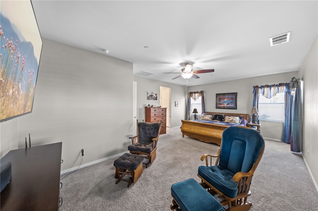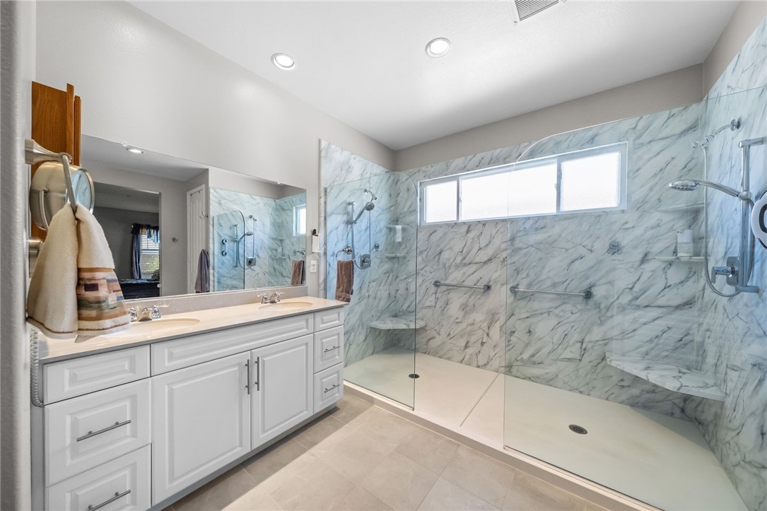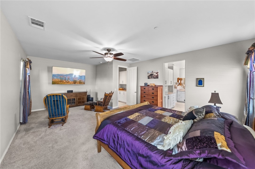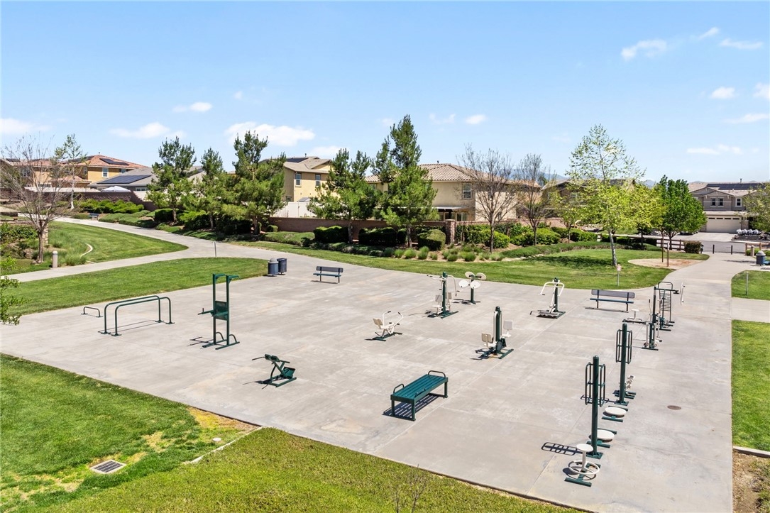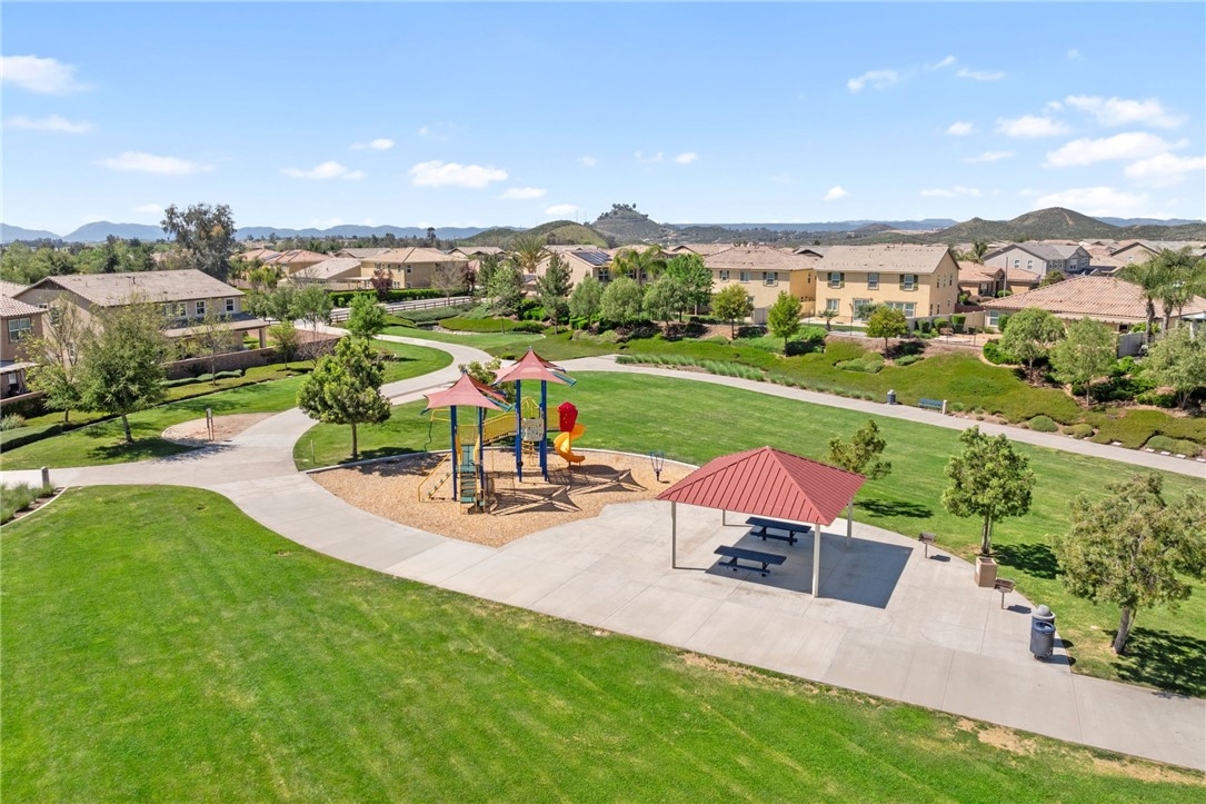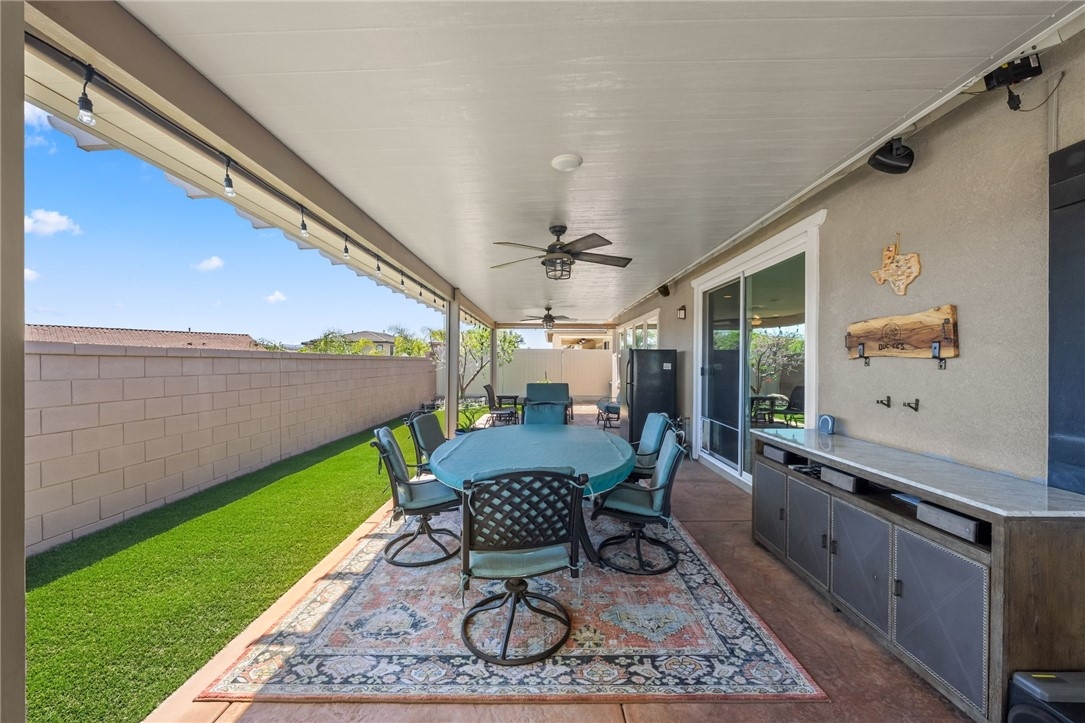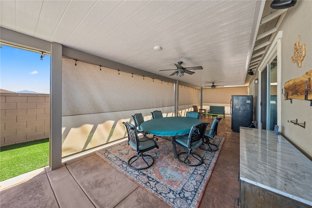 PRICE IMPROVEMENT! Beautifully upgraded Craftsman-style home, offering effortless single-story living with modern touches throughout. PAID SOLAR! The stunning front yard features a wide walkway, low-maintenance artificial turf, ambient lighting, and a spacious front porch complete with a motorized shade—perfect for relaxing outdoors. Step inside to discover elegant 18" neutral porcelain tile flooring and a thoughtful layout that begins with a junior suite upfront, complete with its own private bath—ideal for guests or multigenerational living. The large formal dining room is adorned with a fabulous chandelier, creating the perfect space for entertaining. The spacious family room boasts a custom-designed stacked stone fireplace with a color-changing horizontal gas insert and a cozy hearth you can gather around. The open-concept layout flows seamlessly into the expansive kitchen and additional sitting/dining area. The kitchen is a chef’s dream, featuring upgraded cabinetry, stainless steel appliances, a stainless farmhouse sink, quartz countertops, and an abundance of storage. You'll love the walk-in pantry, butler’s area, and dedicated space for your own coffee bar. Retreat to the luxurious primary suite with a private sitting area. The fully remodeled en-suite bathroom includes dual walk-in dual showers, dual sinks, additional cabinetry, LED lighting, a linen closet, and a spacious walk-in closet. The additional bedrooms are generously sized, one of which is currently being used as a home office. A secondary bathroom offers dual sinks, perfect for sharing. All bedrooms are equipped with ceiling fans, and the family room boasts a massive 72-inch ceiling fan for added comfort. Laundry is a breeze in the dedicated laundry room featuring built-in cabinets, a deep sink, and ample space for sorting and folding. Step outside to your entertainer’s dream backyard, with panoramic views of Big Bear and the Idyllwild Mountains. The backyard includes a built-in BBQ with searing station, a two-burner cooktop, an island, and artificial grass for low-maintenance living. The full-length AlumaWood patio cover is enhanced by remote-controlled custom shades—including side panels for added privacy. The oversized tandem 2-car garage offers additional storage space and features a tankless water heater. Enjoy life in this vibrant and growing community with nearby parks, award-winning schools, easy freeway access, and plenty of shopping and dining options.