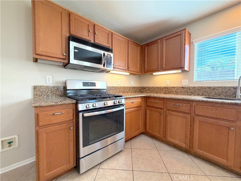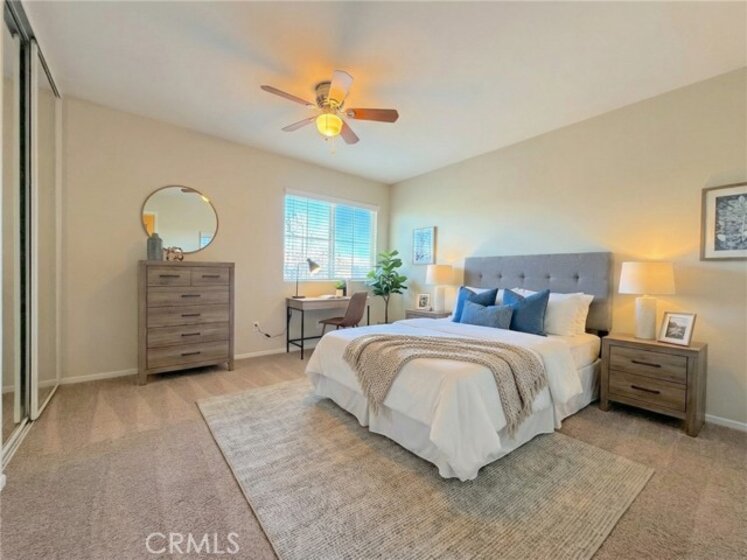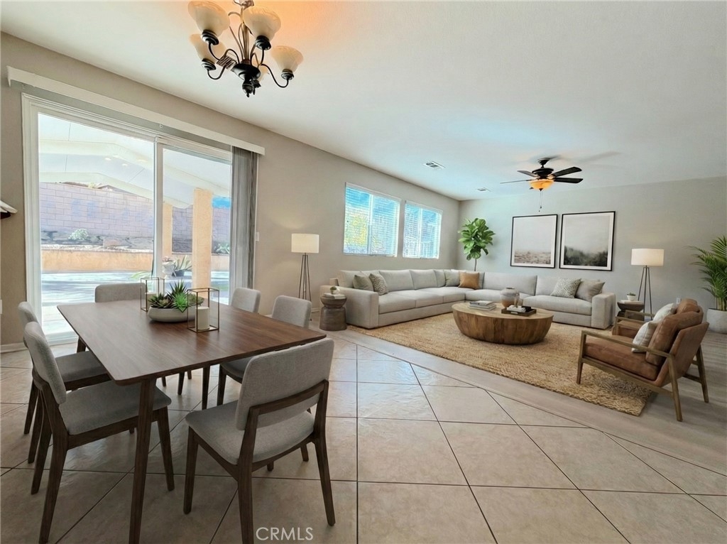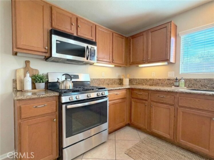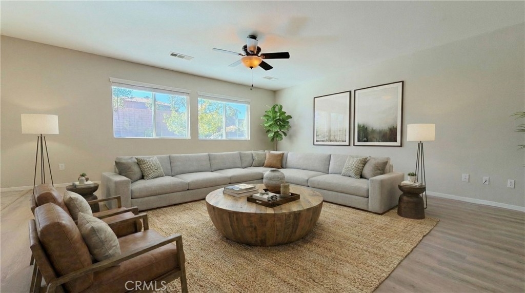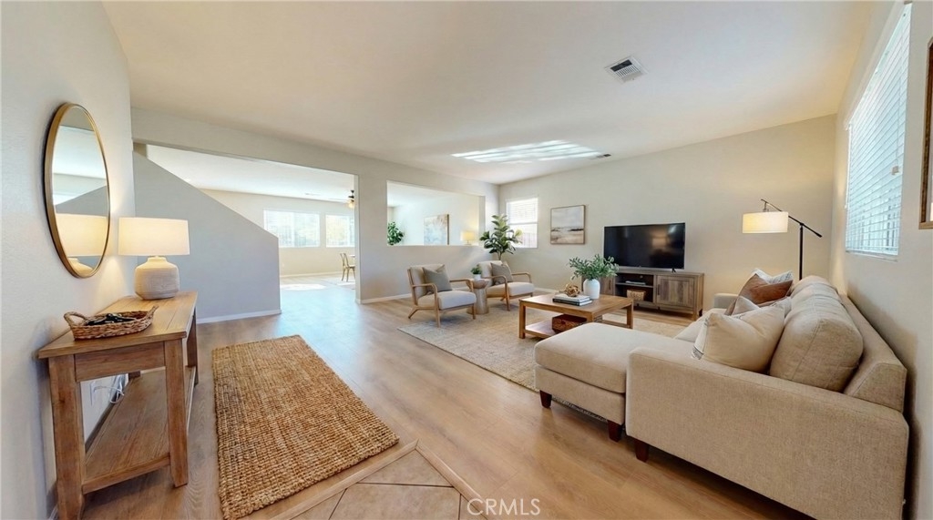 Welcome to this spacious and well-maintained two-story home offering 2,375 square feet of living space on a 6,089 square foot lot, with a bright, open floor plan and comfortable living areas throughout. The main living area features luxury vinyl plank flooring, neutral paint tones, and abundant natural light, creating a warm and inviting atmosphere. The open layout flows seamlessly into the dining area and gorgeous kitchen, making it ideal for both everyday living and entertaining. The kitchen is open to the great room and showcases granite countertops, stainless steel appliances, under-cabinet lighting, ample cabinetry, recessed lighting, and an extended countertop with bar seating. An indoor laundry room with a gas dryer hookup adds everyday convenience. Sliding glass doors lead to the backyard, enhancing indoor-outdoor living. Upstairs, you’ll find brand new carpet throughout, including generously sized bedrooms and a spacious loft, perfect for a second living area, home office, or playroom. The primary suite features plush new carpet, a ceiling fan, dual sinks, a large vanity, and a separate shower. Additional bedrooms are well-proportioned and filled with natural light. The backyard offers a custom Alumawood covered patio and concrete hardscape, creating a great space for outdoor dining, entertaining, or relaxing. Additional highlights include an attached two-car garage, central heating and air, and a functional layout designed for modern living. Conveniently located near schools, shopping, and commuter access, this move-in-ready home combines space, comfort, and value.