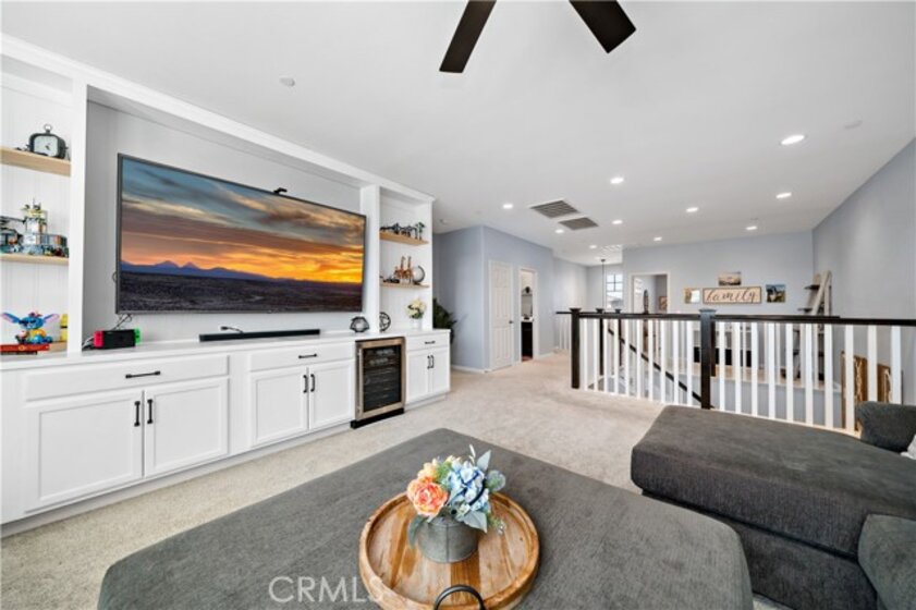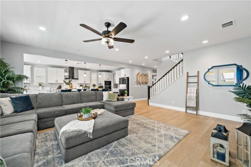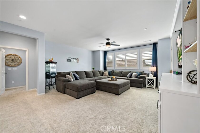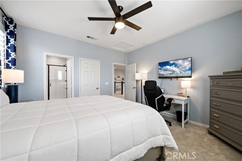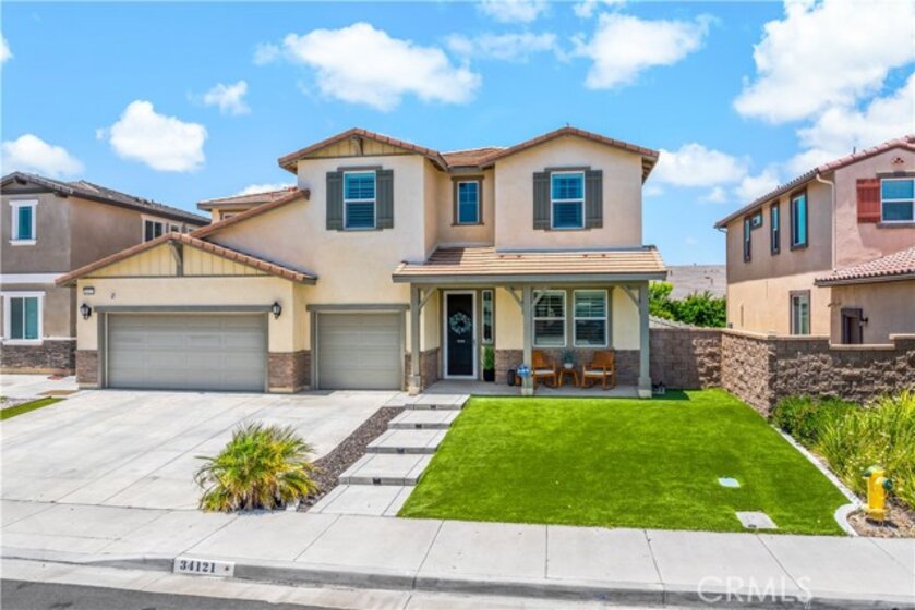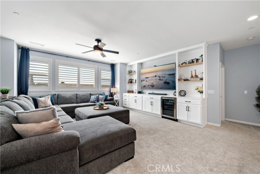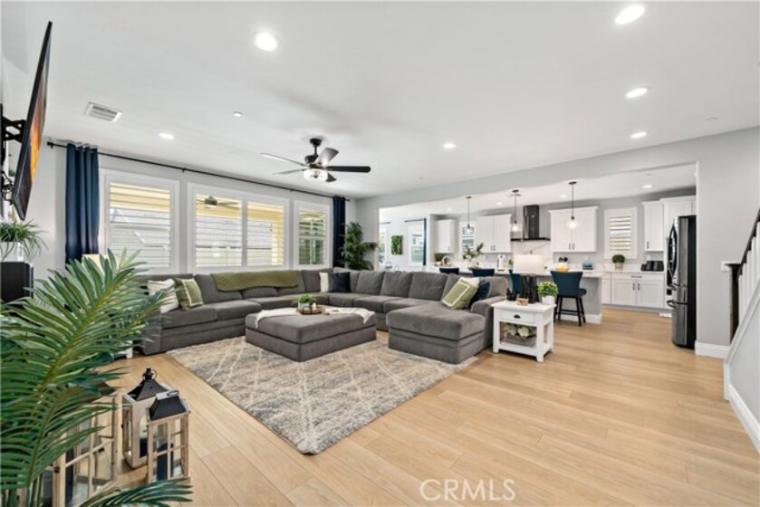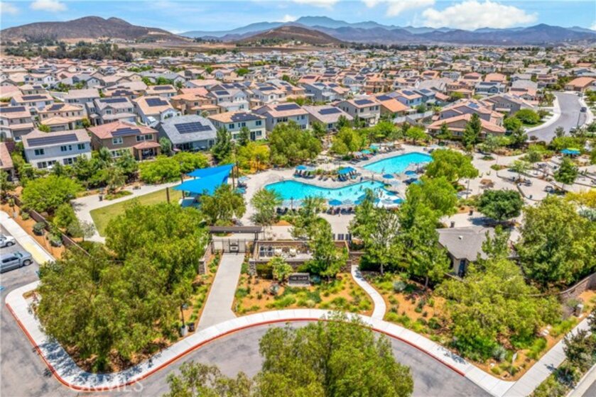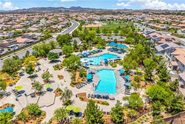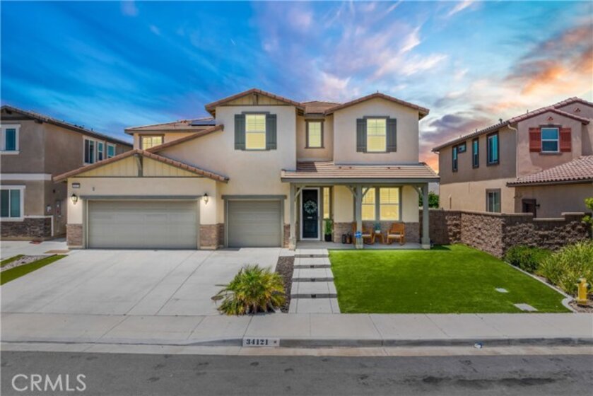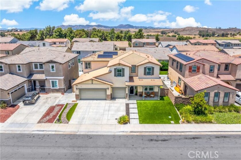 This MODEL Home is absolutely EXQUISTE!! Located in Murrieta's highly sought after and amenity rich Spencer's Crossing Community. This Richmond American Home features over 150K+ in modern, high-end upgrades! Offering 3688 sqft, 5 Bedrooms, 4 Full Bathrooms, a Loft, Owned Solar, Downstairs Bedroom and Full Bathroom and an upstairs Junior Suite! As you enter, you are lovingly greeted with inviting high-end LVP flooring, cool modern custom paint and all the designer features you desire. Off the entry is a Formal Dining Room large enough for all your favorite dining room furnishings. There is a walk-thru doorway to a Butler’s Pantry and MASSIVE walk-in pantry. Stunning Quartz countertops in this BEAUTIFUL Kitchen w/ Cafe Elite appliances, SS range hood, Shaker style cabinets w/ soft close features and pull-out shelving, and a 10-foot island with pendant lighting. Upgraded with the "Morning Room" which offers a lovely kitchen dining space. Off the morning room is a sliding glass door that leads to the outdoor California room complete w/ ceiling fan and recessed lighting. Notable water saving features in both the front and backyards are the high-end pet and kid friendly "cool" turf that won't get too hot on those toes and paws! Off the kitchen "Great Room" area is a very ROOMY and COZY Family Room w/ Fireplace! You will love all the natural light that filters in through the large windows and Plantation Shutters throughout. Stay cool inside w/ the energy saving costs you will receive with the owned Solar panels and ceiling fans all throughout! Downstairs is bedroom w/ built-in Murphy Bed and storage. A full bathroom sits adjacent to this 1st level bedroom along with a LARGE Laundry Room with a sink and built-in storage cabinets. You can access your 3-car garage here with epoxy flooring! Let's head upstairs where you will find upgraded carpet, a HUGE loft with built-in Entertainment Center complete w/ refrigerator! Behind that wall is the Junior Suite w/ its own private en-suite bathroom and walk-in closet. Down the hall are 2 more generously sized bedrooms and full bathroom! You will just love to unwind in the Primary Suite! What a great space for all your favorite furnishings! Walk-in Marble slab shower and tub surround. All the bathrooms are upgraded w/ matte black hardware and faucets that give it that luxe look we have come to LOVE! This Home is zoned for the Harvest Hill Steam Academy K-8 and the new Liberty High School. Minutes from Temecula Wine Country!!