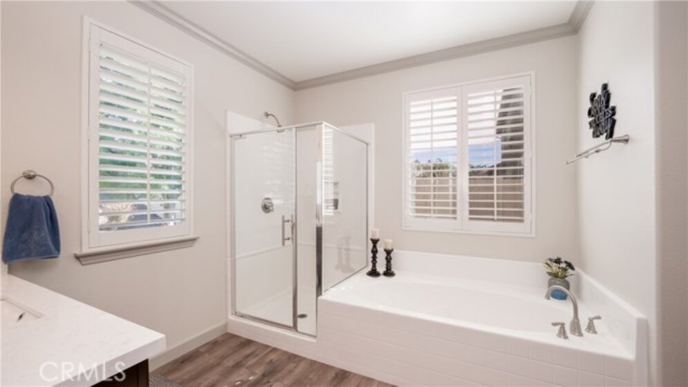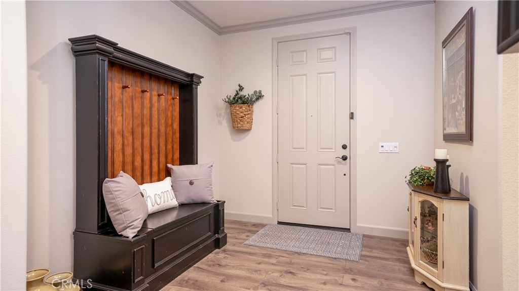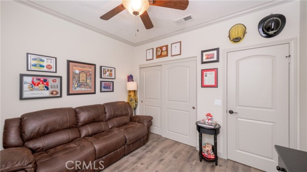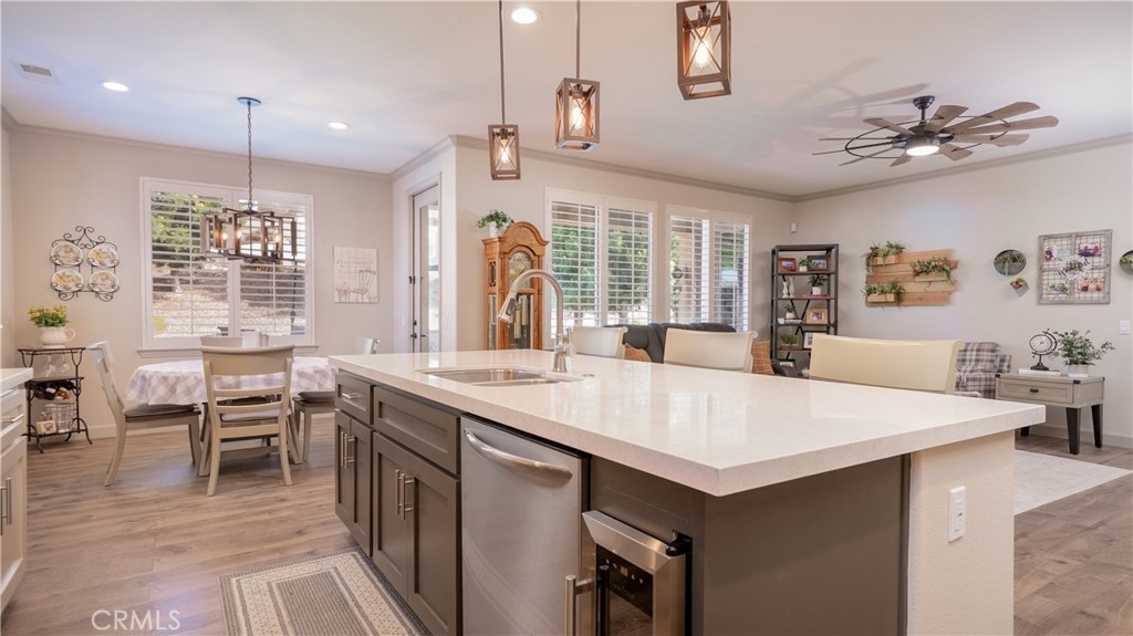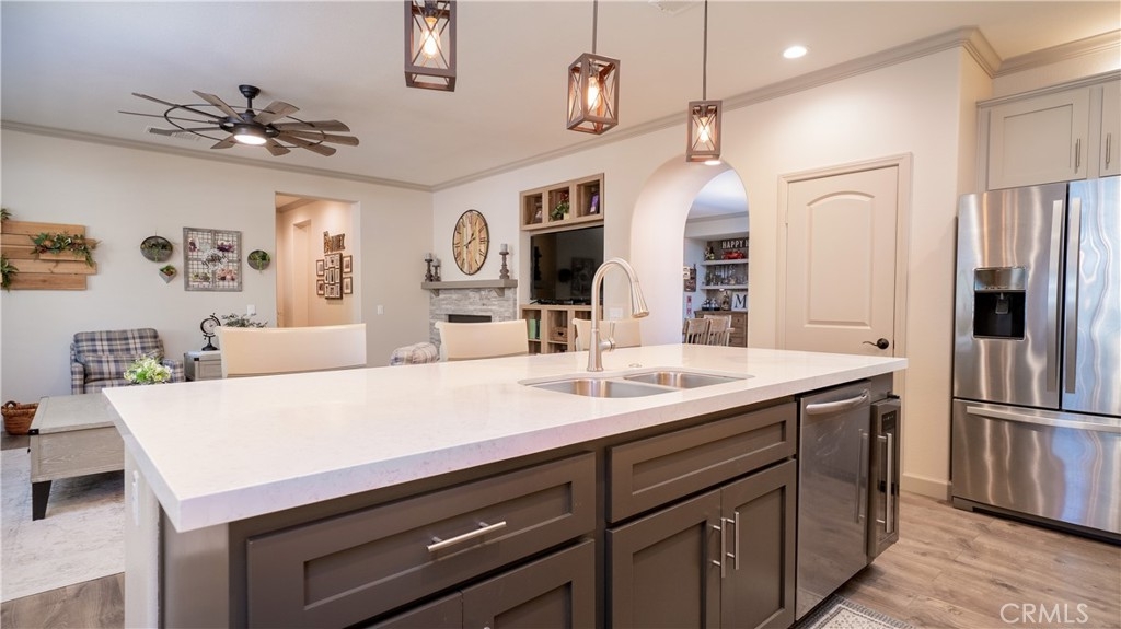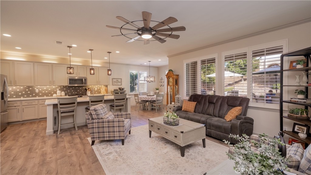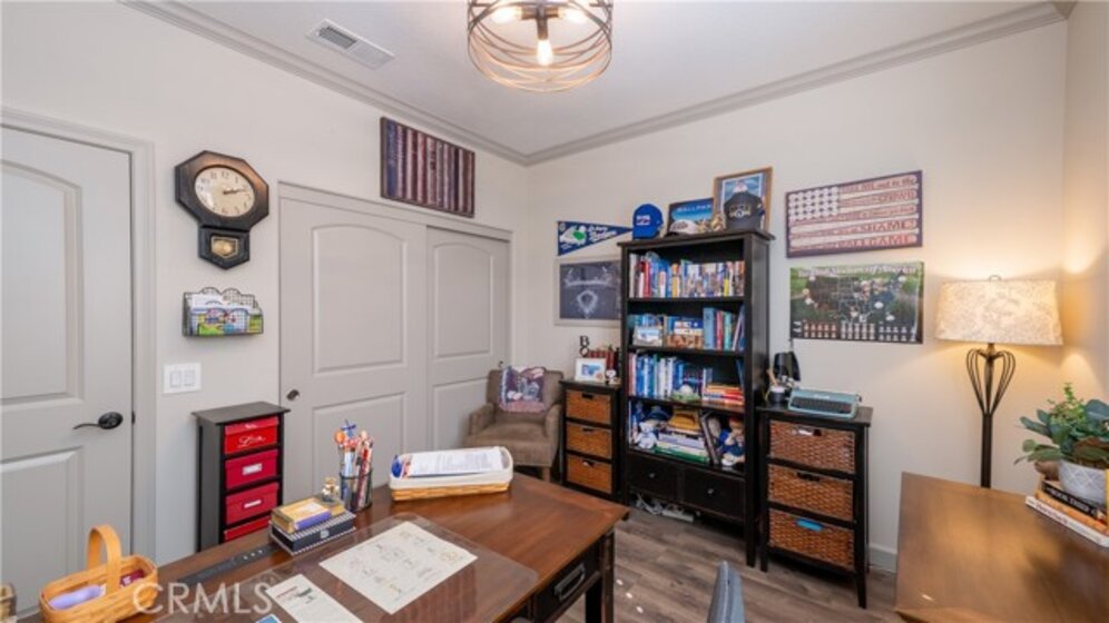 Welcome to this beautifully upgraded single-story home in the highly sought-after Spencer’s Crossing community, offering 4 bedrooms, 3 bathrooms, and a spacious 3-car garage on a premium corner lot in a peaceful neighborhood. Single-story homes of this size, condition, and layout are rare — and this one truly delivers. Lush, manicured landscaping with front and back drip systems immediately showcases pride of ownership, while the freshly painted front door and Ring doorbell create warm, welcoming curb appeal. Inside, Luxury Vinyl Plank flooring extends seamlessly throughout, complemented by crown molding, custom paint, recessed lighting, ceiling fans in every room, plantation shutters, and custom paneled interior doors — a true model-home feel from the moment you step in. The formal living and dining areas are bright and refined, enhanced by modern lighting and a built-in bar that’s ready for entertaining. At the center of the home, the remodeled kitchen shines with quartz countertops, a full custom backsplash, shaker-style cabinetry, stainless steel appliances, a large center island with pendant lighting, walk-in pantry, and built-in wine chiller. It opens effortlessly to the inviting family room featuring a ceiling fan, custom-tiled fireplace with mantle, and built-ins that create warmth and functionality. The private primary suite offers a luxurious retreat with custom wood wall detailing and a spa-inspired bath complete with dual vanities, soaking tub, walk-in shower, and generous walk-in closet. The insulated 3-car garage includes built-in cabinetry and shelving for organized storage. Outdoors, enjoy wide side yards, vinyl fencing, rain gutters, exterior security cameras, solar lighting, mature trees, custom retaining walls, planter beds with drip system, and a charming potting table. Residents of Spencer’s Crossing enjoy resort-style amenities including multiple pools (the Oasis pool and kiddie pool), a 3,500 sq. ft. clubhouse, lighted sports park with baseball and soccer fields, basketball courts, scenic walking trails, BBQ areas, and playgrounds. Single-story homes here with this level of upgrades and care rarely come available. This isn’t just move-in ready — it’s lifestyle ready. If you’ve been waiting for the one that truly checks every box, this is it.