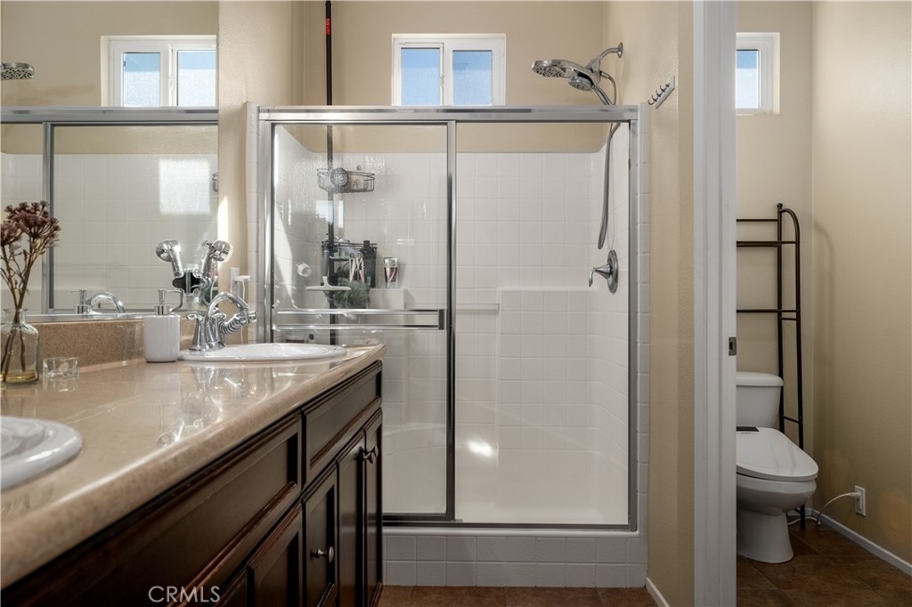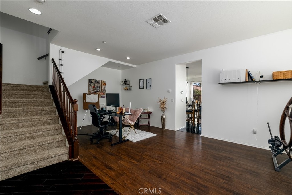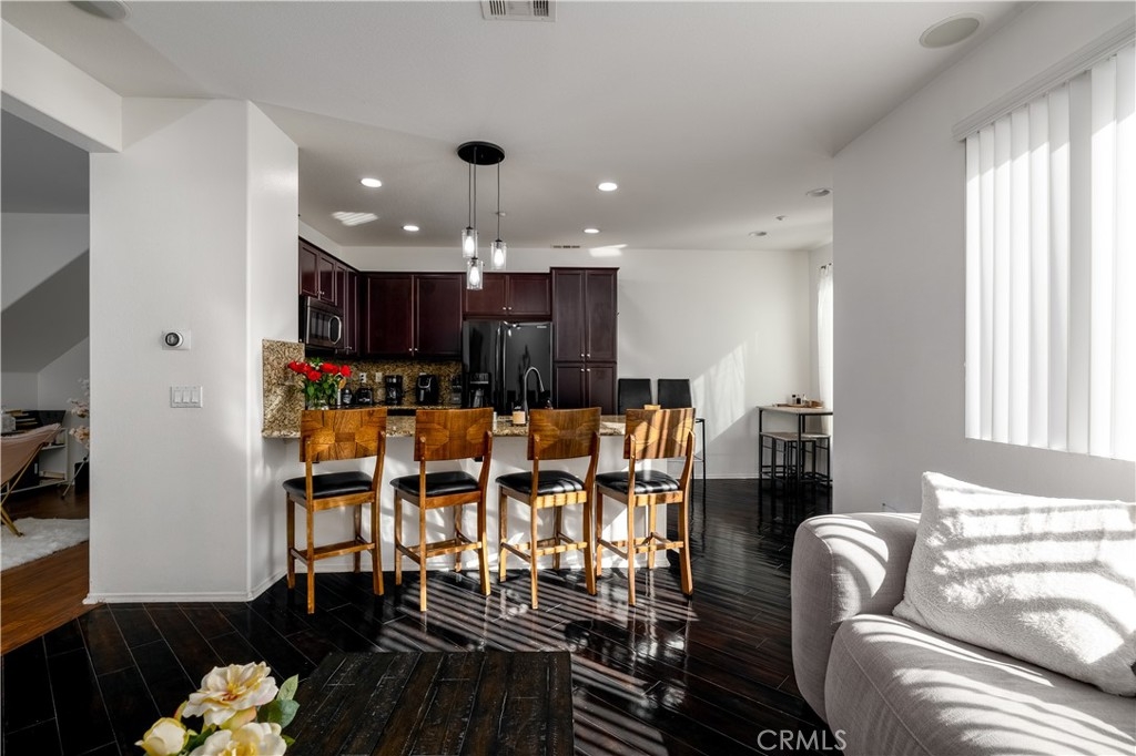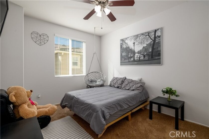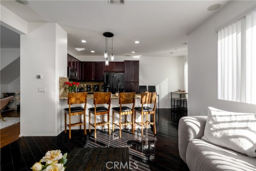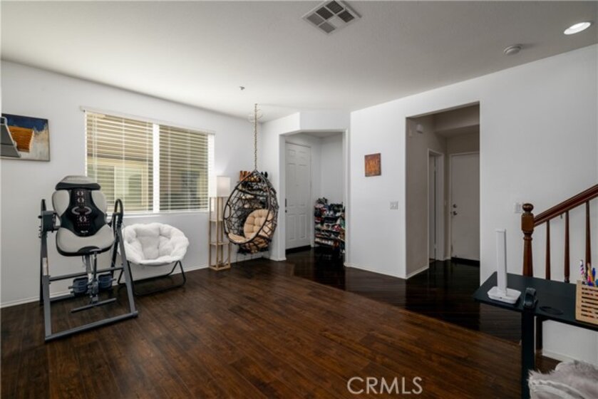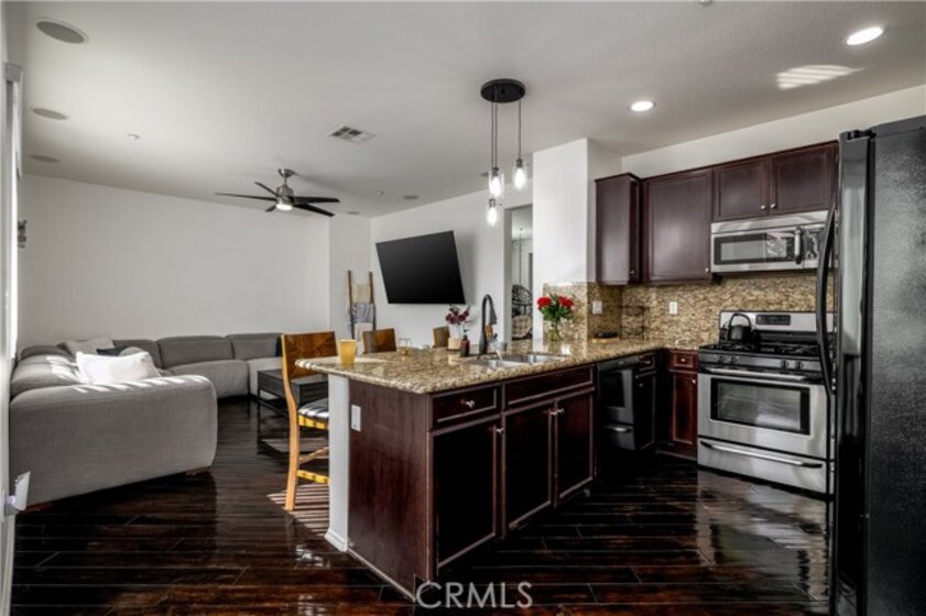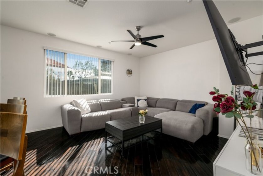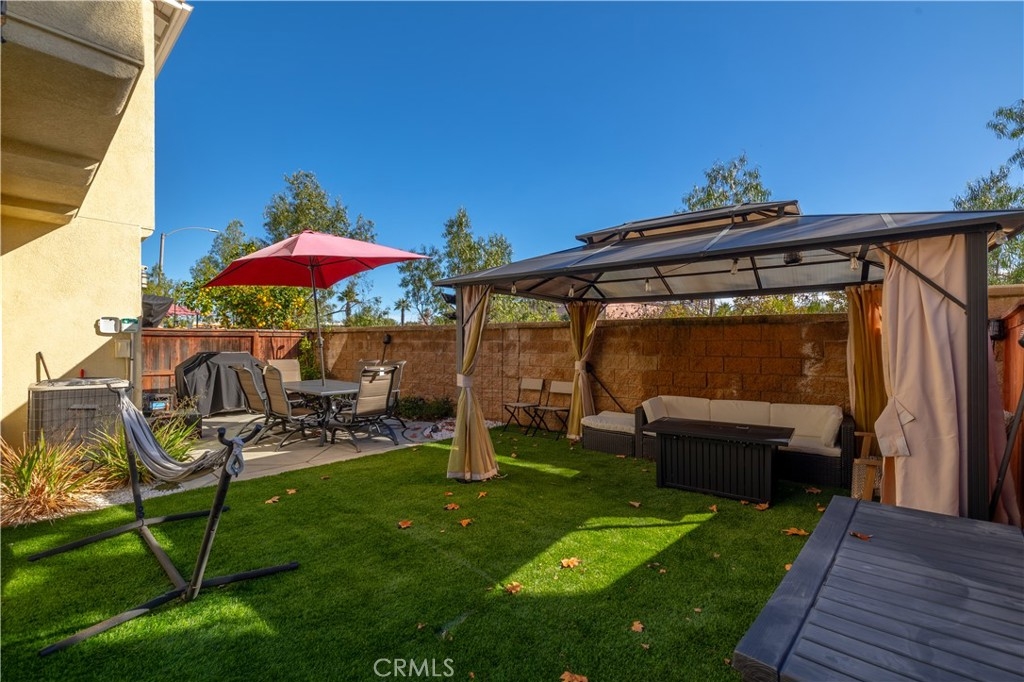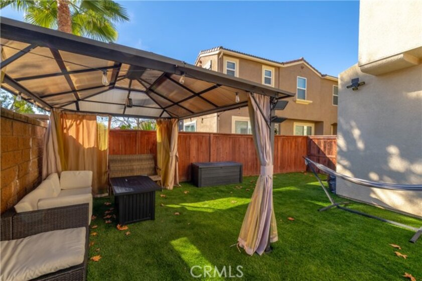 FHA/VA Approved! 3 BED, 2.5 BATH CONDO. Featuring PRIVATE ENTRY and an ATTACHED 2-CAR GARAGE, creating the feel of a standalone residence. SOLAR and BACK-UP BATTERY perfect for Electric Vehicles! CLOSE to FREEWAY, SHOPPING and SCHOOLS. The main level welcomes you with a formal entry and living space, highlighted by wood flooring throughout. Just off the kitchen, the spacious family room is perfect for relaxing or entertaining. The kitchen is thoughtfully designed with granite countertops, rich dark cabinetry, and ample storage, while abundant natural light pours in from the backyard, creating a bright and inviting atmosphere. Main level also includes laundry room and half bathroom with pedestal sink. Step outside to your private backyard oasis, complete with artificial turf, a concrete patio, and a gazebo included for shade—ideal for outdoor dining, playtime, or unwinding after a long day. Upstairs, the primary suite offers a peaceful retreat with a private bathroom featuring dual sinks, a walk-in shower, and a walk-in closet. Down the hall, you’ll find two generously sized guest bedrooms and a full bathroom with a tub/shower combo, perfect for family or guests. Additional highlights include solar with a backup battery, providing excellent energy savings and efficiency. The community offers resort-style amenities, including a pool, park, and front yard maintenance covered by the HOA, making for low-maintenance living. Conveniently located just off the 215 freeway, this home is close to Costco, gas stations, Starbucks, Target, shopping, dining, and everyday essentials. Plus, highly regarded schools are within walking distance, making this an ideal place to call home. This move-in-ready condo checks all the boxes—location, efficiency, amenities, and style—don’t miss it!