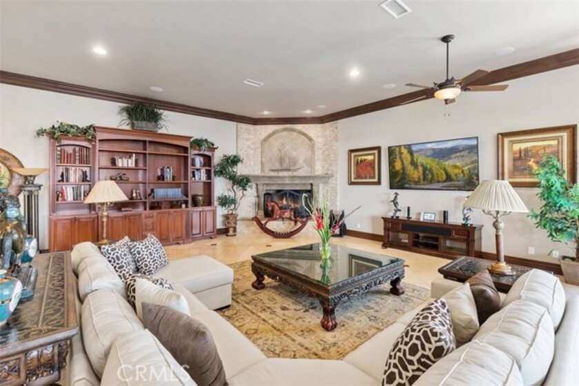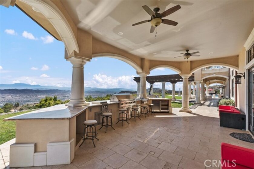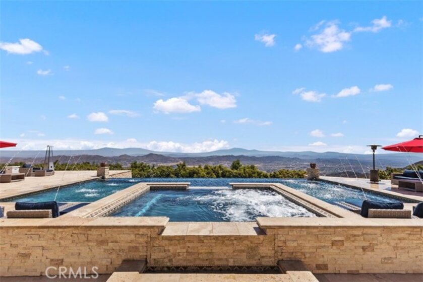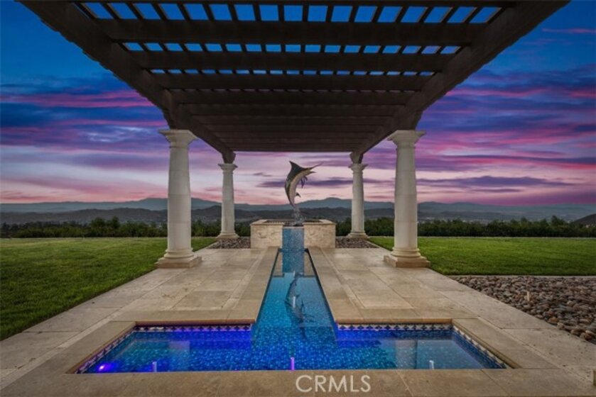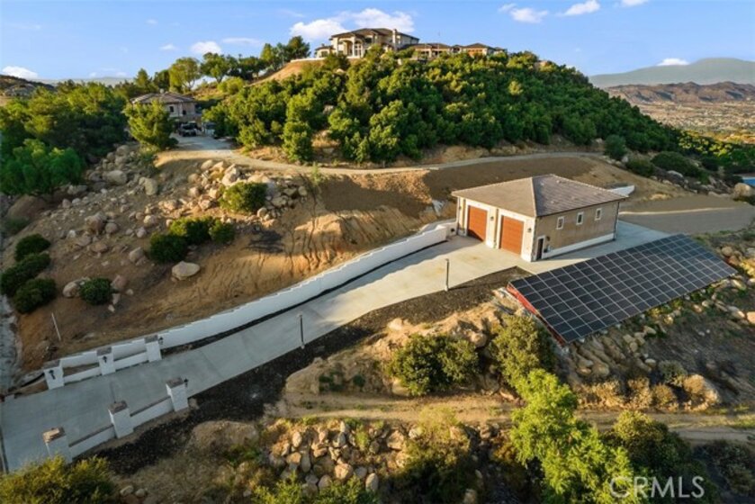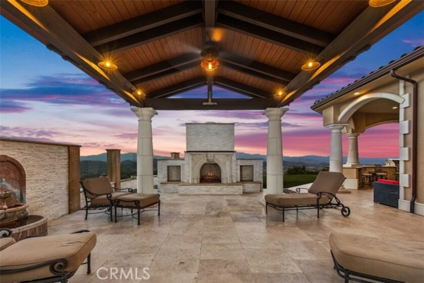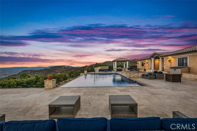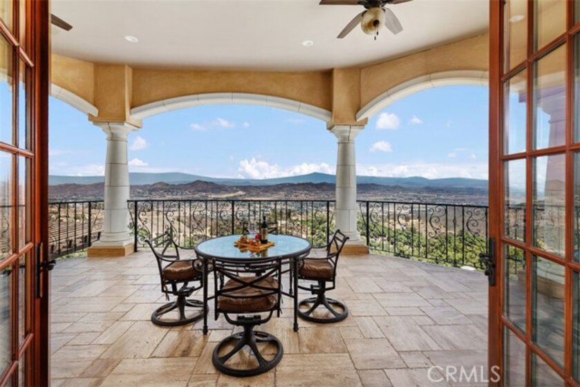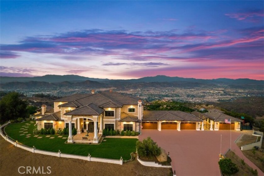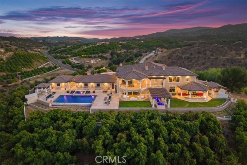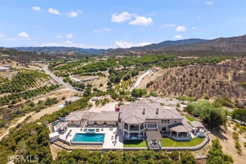 Welcome to Villa Dolce Vista. Commandingly positioned atop 20.39 ACRES at the north point of the EQUESTRIAN COMMUNITY of La Cresta, this Italian inspired masterpiece offers luxury amenities appreciated by the most discerning buyers. Impressive private GATED COMPOUND offers uninterrupted panoramic VIEWS of mountains, city lights, and the Temecula Valley. Encompassing nearly 14,000 SF, the resplendent home includes 5 EN-SUITE BEDROOMS, 8 BATHROOMS, a grand foyer with DUAL STAIRCASES and 24’ ceiling, elegant wood paneled STUDY, FORMAL DINING ROOM with fireplace and expansive city light view. Incredible CHEF’S KITCHEN includes a 20’ granite topped island, COPPER CEILING and LEDGER STONE WALLS. Extraordinary PRIMARY SUITE offers a FIREPLACE, BALCONY with staggering city light views, OPPULANT BATH with dual water closets, vanity areas, marble spa showers, and Jacuzzi tub. Massive GAME ROOM with full wet bar and access to the outdoor travertine deck with FOUNTAINS, INFINITY EDGE JEWEL SCAPE POOL AND SPA and two full outdoor BBQ kitchens. EIGHT CAR GARAGE with built in cabinetry. This SMART HOME is equipped with $155,000 in electronics that provides you with touch screen devices throughout the home. For extended family, a 1,777 SF SINGLE STORY 2 BEDROOM, 2 BATH BUNGALOW with two- 2 car attached garages. Energy efficient with a 47 KW 136 PANEL SOLAR SYSTEM powering both the main home and casita. 53’x40’ RV GARAGE totaling 2,120 SF for storage of two 45’ motorhomes plus all the toys. INCOME PRODUCING HAAS AVOCADO GROVE with automatic fertilization system and WELL watered with two 5000 gallon holding tanks. Additional building pad for future barn, tennis court or helipad. The La Cresta community is located mid-way between Orange County and San Diego County with convenient access to Ontario, San Diego, and John Wayne International Airport. This stunning estate is just minutes from the members only Bear Creek Golf Club offering a Jack Nicklaus designed golf course, tennis, and fine dining as well as the growing Temecula wine country.