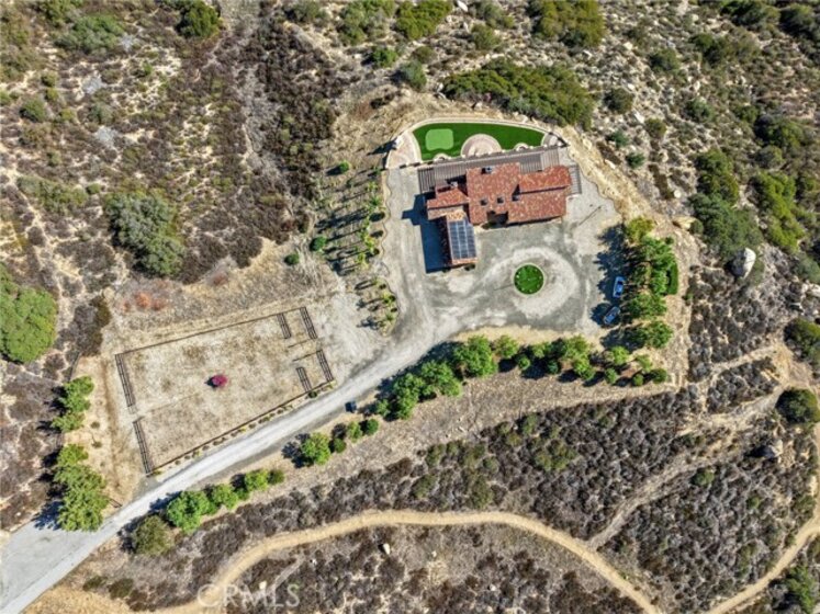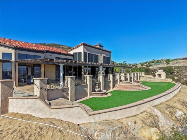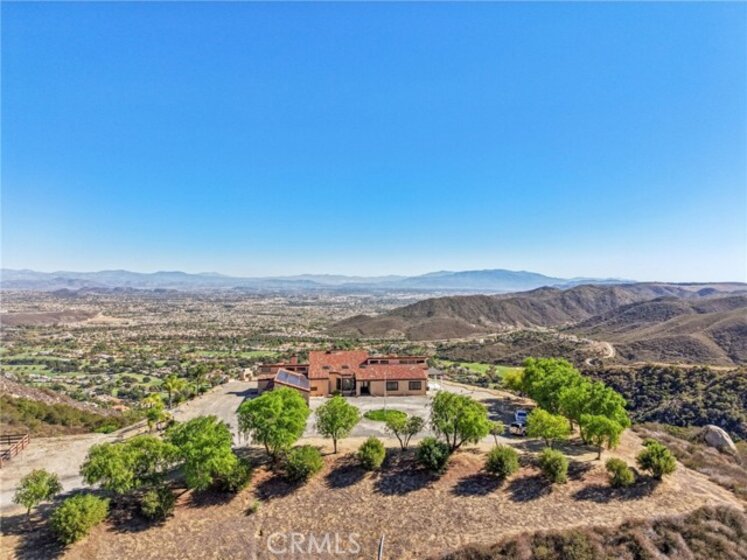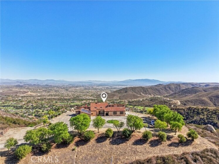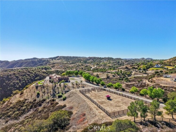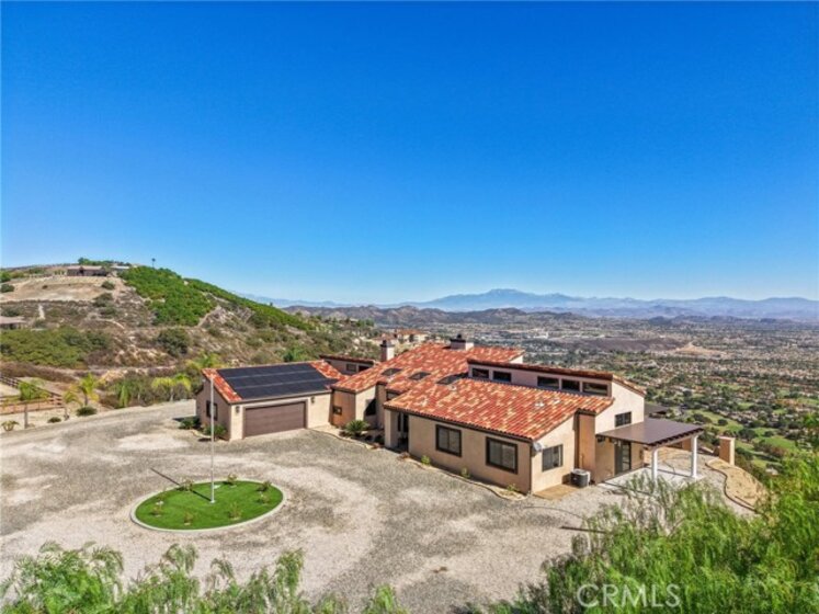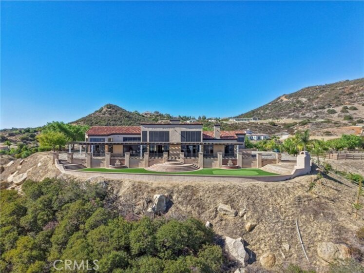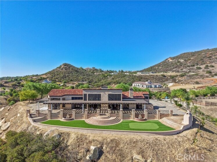 SINGLE-STORY LA CRESTA ESTATE on 10+ private acres with breathtaking panoramic views of the Bear Creek Golf Course, Santa Rosa Plateau, Temecula/Murrieta Valleys, Mount San Jacinto, and sparkling city lights. A private gated driveway sets a grand arrival to this serene, luxury retreat. Enjoy Semper Solaris solar backed up by two Tesla Powerwalls, plus 33 guava trees—including strawberry, white, lemon, and pineapple varieties—with room to expand your orchard or plant a vineyard. The expansive great room boasts dramatic ceilings, picture windows, and seamless indoor–outdoor living. The entertainer’s kitchen showcases an 18-ft granite island, premium appliances, two sinks, two stovetops, two microwaves, and two dishwashers, with elegant custom cabinetry and abundant storage. Flexible layout with 4 bedrooms plus formal dining/office, and potential for a separate-entry suite. The spa-inspired primary bath features a luxurious double walk-in shower. The bedrooms feature upgraded porcelain tile flooring, combining style, comfort, and easy maintenance. Recent upgrades include new skylights, new roof underlayment, exterior re-stucco and paint, replaced capstones on the terraces, new patio with architectural pillars and an Elitewood Ultra heavy-duty cover with Kynar 500 coating, and new outdoor lighting fixtures. Outdoor living spans over 5,000 sq. ft. of terraced space with an outdoor fireplace, putting green and flag area with AstroTurf, and ample parking for guests and vehicles. The property is horse-ready with stalls, arena, and access to extensive horse trails, plus space for a barn, guest house, or other amenities. Additional features include two heating and cooling units for zoned comfort. Luxury, privacy, usable land, and unforgettable views—this rare La Cresta estate combines elegant living with the natural beauty of Southern California.