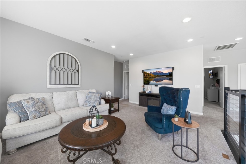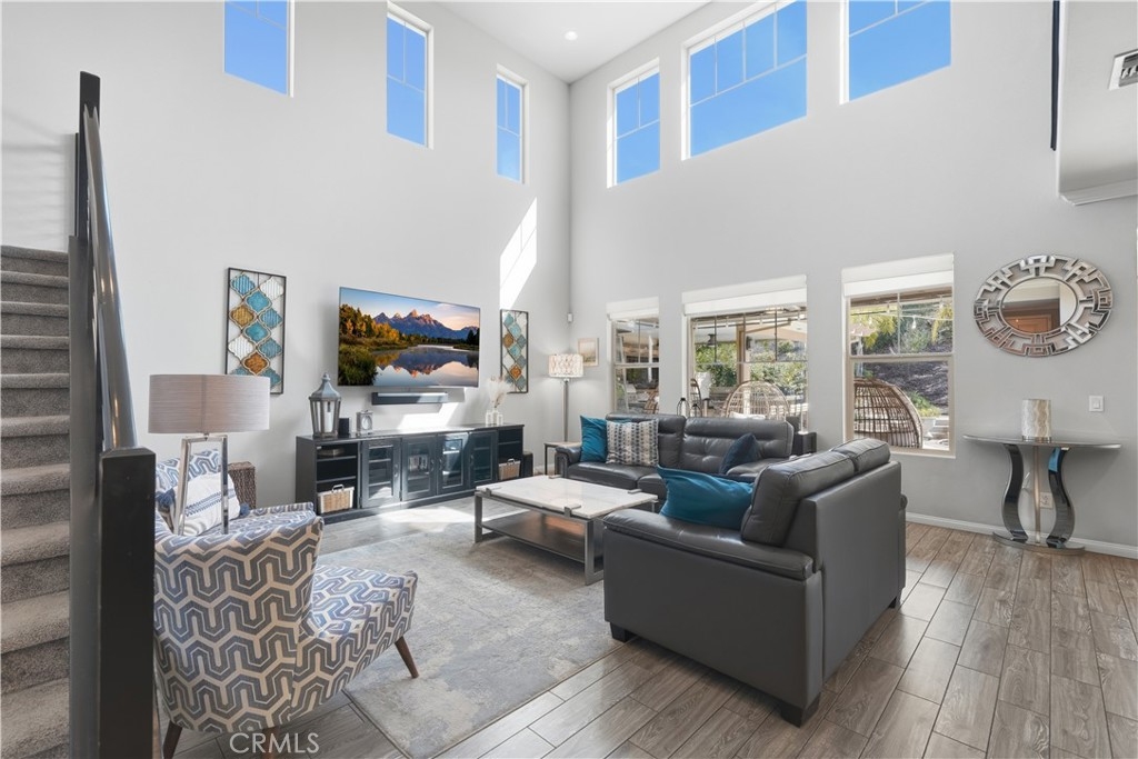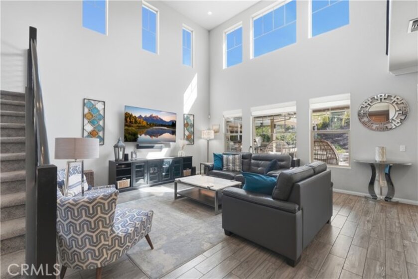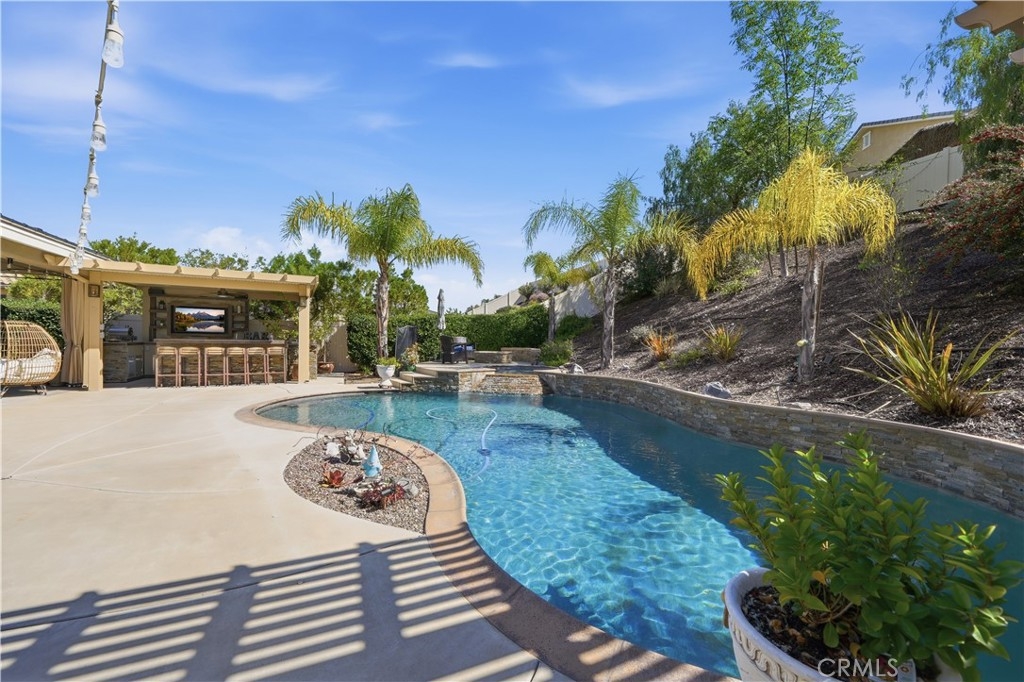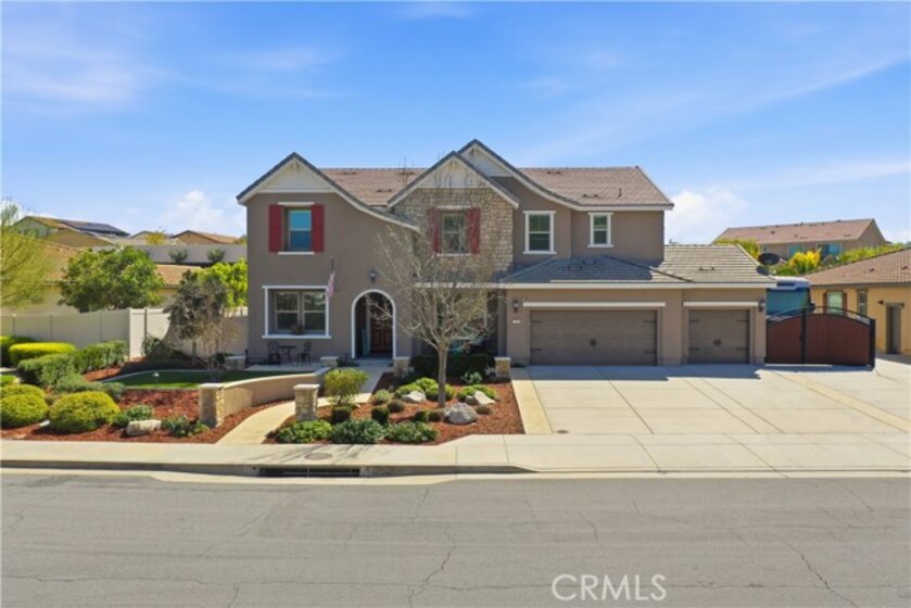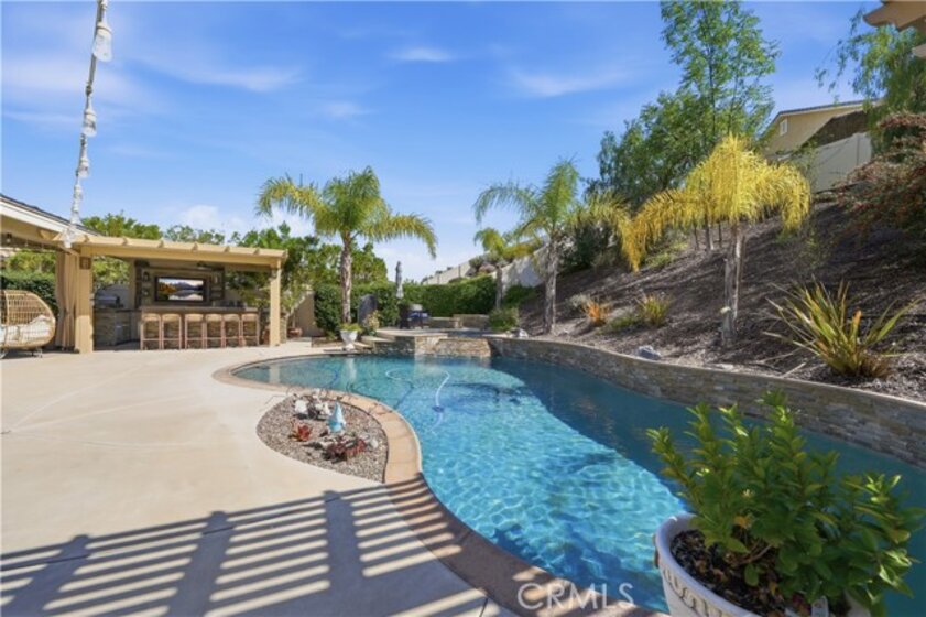 This Stunning Meadowlark 4 Bedroom 4 Bathroom Pool Home with RV parking has it all, Enter and Enjoy! Once inside, you will pass an office or optional 5th bedroom, half bath, and formal dining room. Next, walk into your spectacular great room with vaulted ceilings that looks out to your private Entertainer’s backyard. The beautiful kitchen is open and bright with double ovens, quartz counters, and pantry. Downstairs, there is also a large laundry room, workspace area, and mudroom. Walking upstairs, hold on to the Modern railing and enter the loft that overlooks the great room. Next, you will find 4 bedrooms including the primary. The spacious primary bedroom has a retreat, closet has built-ins and the bathroom has dual sinks with separate shower and tub. In addition there is a shared bathroom between 2 bedrooms and 4th bedroom has an adjacent bathroom as well. The Private Backyard Oasis is a real WOW moment with a magnificent covered outdoor stacked stone kitchen complete with gas griddle, BBQ, fan, fridge, sink, and outdoor TV. Saltwater pool and spa is upgraded with remote controls, solar, pebble tec, and stacked stone. Add to that a gas fire pit, solid patio cover with fans, pergola and grass area with a playset. The 3 car garage has an epoxy floor and cabinets. Full size RV parking has all hook ups and drainage. Upgrades include whole house reverse osmosis water filtration system, 2 Tesla Batteries, solar, new electrical panel, new paint, and new RV Gate! Award winning schools, close to Temecula Wine Country and No HOA!