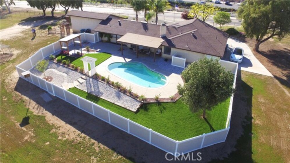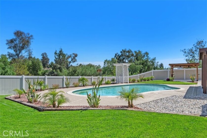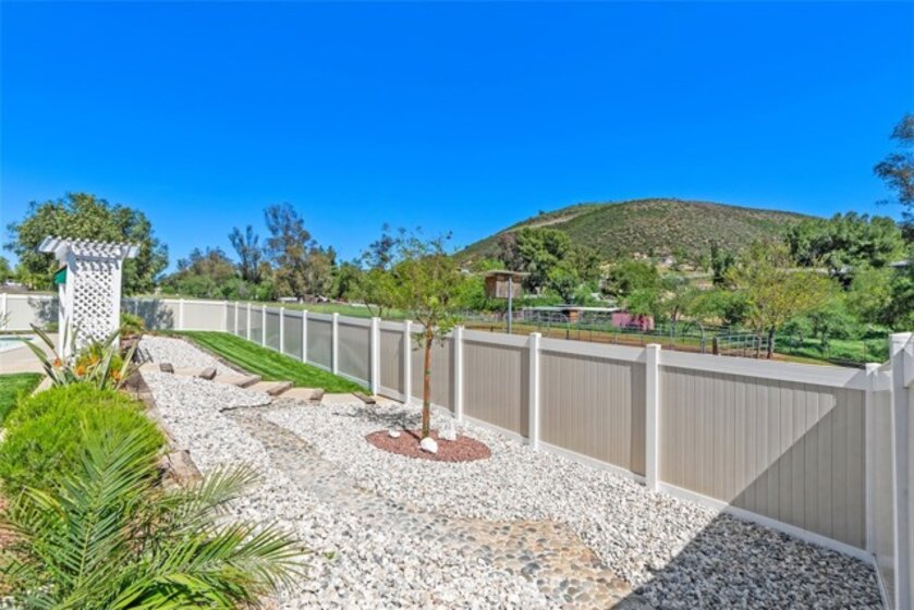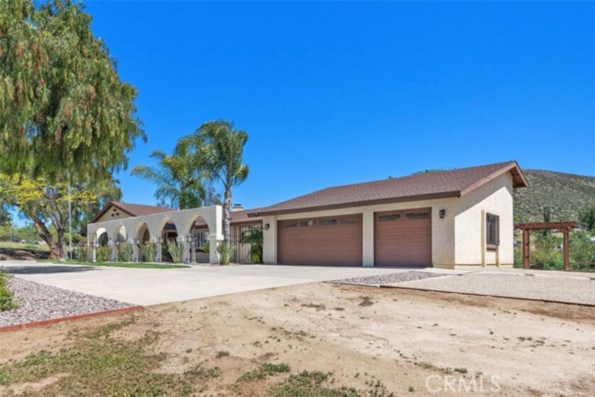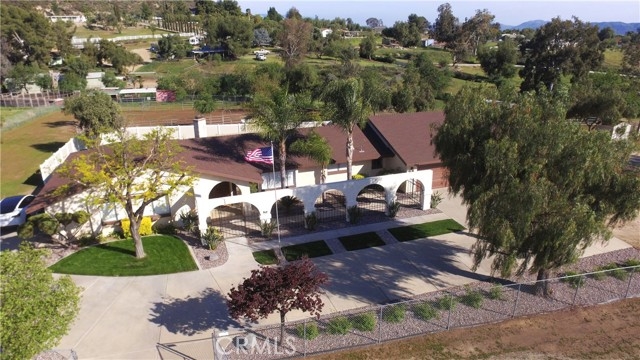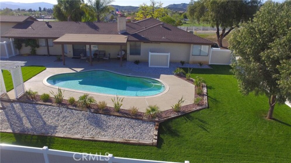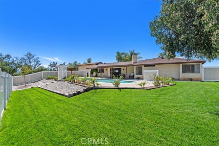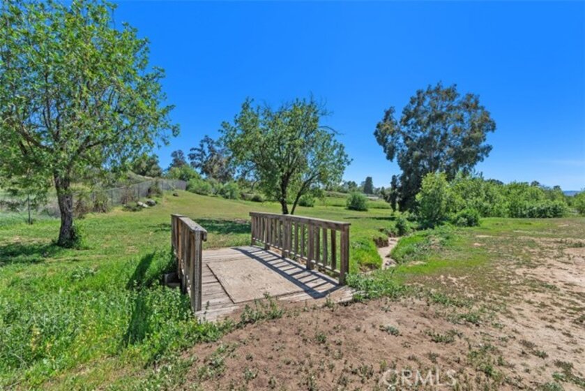 Welcome to this exceptional Murrieta estate—a custom single-story oasis set on 3.26 acres of peaceful, well-maintained land that offers the perfect blend of natural beauty, usable space, and a lifestyle designed for both relaxation and recreation. This meticulously remodeled single-story home offers a harmonious blend of modern luxury and serene country living. The open-concept design is accentuated by a stunning tongue-and-groove wood beam ceiling and a floor to ceiling stone fireplace in the living room that adds warmth and natural beauty to the space, bench window seating, new stainless steel appliances, granite countertops and high-end finishes chosen with impeccable taste. Freshly painted and thoughtfully upgraded, the home features luxury vinyl flooring, soft carpet in the bedrooms, new baseboards throughout. Featuring 3 spacious bedrooms and 2.5 nicely updated bathrooms. The bedrooms are oversized, including a luxurious primary suite with a generous walk-in closet. Both full bathrooms feature double sink vanities. New window coverings are installed throughout the home for a clean, finished look. Step outside to your private backyard paradise, professionally landscaped to perfection. Dive into the sparkling swimming pool, relax under the patio, or cook under the stylish cabana and entertain guests in this idyllic setting. The backyard is beautifully enclosed with vinyl fencing, creating a safe and private outdoor sanctuary. The entire 3.26-acre property is surrounded by secure chain-link fencing, providing peace of mind and space for RVs, boats, trailers, and all your recreational toys. A three-car garage and storage shed add convenience and flexibility. Equestrian enthusiasts will appreciate the riding arena and pipe corrals, offering plenty of room for horses and the potential to expand. A charming seasonal creek meanders through the property, complete with a bridge crossing, and is adorned with mature walnut, pepper, and eucalyptus trees, creating a tranquil and shaded environment. All landscaping is on a water-efficient drip system, including an automatic setup for the yards. Close to parks and located in the highly-rated Murrieta Valley Unified School District. With ADU potential, serviced by a private well with optional city water connection available, no HOA, and close proximity to shopping, restaurants, and hospitals, this Murrieta gem has it all.