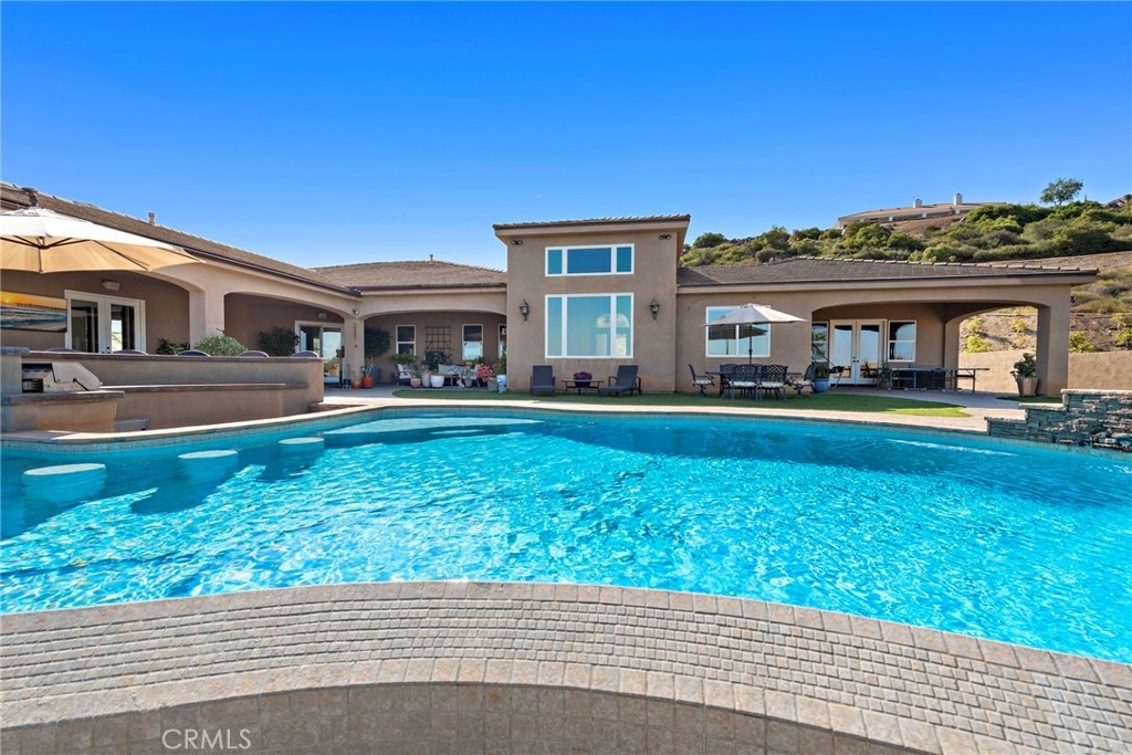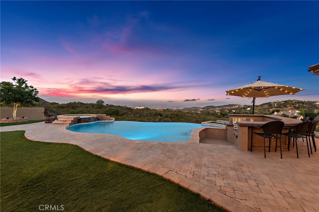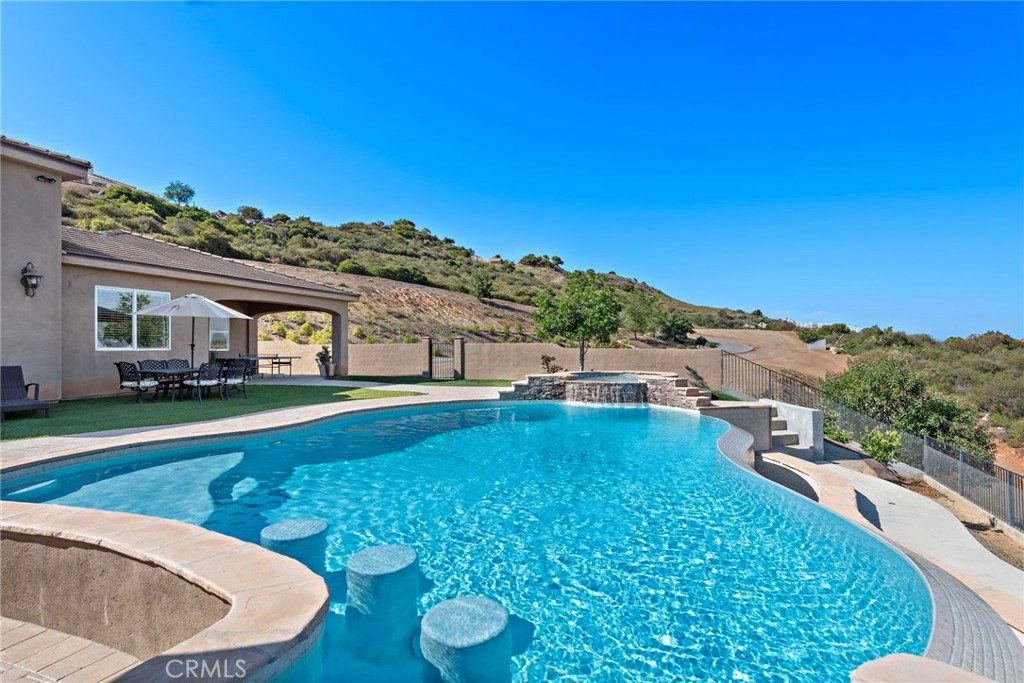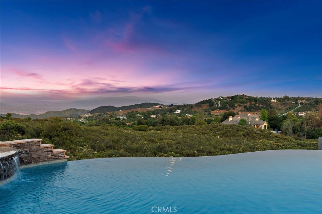 Welcome to 38150 Vía Huerta, a private, resort-style retreat nestled in the sought-after La Cresta community of Murrieta. Situated on 5 pristine acres with panoramic views of the mountains and city lights, this exceptional horse property offers the perfect blend of luxury, comfort, and functionality. From the moment you arrive, a gated entry and long, scenic driveway set the tone for the peaceful elegance that awaits. Inside, the home is filled with natural light and soaring ceilings that create a spacious, airy feel. Large picture windows frame breathtaking views and invite the outdoors in, while thoughtfully designed living spaces provide the ideal setting for both relaxation and entertaining. Inside, the oversized primary suite is a sanctuary of its own, complete with French doors opening directly to the pool and spa, and a spa-like bathroom with travertine finishes and dual vanities. A dedicated office and spacious guest bedrooms make this home as practical as it is beautiful. Step outside and you’ll find a true backyard oasis—an infinity-edge pool with waterfall features, a private spa, and a built-in BBQ area that’s perfect for gathering with family and friends. The covered patio and porch offer year-round comfort and are ideal for enjoying golden hour views over the valley. Equestrians will appreciate the 4-stall mare motel, corral, and miles of nearby horse trails. The property also includes a chicken coop, greenhouse, and an additional pad ready for fruit trees, a barn, or even a guest house. With 7 garage spaces, there’s no shortage of room for toys, tools, or a car collection. Whether you’re an entertainer, a hobby farmer, a horse lover, or simply looking for space to breathe, this one-of-a-kind estate offers it all.