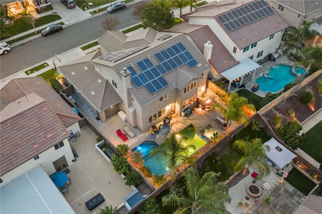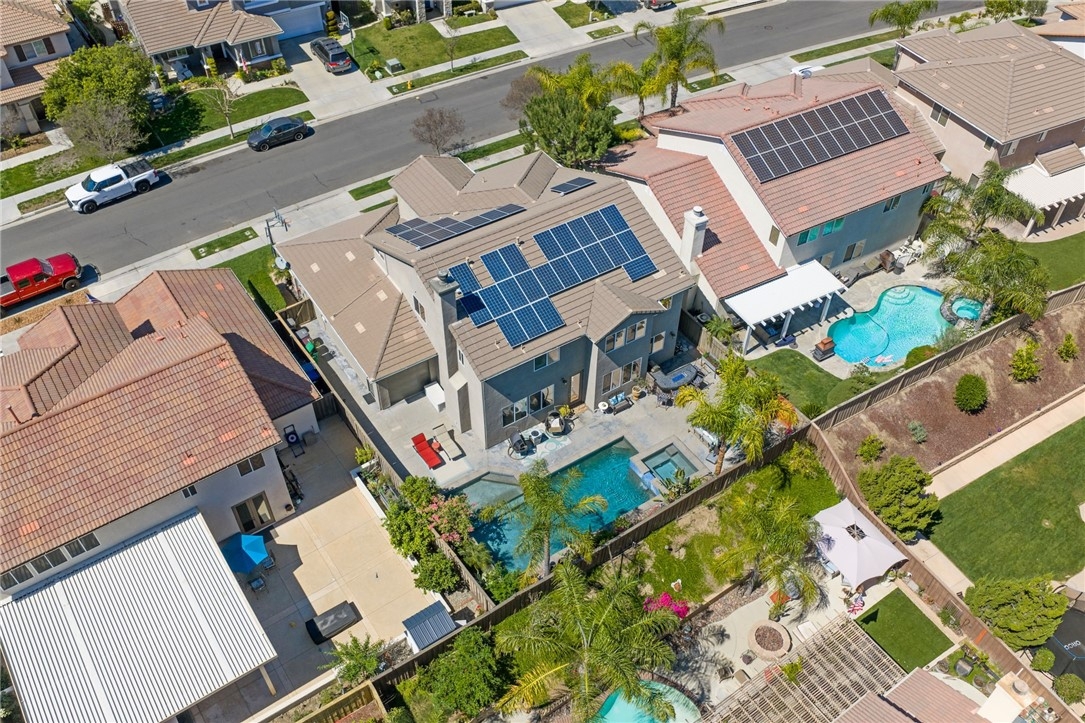 Welcome to this stunning pool home in the highly sought-after Copper Canyon neighborhood of West Murrieta, offering space, upgrades, and lifestyle with NO HOA and low taxes. Featuring 4 bedrooms, 3 bathrooms, and approximately 3,287 sq. ft., this beautifully maintained home also includes a rare 4-car garage with backyard pull-through access and solar for energy efficiency. Charming curb appeal welcomes you with a quaint koi pond (fish included) and inviting entry. Inside, the spacious floor plan offers a formal living room, dining room, first-floor bedroom, and full bathroom, ideal for guests, an office or multigenerational living. The home opens to an open-concept kitchen and family room designed for everyday living and entertaining. The upgraded kitchen features a large granite island, double ovens, butler’s pantry, walk-in pantry, soft-close drawers, under-cabinet lighting, and a built-in storage bench overlooking the pool. The family room offers a cozy fireplace and welcoming gathering space. The main floor also includes additional storage and a laundry room. Upstairs, a spiral staircase leads to the expansive second level. The primary suite includes a window bench with backyard and mountain views, a spa-like bathroom, and a large walk-in closet. Two additional bedrooms and a full bathroom complete the upper level. A massive loft/movie room offers flexible space for a media room, gym, office, or potential additional bedroom, complete with in-wall speakers, receiver, and projector. The resort-style backyard features a saltwater PebbleTec pool with Baja step, spa, waterfall features, and color-changing lights. Enjoy outdoor entertaining with a BBQ island featuring a built-in fire pit tabletop and mini fridge, along with mature fruit trees including kumquat, pomegranates, lemons, and grapes. Additional features include basketball hoop, new screens, new water heater, dual AC units, EV charger, 220V in the garage (wired for infrared sauna), crown molding, recessed lighting, ceiling fans, window tinting, whole house fan, and front and rear screen sliders for summer breezes. The home also includes a solar PPA. Conveniently located near parks and about one mile from Cole Canyon Elementary, within top-rated Murrieta schools and just 20–30 minutes from Temecula Wine Country. This exceptional Copper Canyon home offers the perfect blend of space, upgrades, and resort-style living.