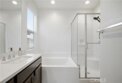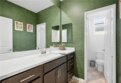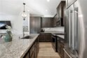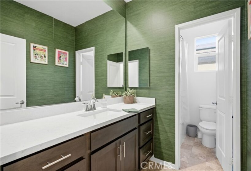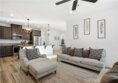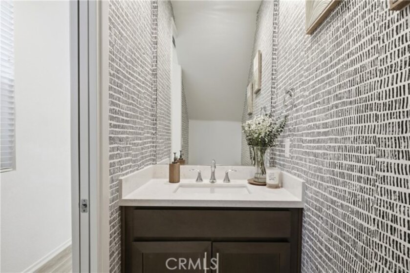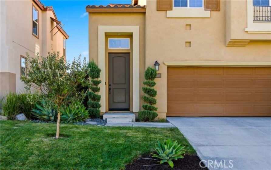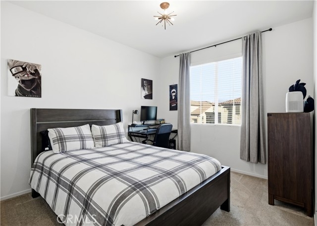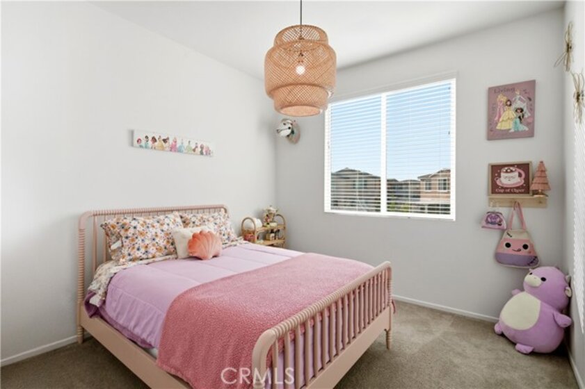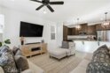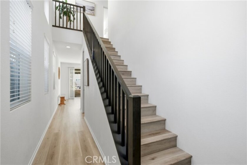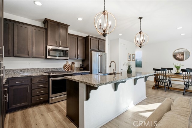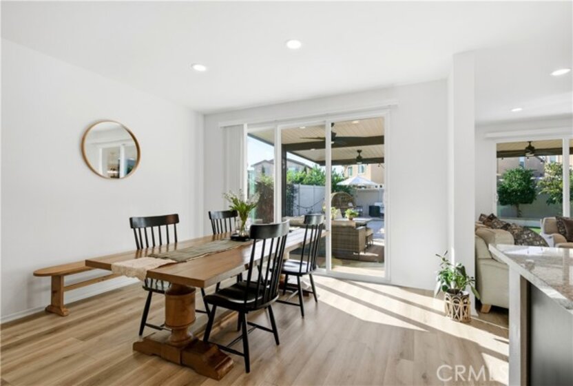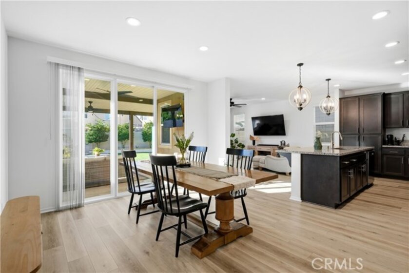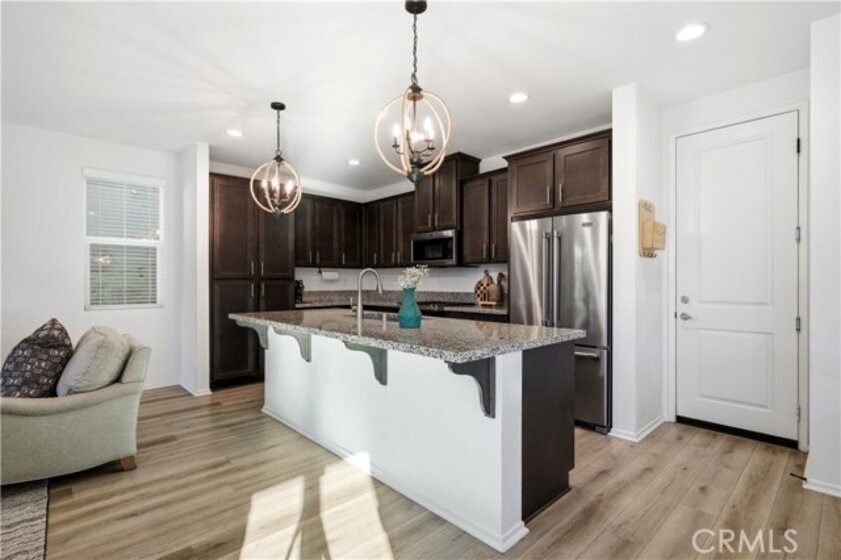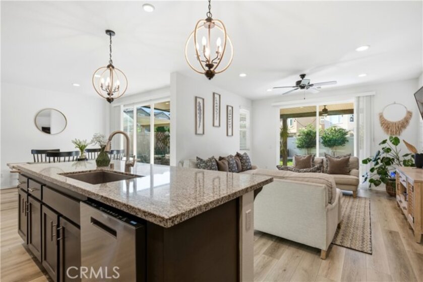 This move-in-ready home features an open floor plan, modern upgrades, and a low-maintenance outdoor living space. The kitchen includes espresso cabinetry, granite countertops, stainless-steel appliances, an oversized island with bar seating, and upgraded pendant lighting. The layout connects the kitchen, dining area, and living room, and includes an additional sliding glass door that increases natural light and access to the backyard. Interior upgrades include laminate flooring installed at purchase, updated light fixtures, a living room ceiling fan, and multiple TV mounts. The property is also equipped with 11 solar panels for improved energy efficiency. The second level offers spacious secondary bedrooms with large windows and ample closet space. The shared bathroom includes a dual-sink vanity with quartz counters and a separate shower and toilet room. The primary suite includes an ensuite bathroom with dual sinks, quartz countertops, and modern fixtures. An upstairs laundry room with a utility sink and storage cabinetry provides additional convenience. The backyard includes an aluminum patio cover with recessed lighting and ceiling fans, artificial turf, extended concrete work, a retaining wall, landscaping with trees, and a separate seating area with a firepit. The garage features a 240-volt electric vehicle charging outlet and overhead storage racks. Located within a well-maintained residential community with access to nearby parks, walking paths, shopping centers, schools, and commuter routes. This property provides a combination of functional upgrades and a flexible floor plan suitable for various living needs.